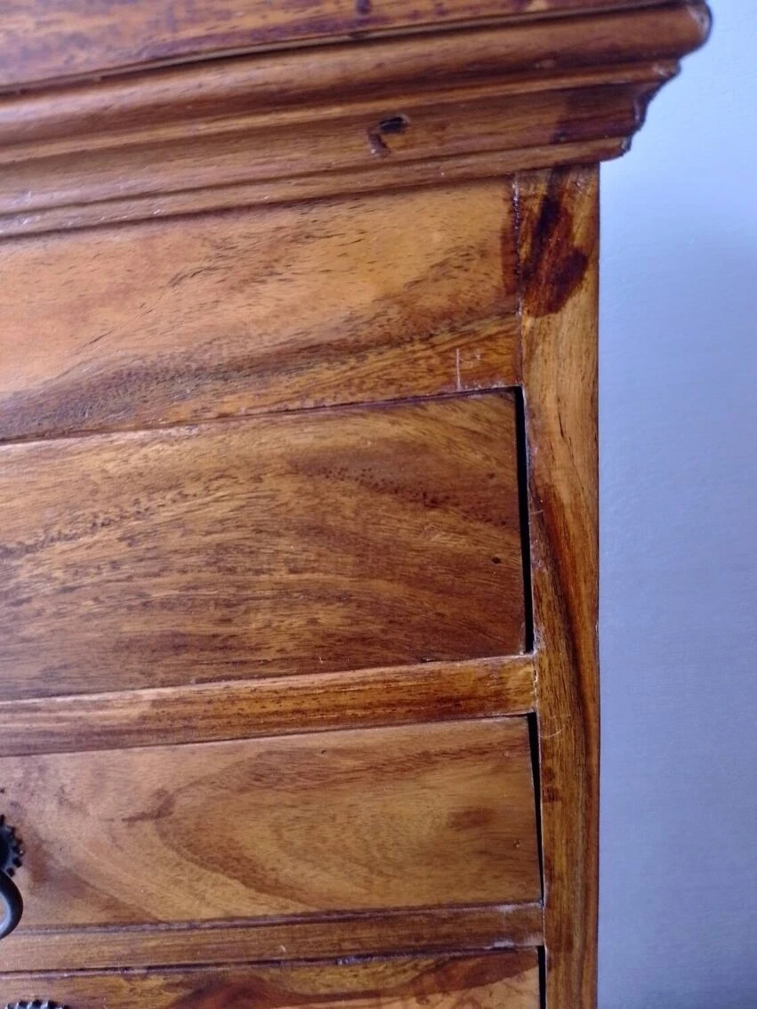 Furniture sanded to find the natural wood, then protected with a double layer of varnish.