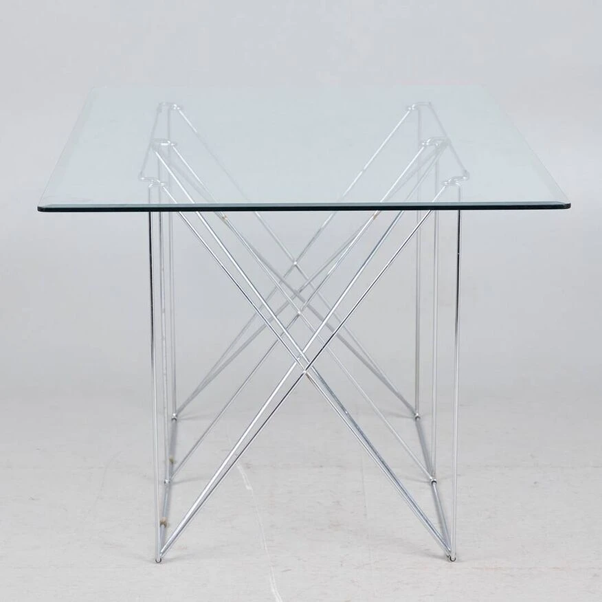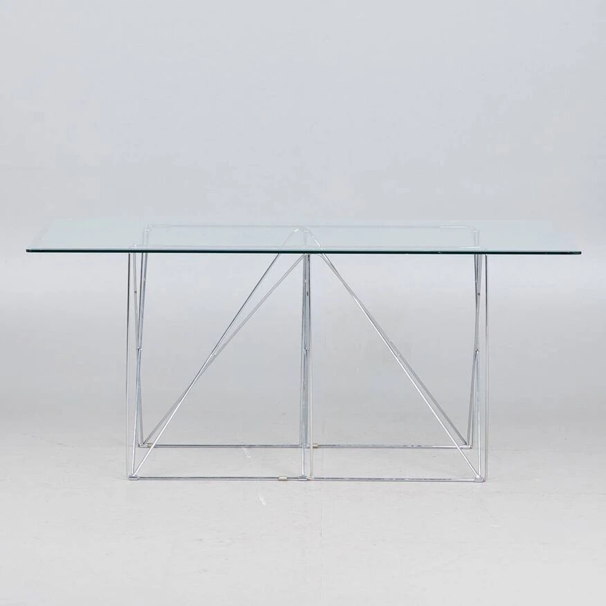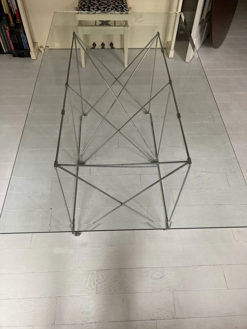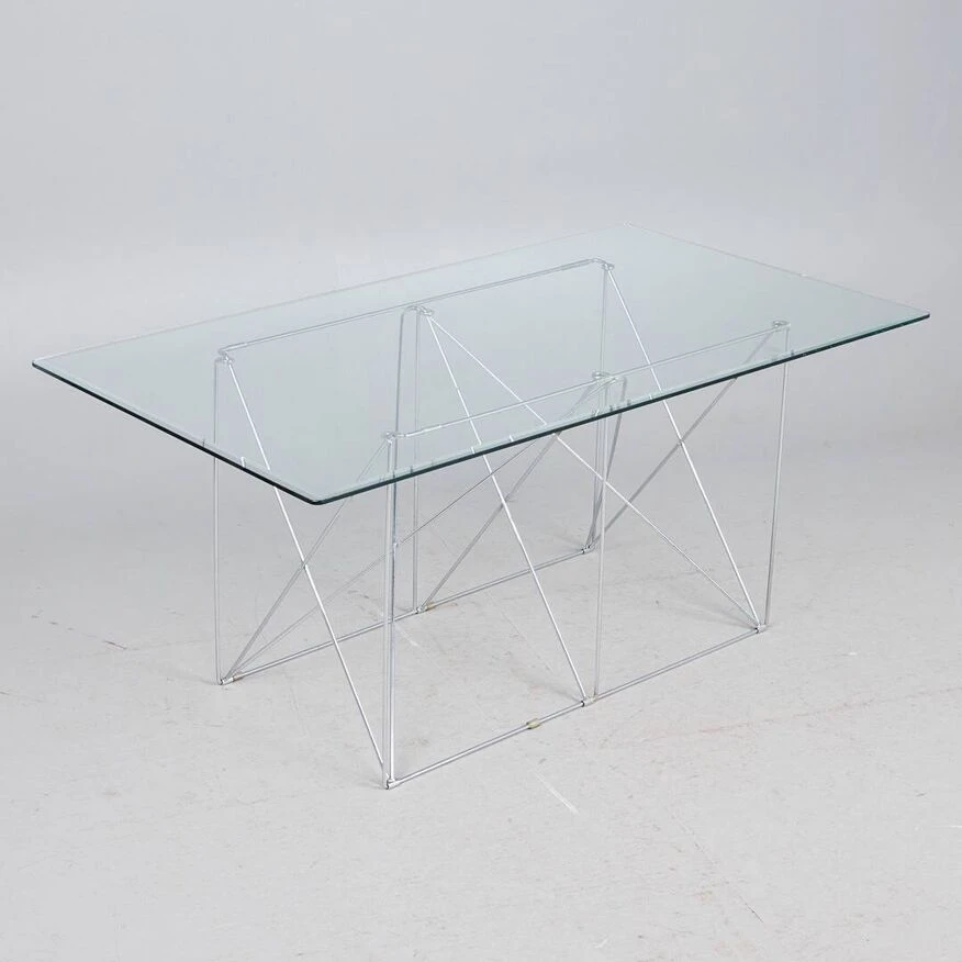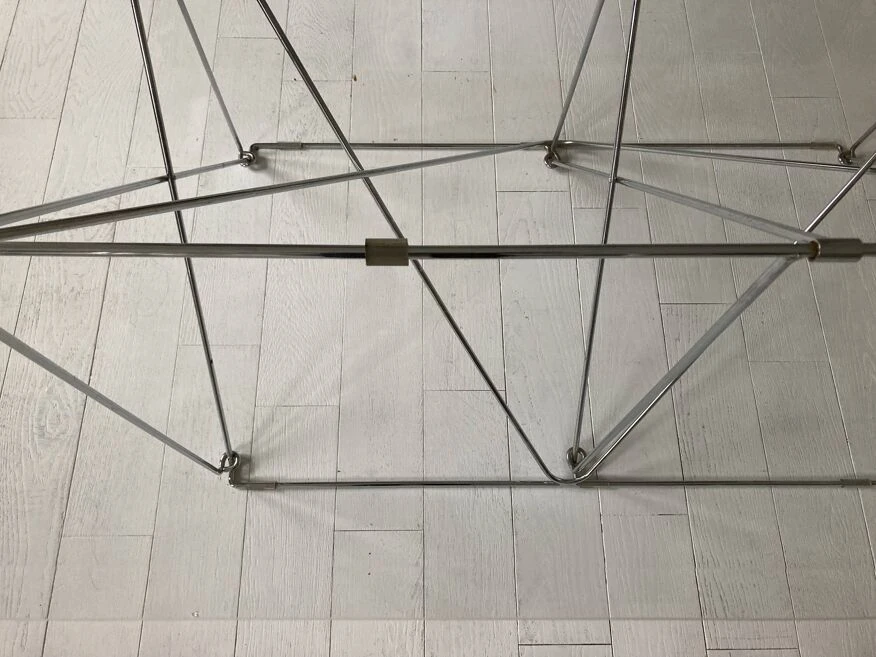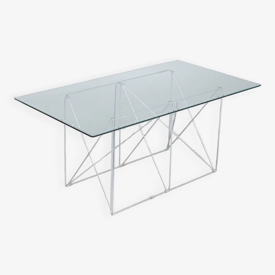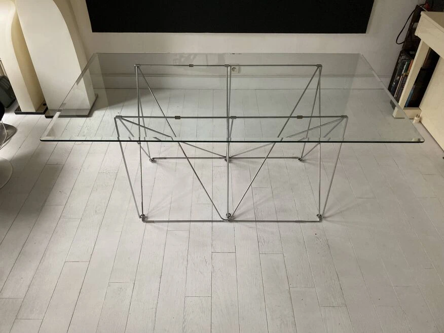 Max Sauze for Max Sauze Studio, dining table/table, steel wire, chrome, 1970s, France. Dining table with a chromed steel wire spacer base and a rectangular glass top with beveled edge, placed on plastic protections, H.71cm, L.160cm, L.88cm. Very good condition, some marks of use, a small shock on the edge of the tray, almost invisible. The table is delivered with a wooden protective box and packaged.