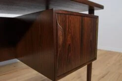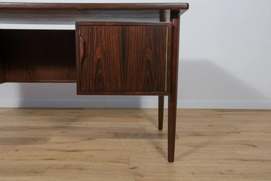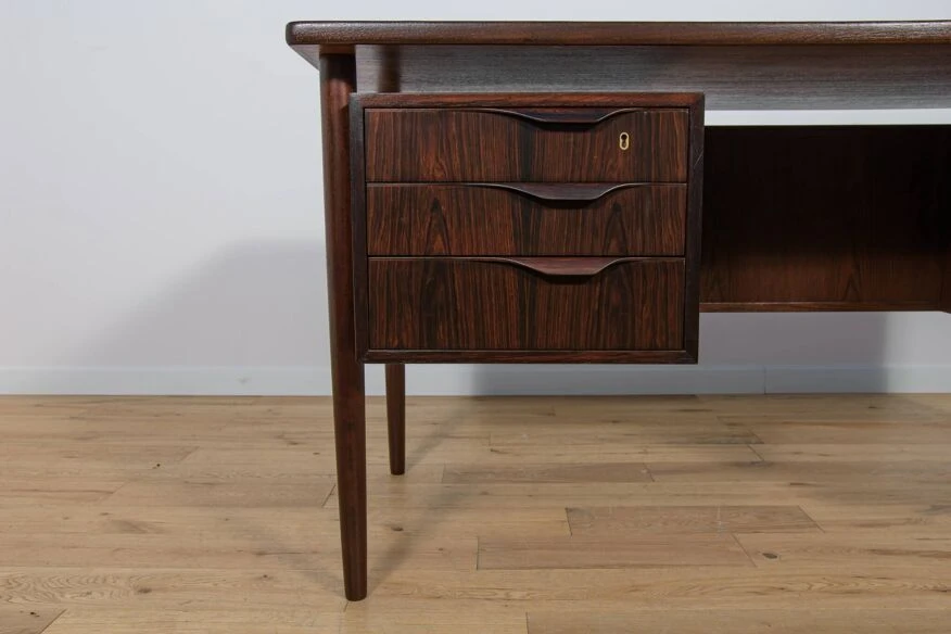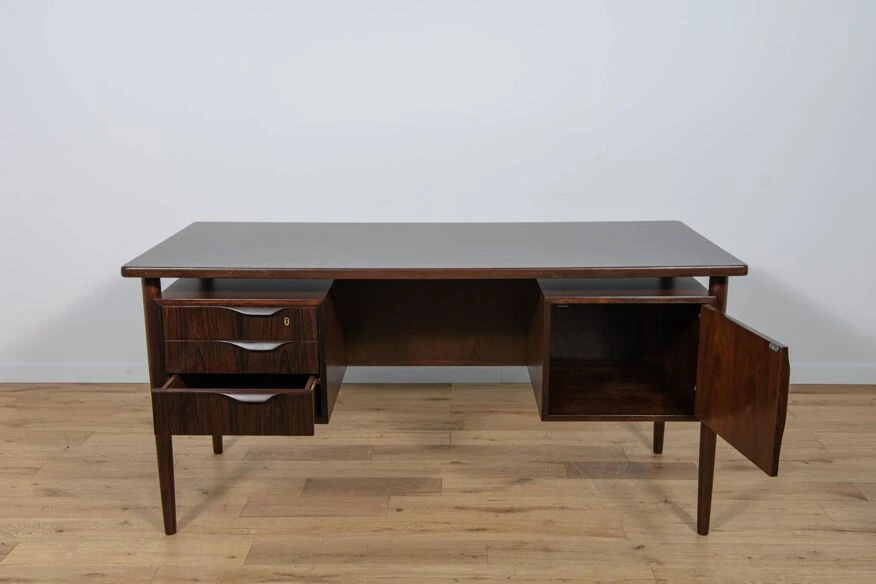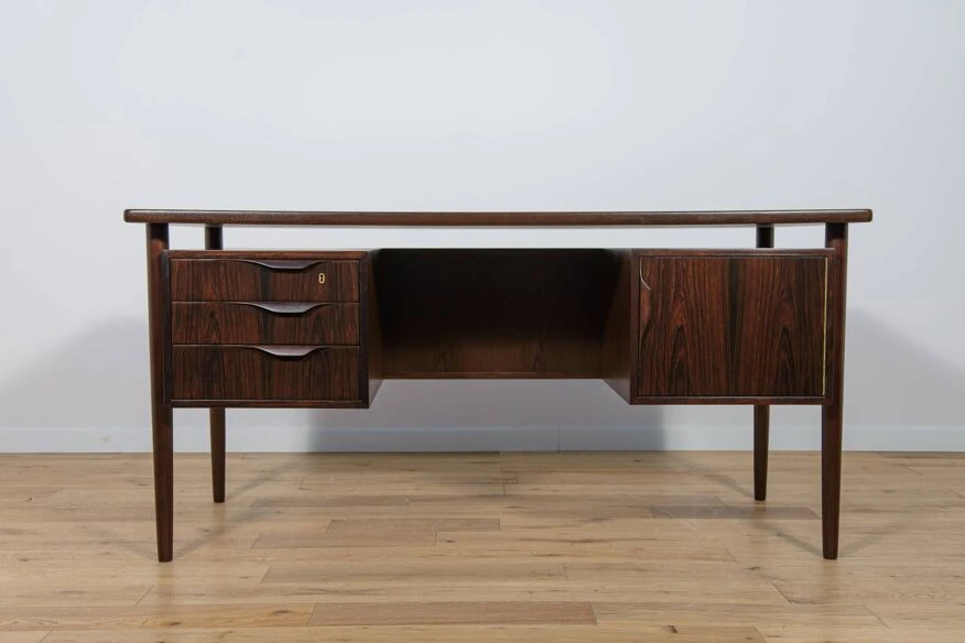 The free-standing desk consists of two modules, on the left side there are three drawers, and on the right side there is a document cabinet.