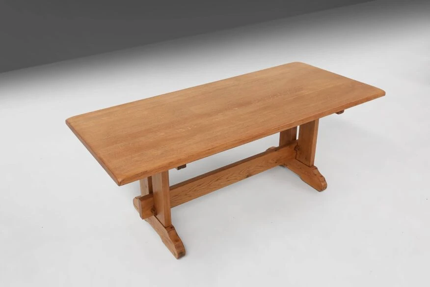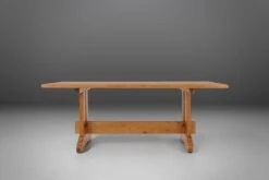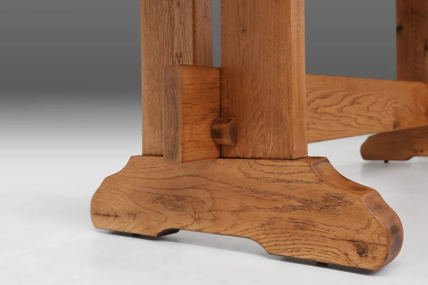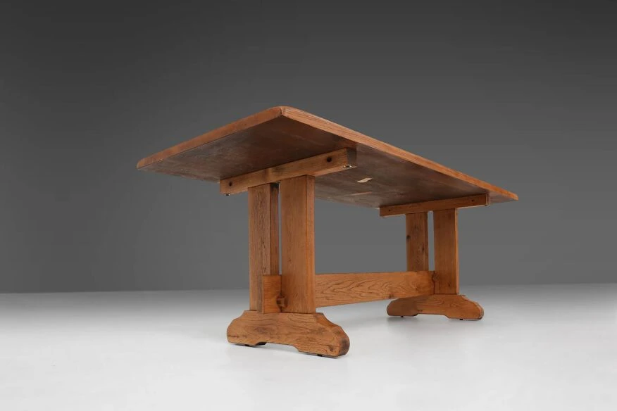 Standing proudly on two slender legs, this table exudes an air of grace and poise. The craftsmanship is unparalleled, with every curve and contour meticulously carved to perfection. The natural grain patterns dance gracefully, telling a story of nature’s own masterpiece. Whether it graces your dining room, study, or living area, this Mid-century oak table will effortlessly elevate the ambiance of any space, adding a touch of rustic charm and sophistication. Embrace the allure of French craftsmanship and indulge in the timeless beauty of this remarkable piece.