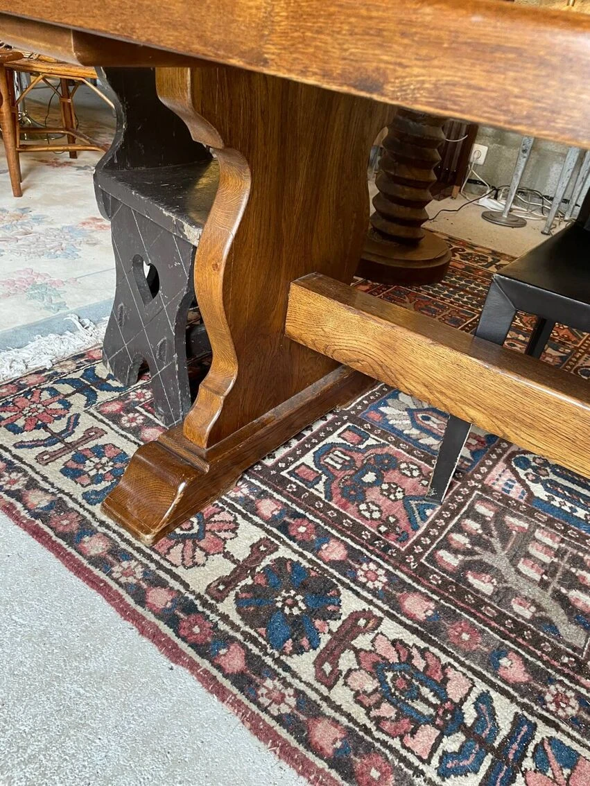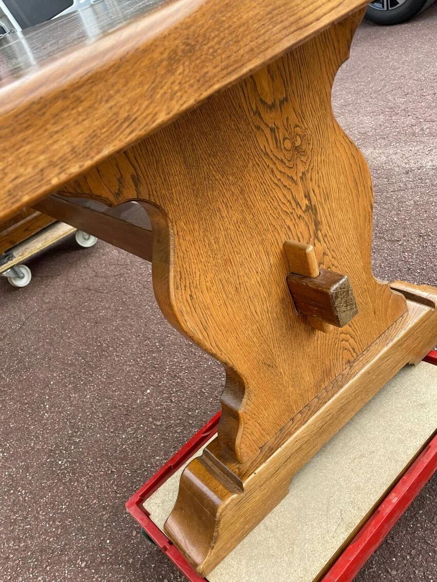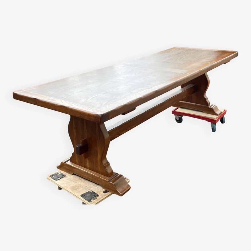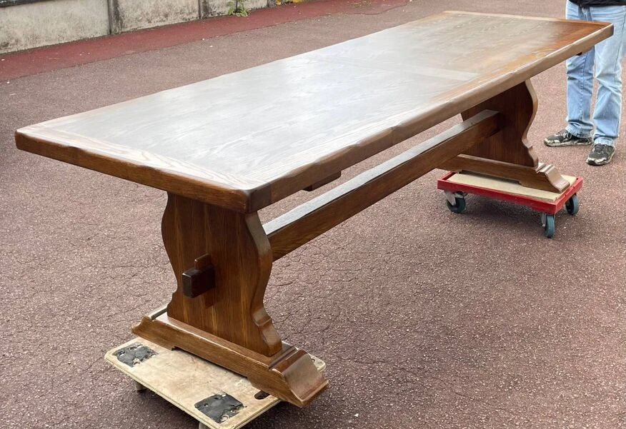 Large farm table called monastery. Solid oak table resting on 2 “skid” legs connected by a spacer called “cat bar”. Very good state of conservation consistent with its age.