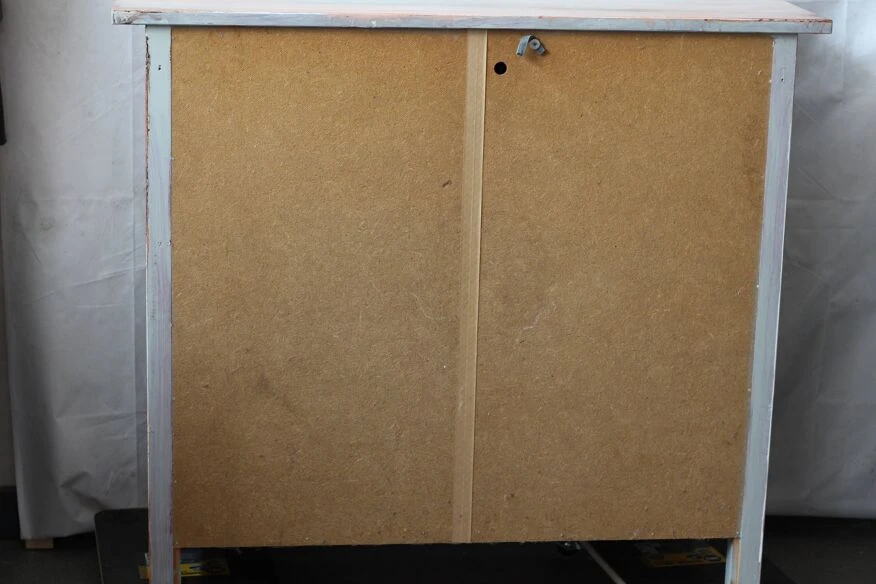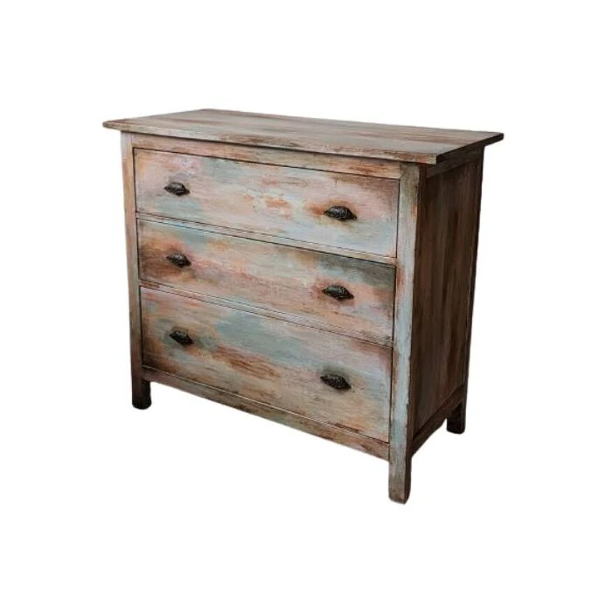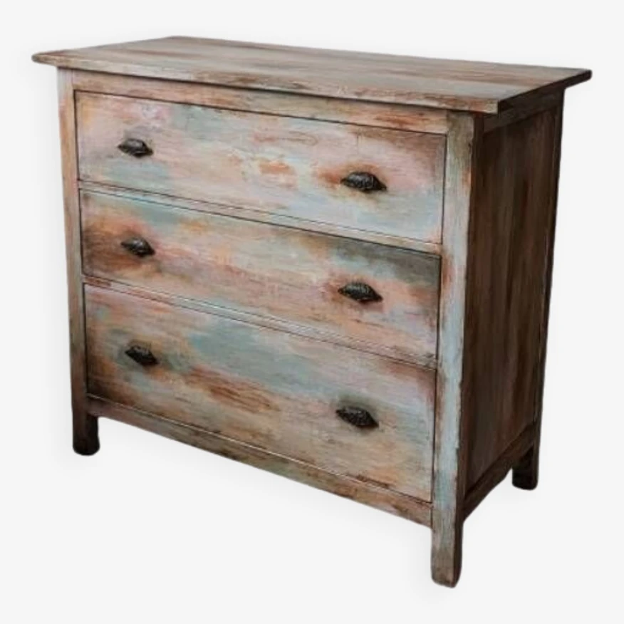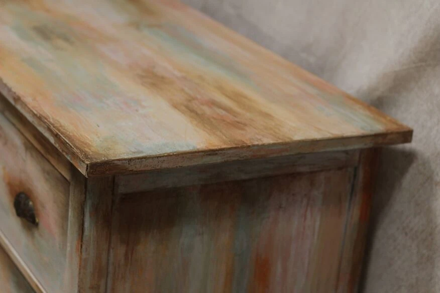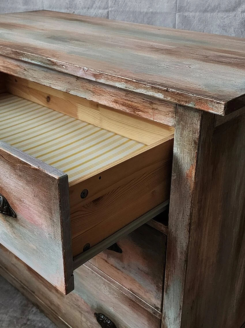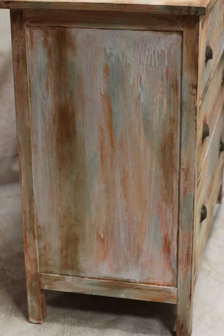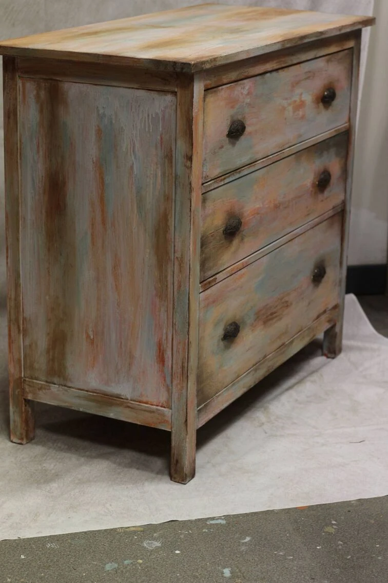 This chest of drawers has been weathered on a modern wooden chest of drawers.