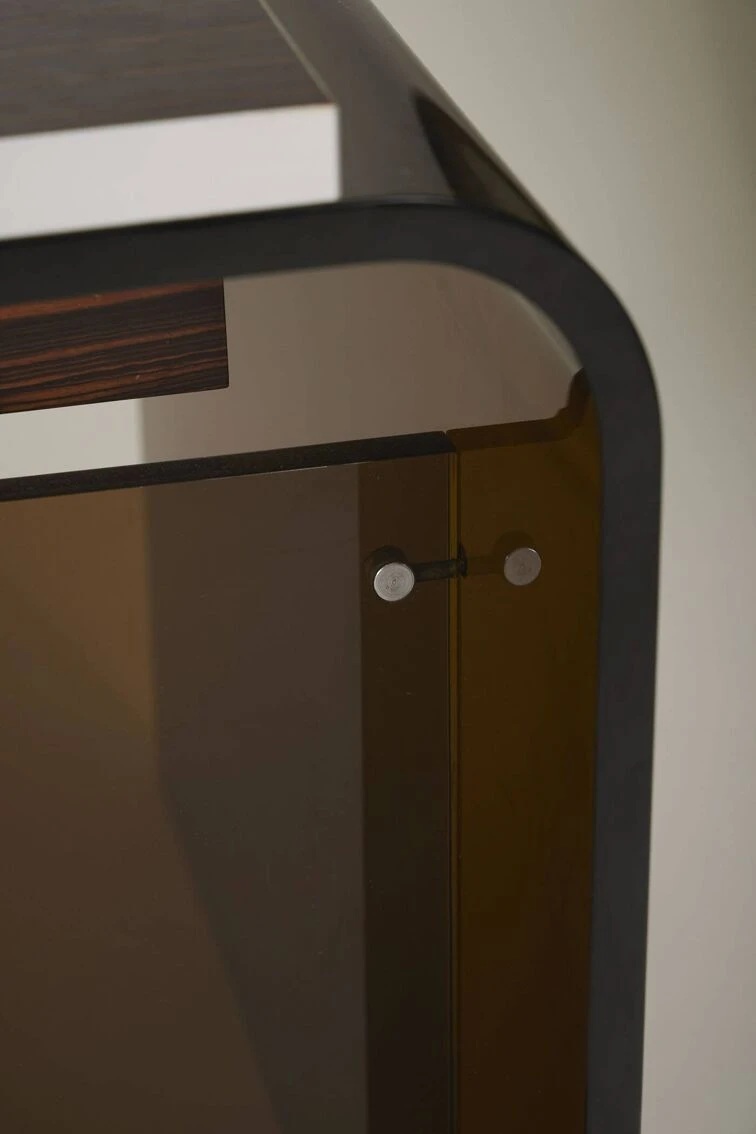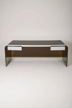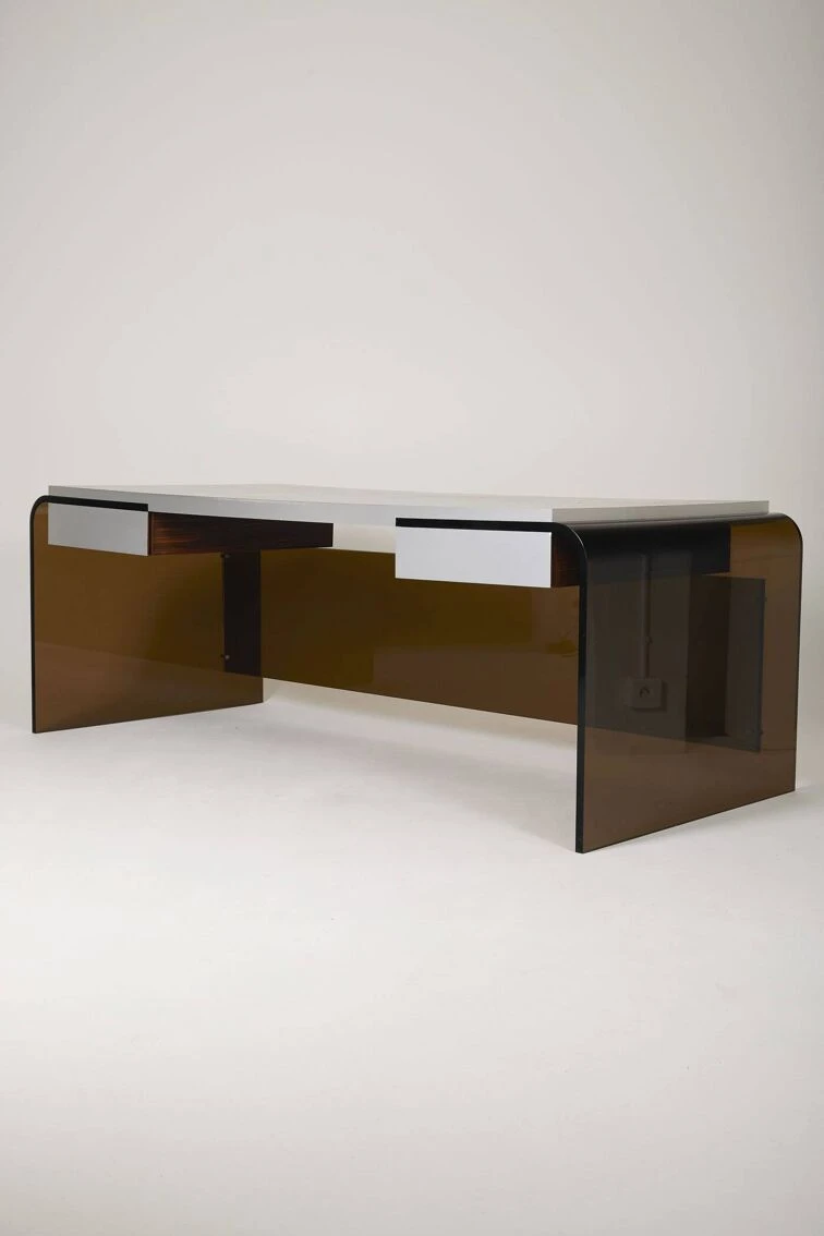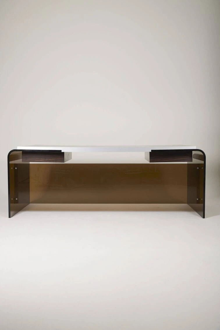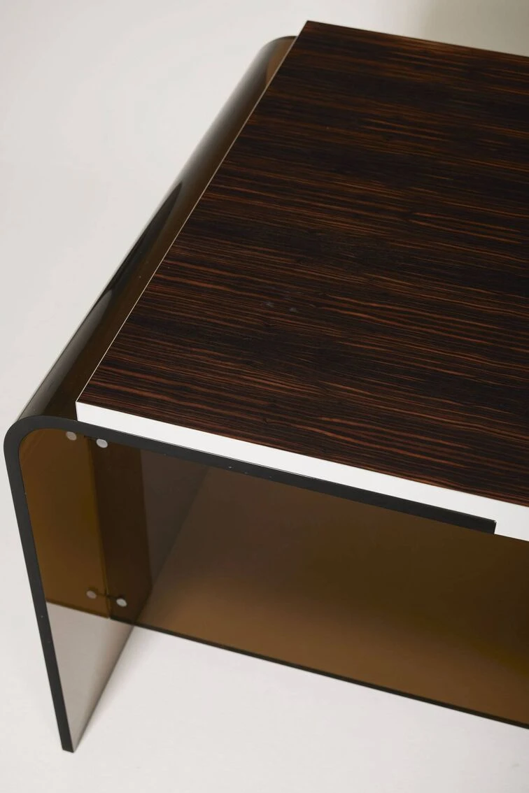 The top is in macassar ebony veneer with brushed steel details, the base is in smoked plexiglass.