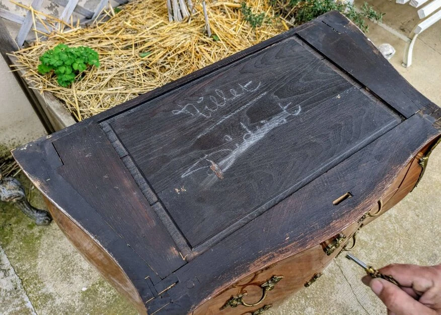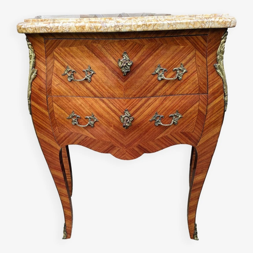 Elegant old curved chest of drawers, decorated with rosewood marquetry which gives it a timeless charm. It is topped with 3 cm thick marble, in perfect condition, adding a touch of sophistication to its appearance. Resting on four curved legs, the two located at the front are decorated with bronze decorations, bringing a refined finish to this piece. This charming chest of drawers is equipped with two drawers measuring 38 lw x 26 pf x 11 ht cm each, providing practical and stylish storage space. It should be noted that a very small chip is present on the border inside the top drawer. Overall dimensions of 63 long x 34 deep x 74 ht. FYI there is a smaller model on sale: 47 X 30.5 X 73ht.
