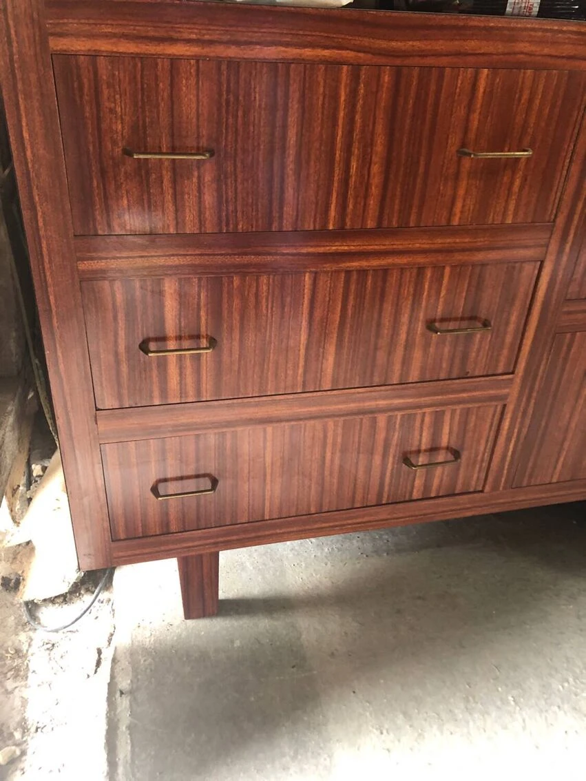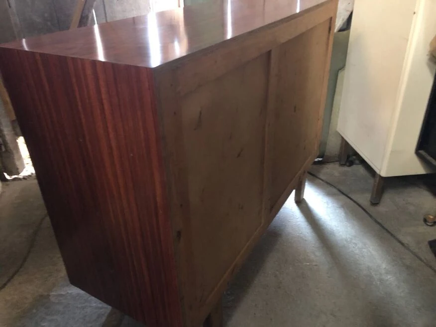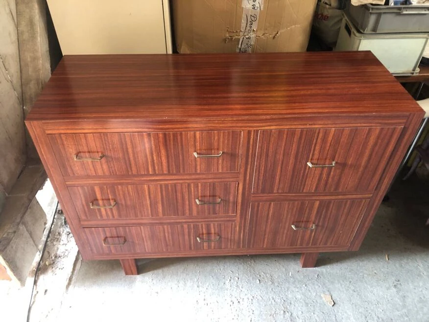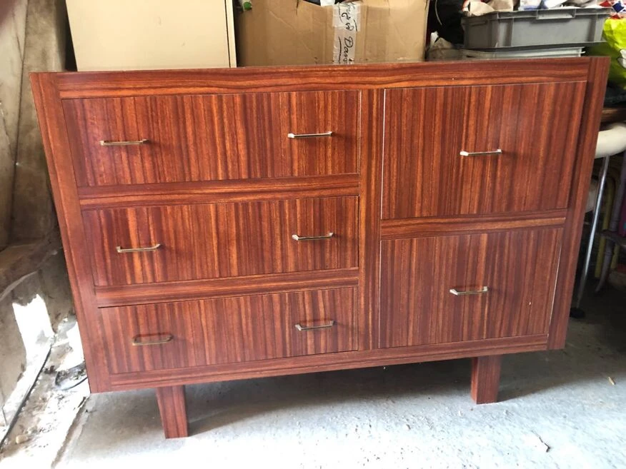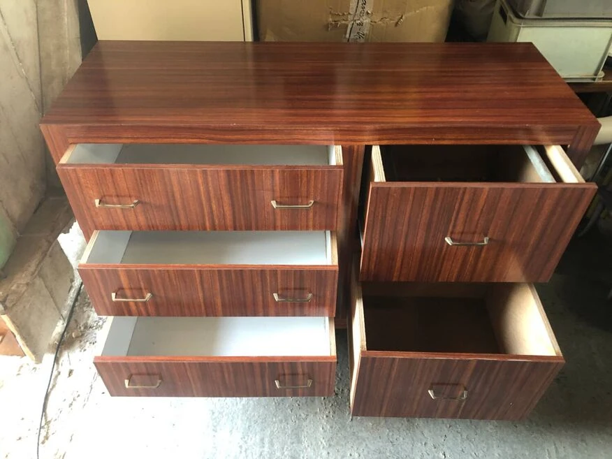 Formica imitation wood. 3 drawers on the left side. 2 boxes on the right side.