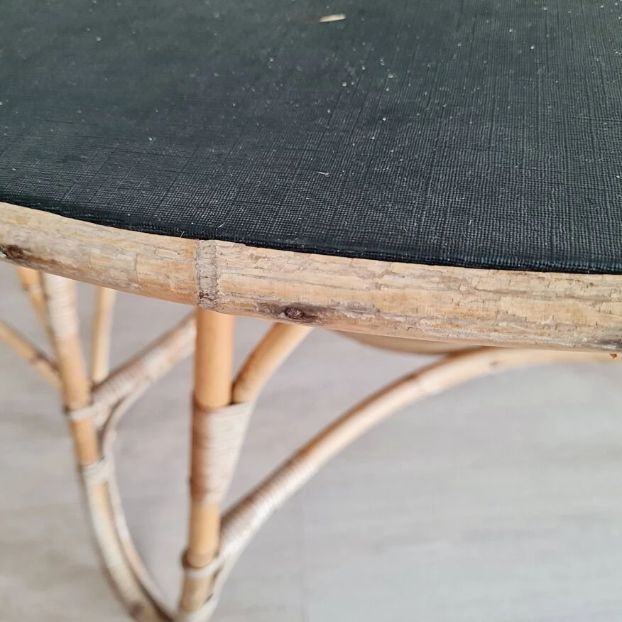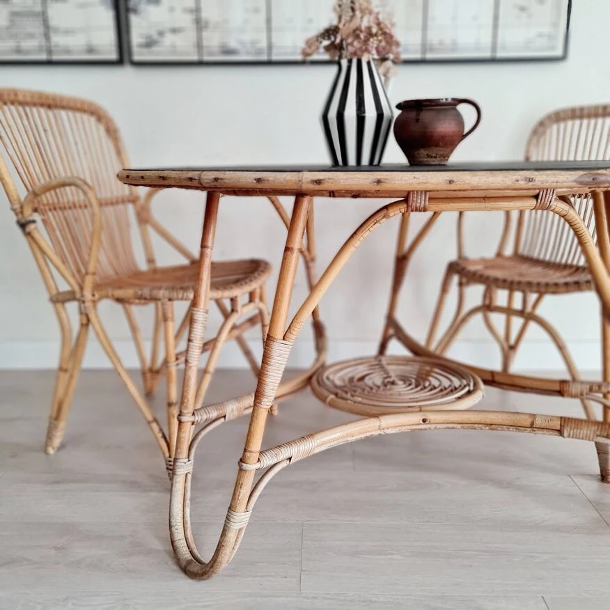 This vintage rattan and bamboo table will be charming surrounded by rattan chairs and soft armchairs in liberty fabric.