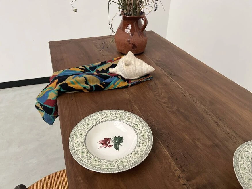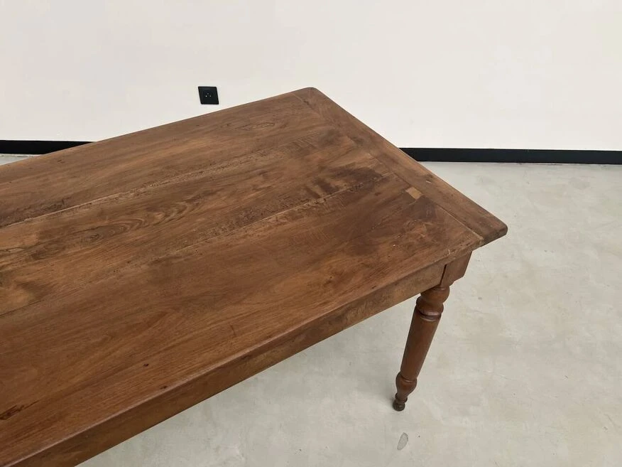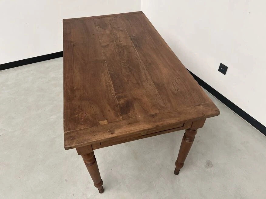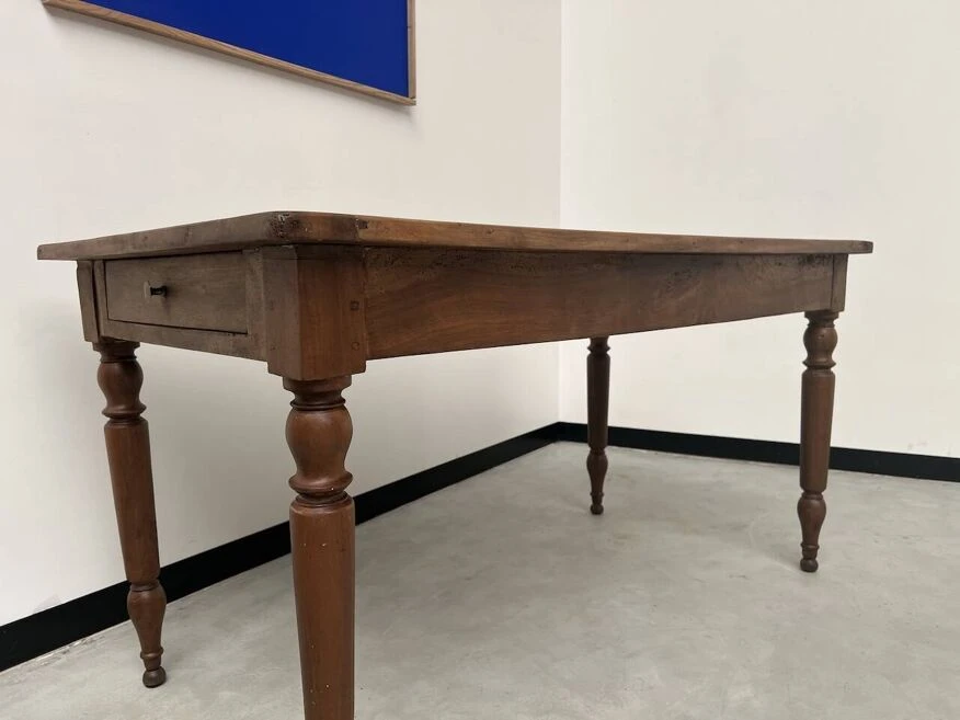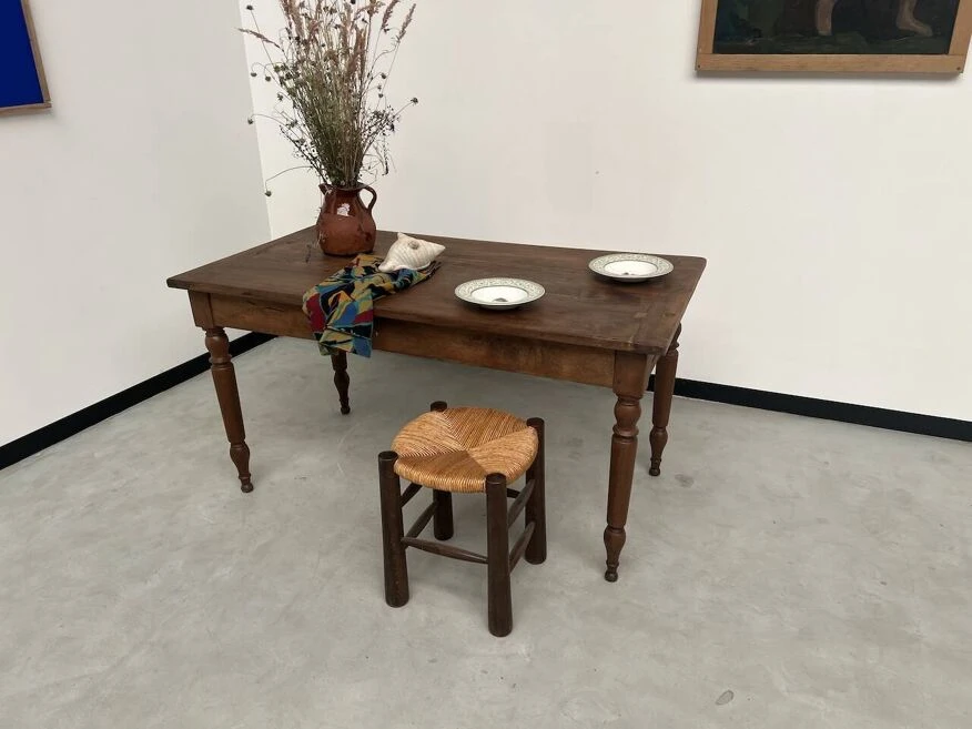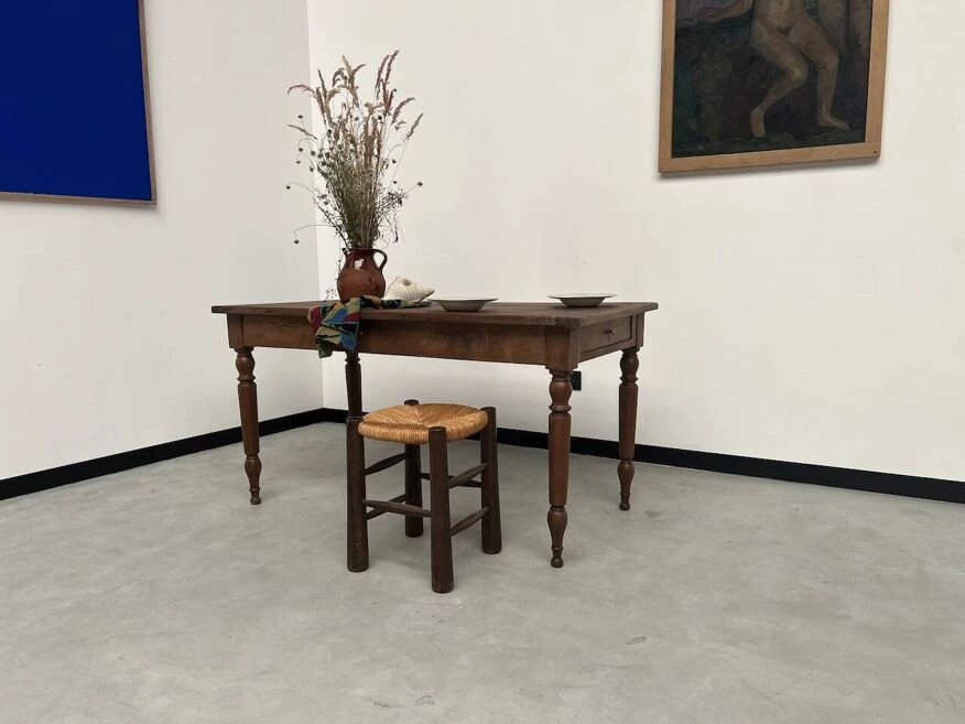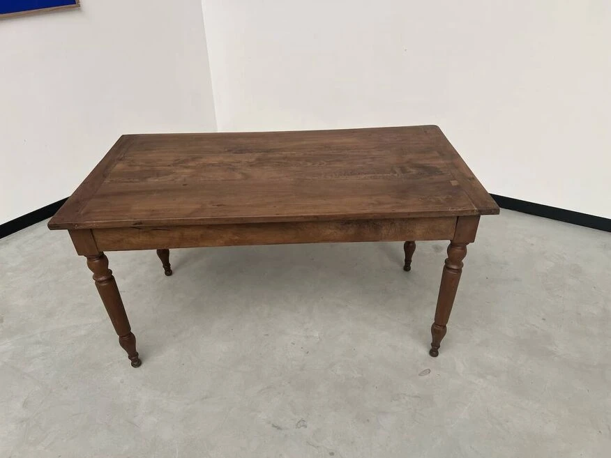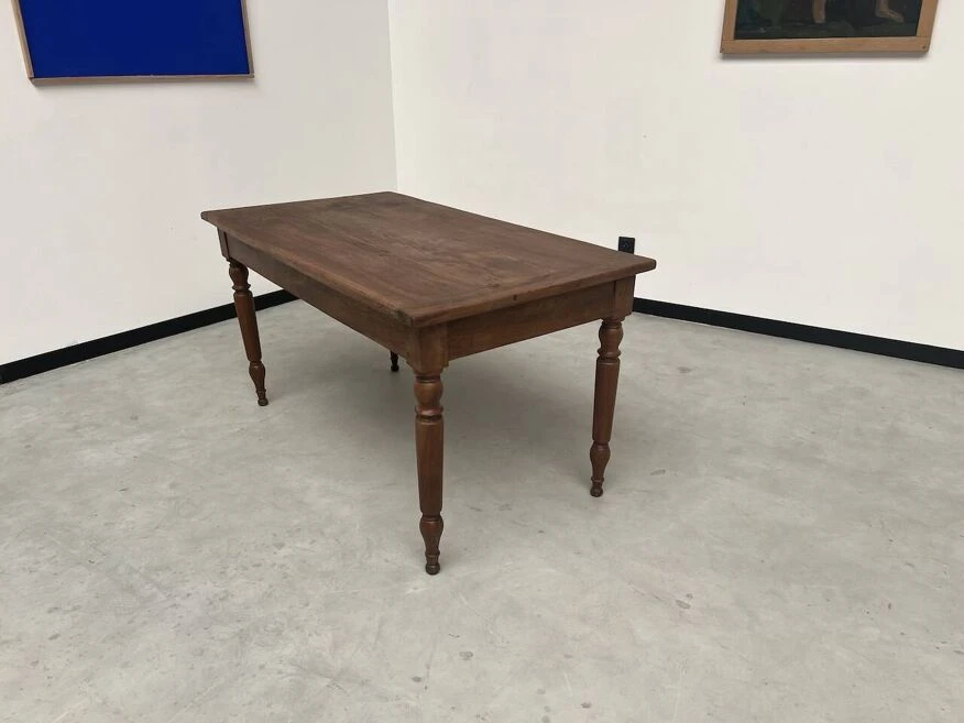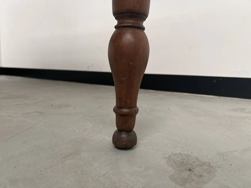 Antique bistro table in solid walnut with turned legs, 1950s.