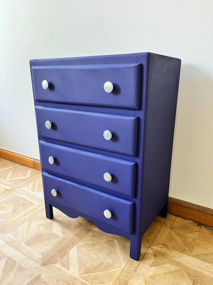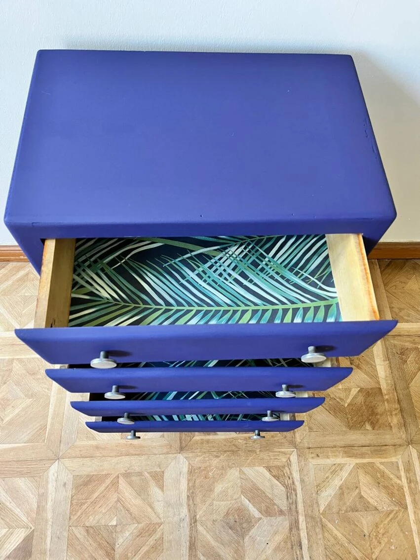 1950s chiffonier renovated in oriental blue paints the magic of colors with natural pigments composed of 4 renovated jungle paper drawers (h10/w40/p30) with chrome handles h80/l55/p40.