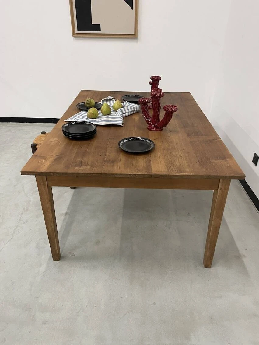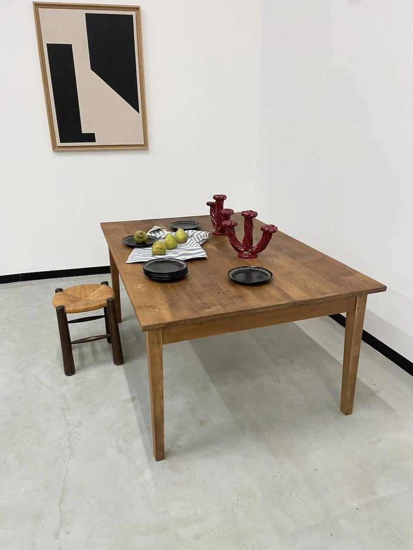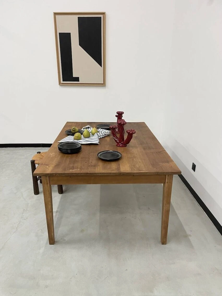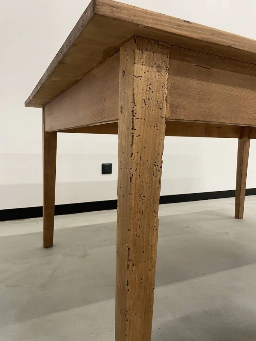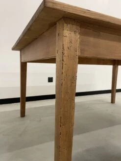 Old pine farm table with its spindle legs and its great depth of top, very atypical.