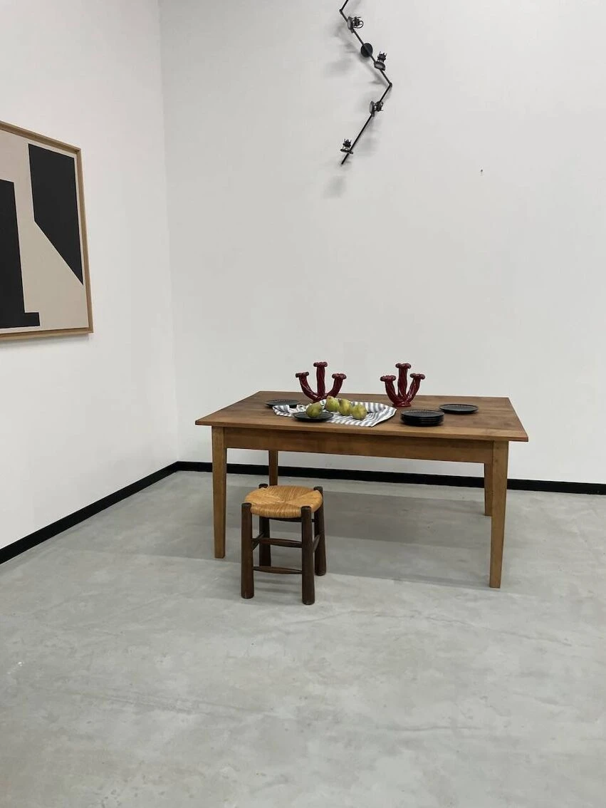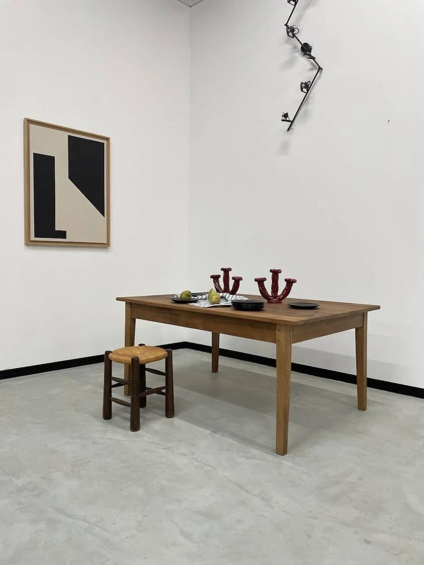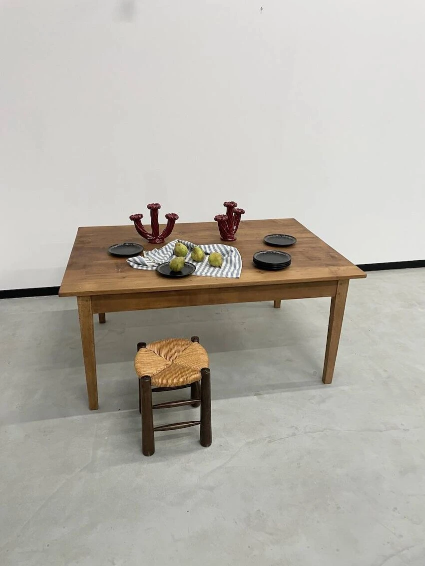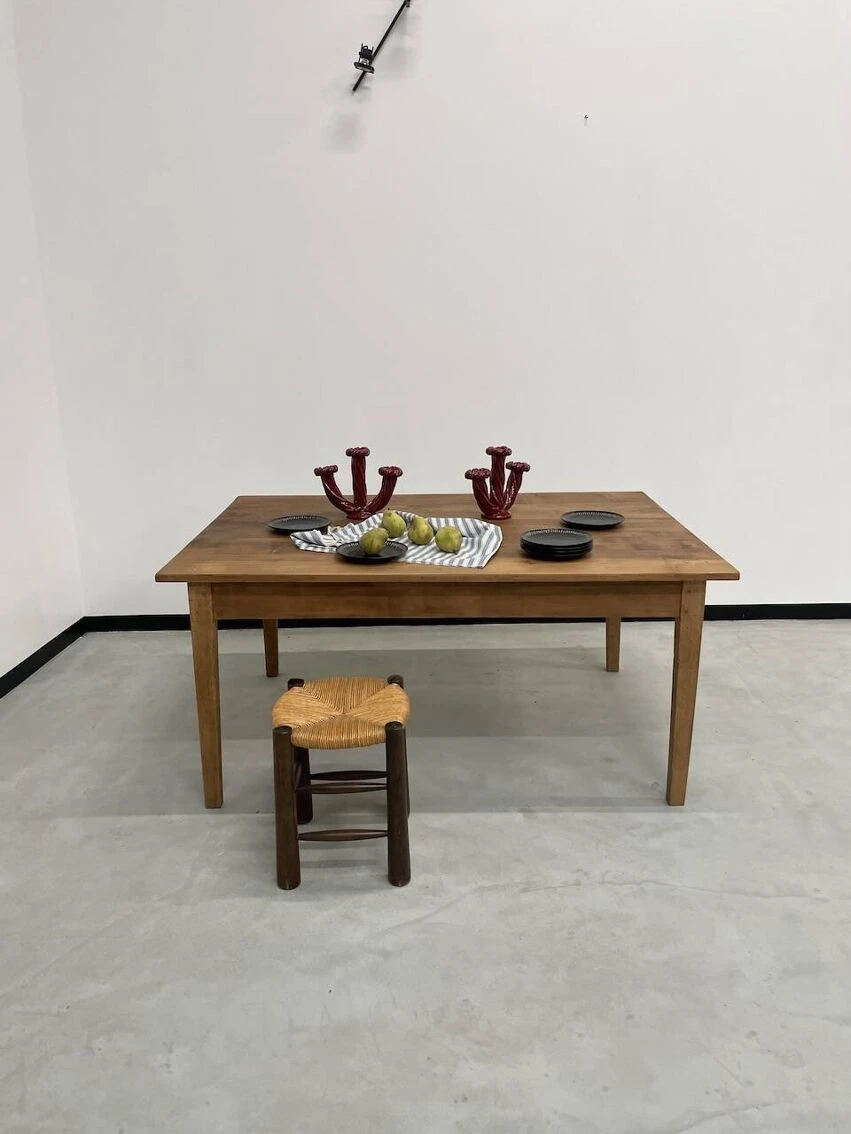 Old pine farm table with its spindle legs and its great depth of top, very atypical.