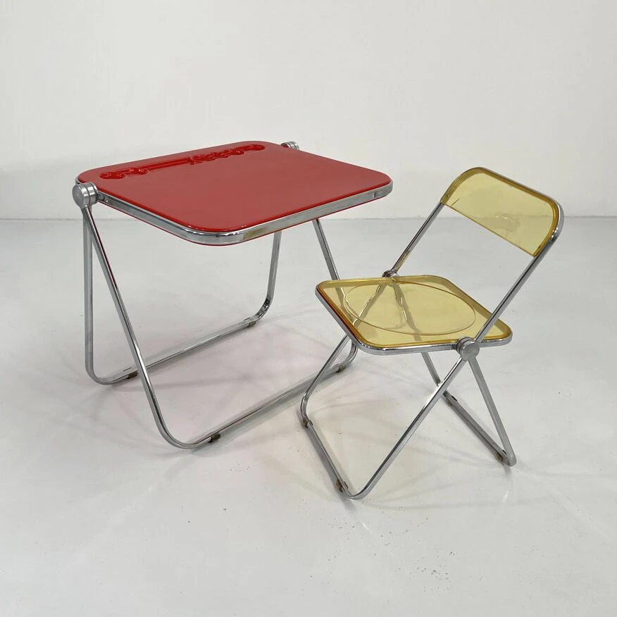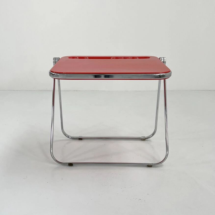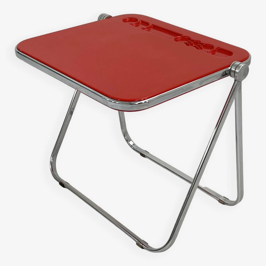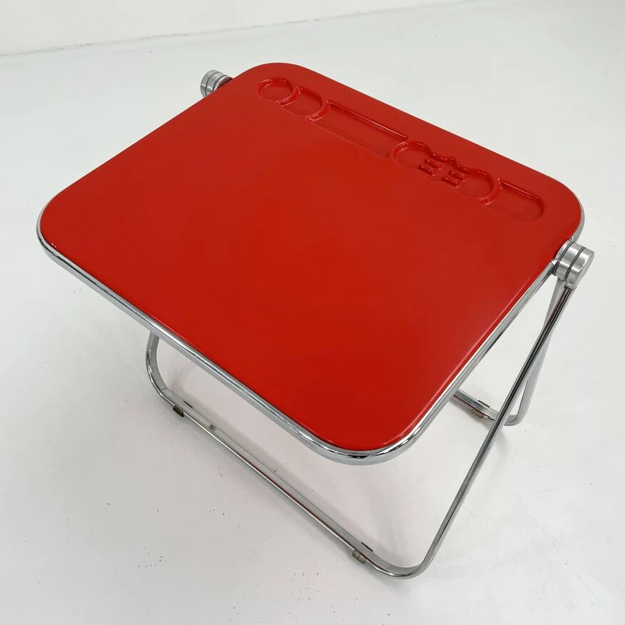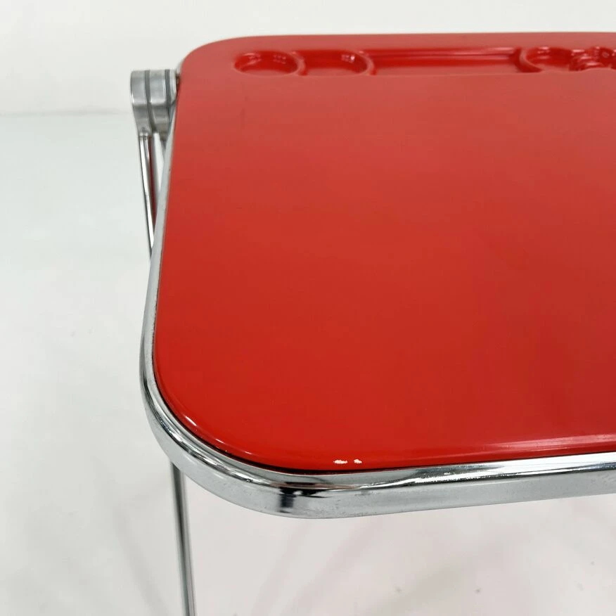 Designer – Giancarlo Piretti. Producer – anonima castelli. Model – platone folding desk. Design period – 1970. Measurements – width 82 cm X depth 65 cm X height 70 cm. Materials – perspex, steel. Color – red, silver. Light wear consistent with age and use. Light scratches on the tray – see photos for details.