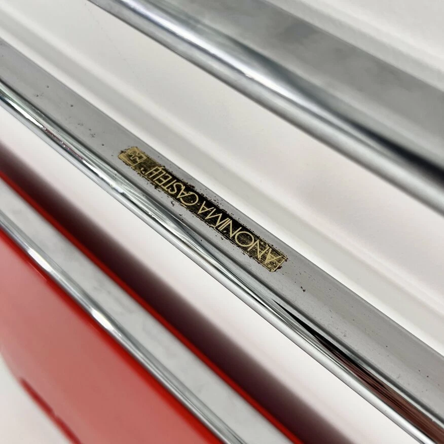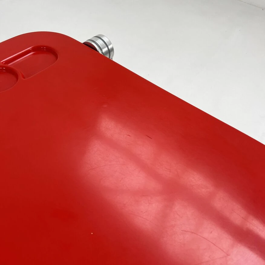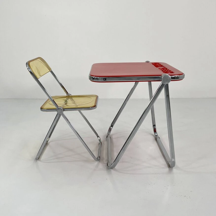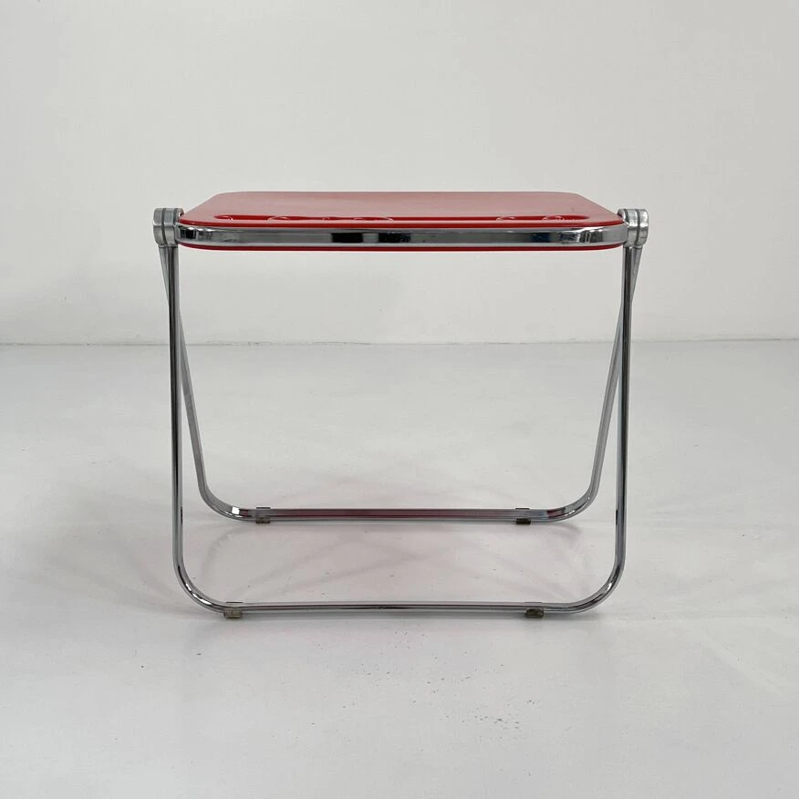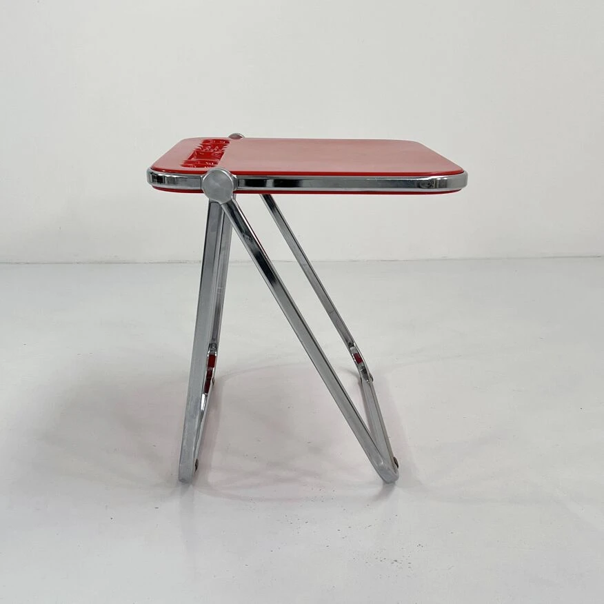 Designer – Giancarlo Piretti. Producer – anonima castelli. Model – platone folding desk. Design period – 1970. Measurements – width 82 cm X depth 65 cm X height 70 cm. Materials – perspex, steel. Color – red, silver. Light wear consistent with age and use. Light scratches on the tray – see photos for details.