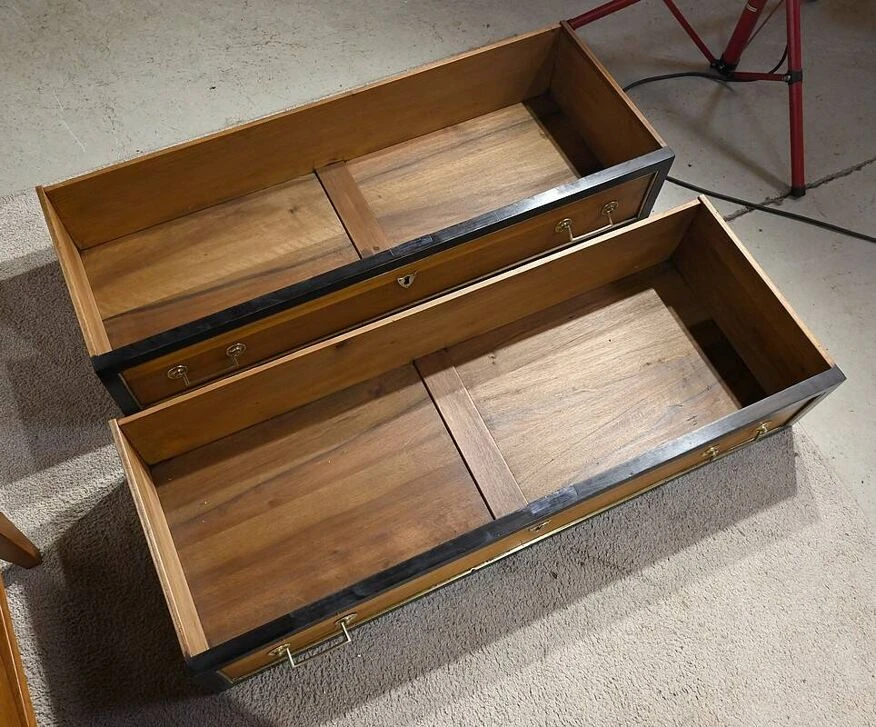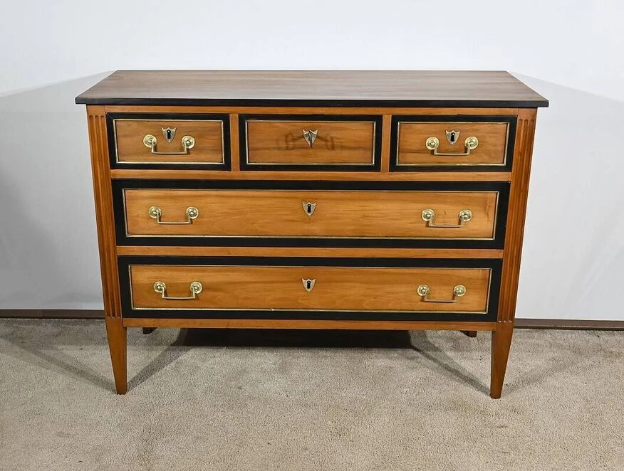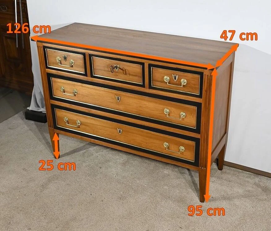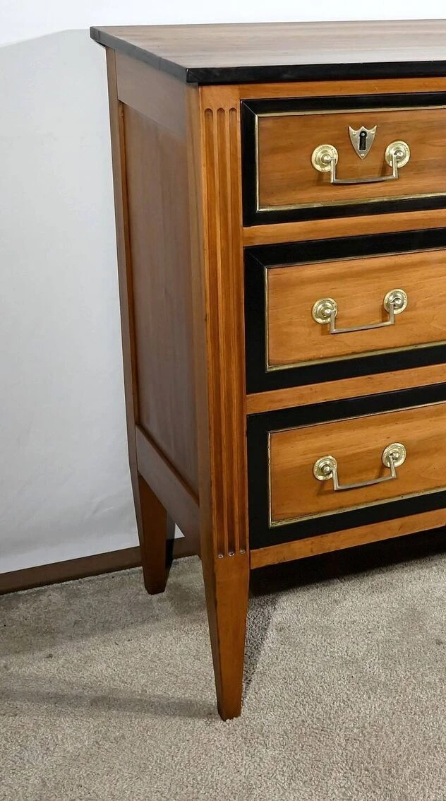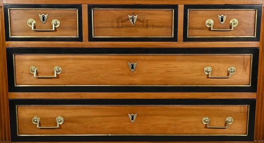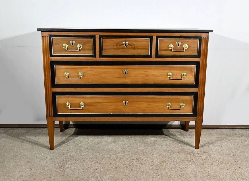 The top of the chest of drawers, in solid walnut, has a blackened wood edge bringing originality to this piece of furniture.
