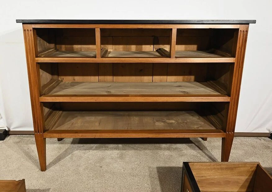 On each side of this piece of furniture, the uprights are decorated with fixed grooves and end in sheathed feet.