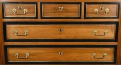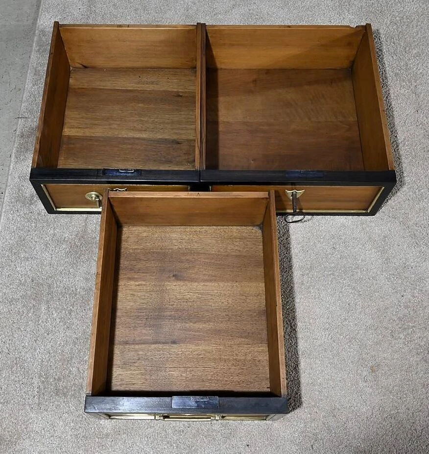 Solid walnut chest of drawers made up of three belt drawers whose fronts have a blackened wood surround and brass quarter rounds.