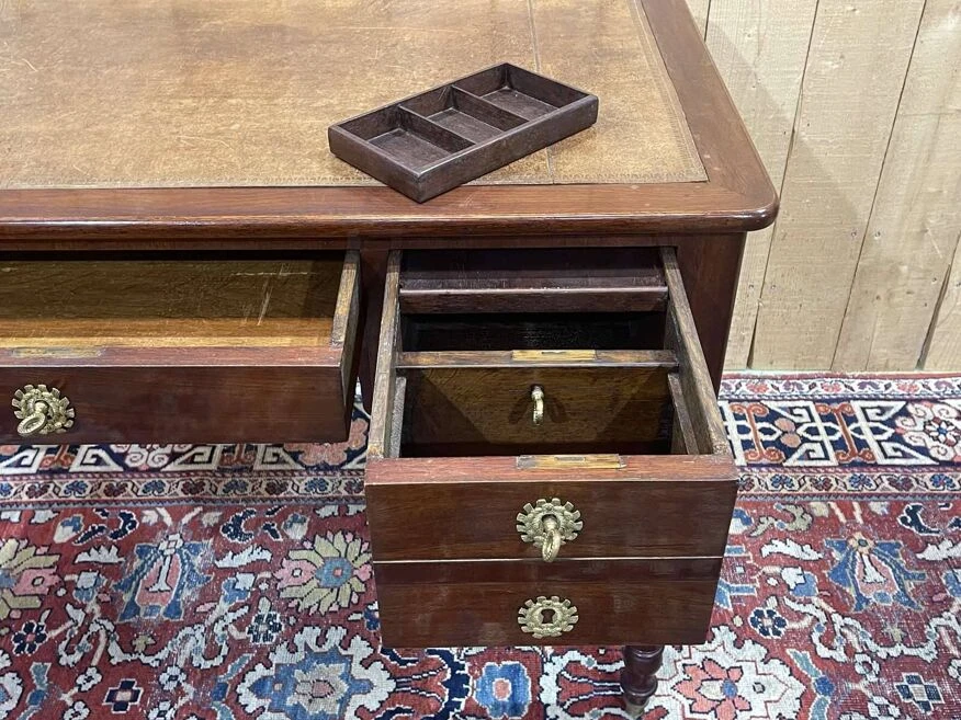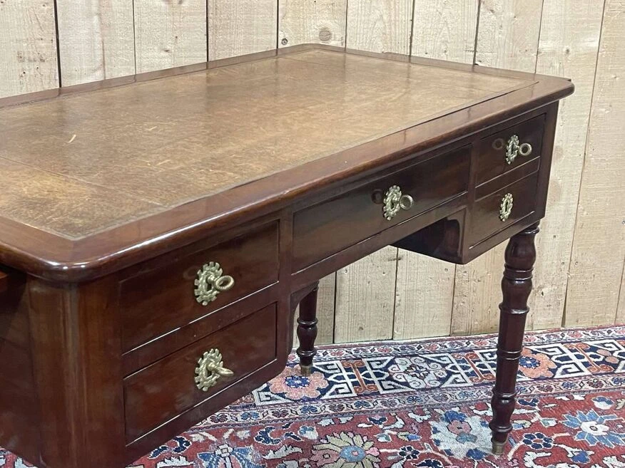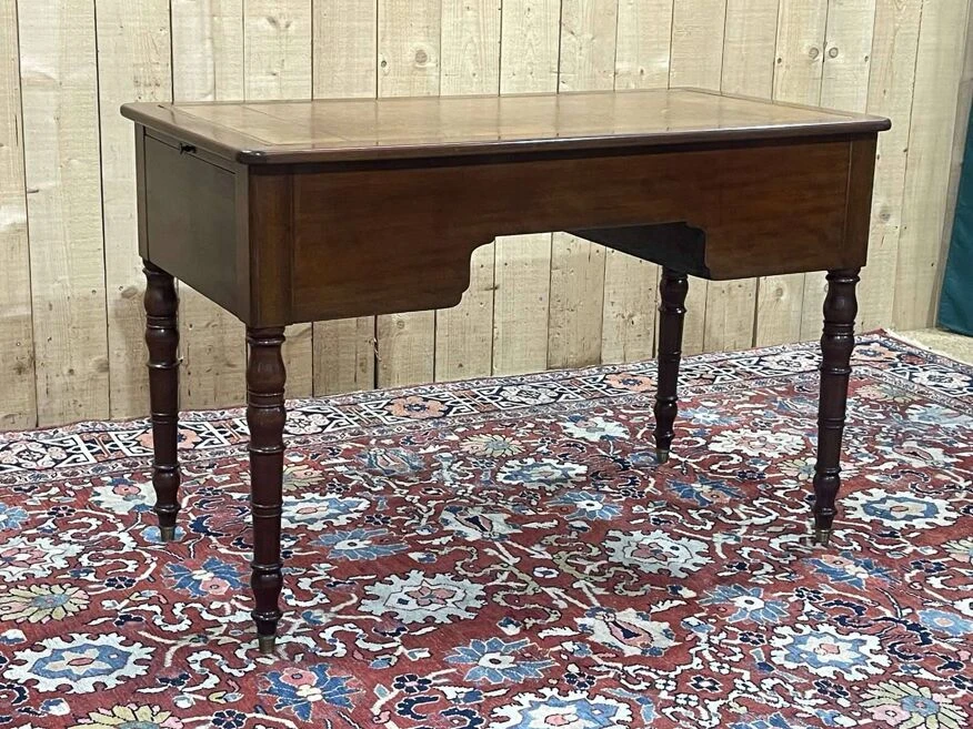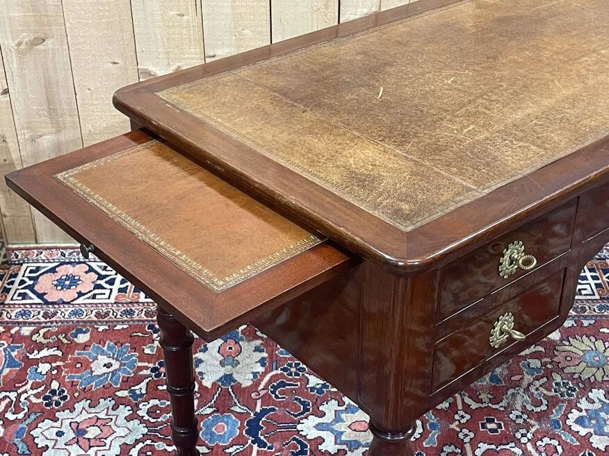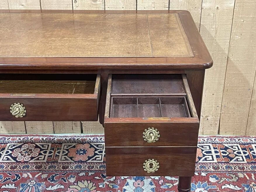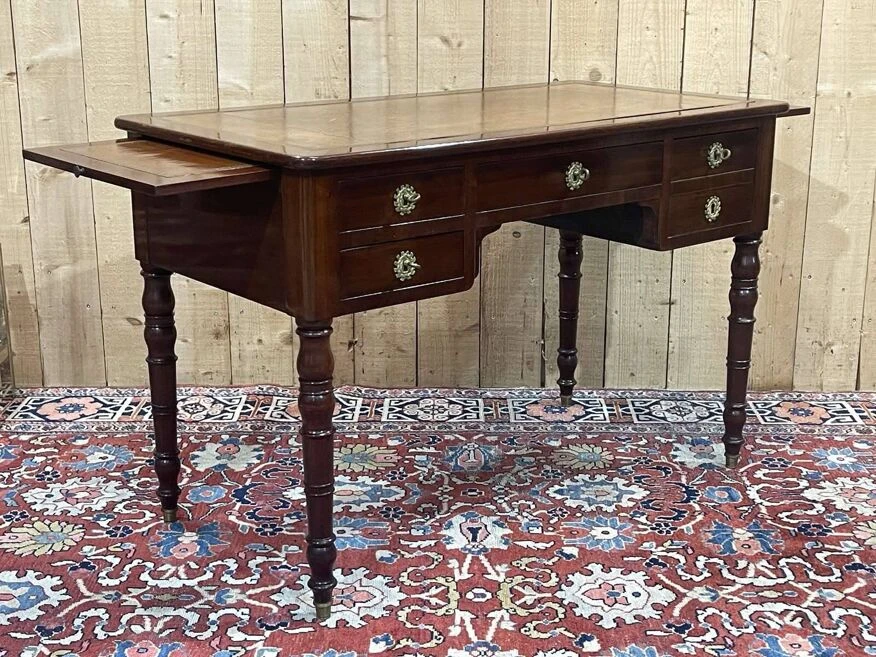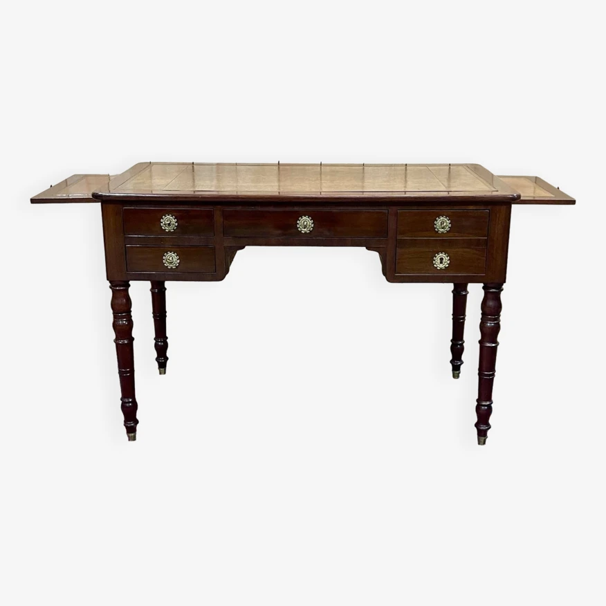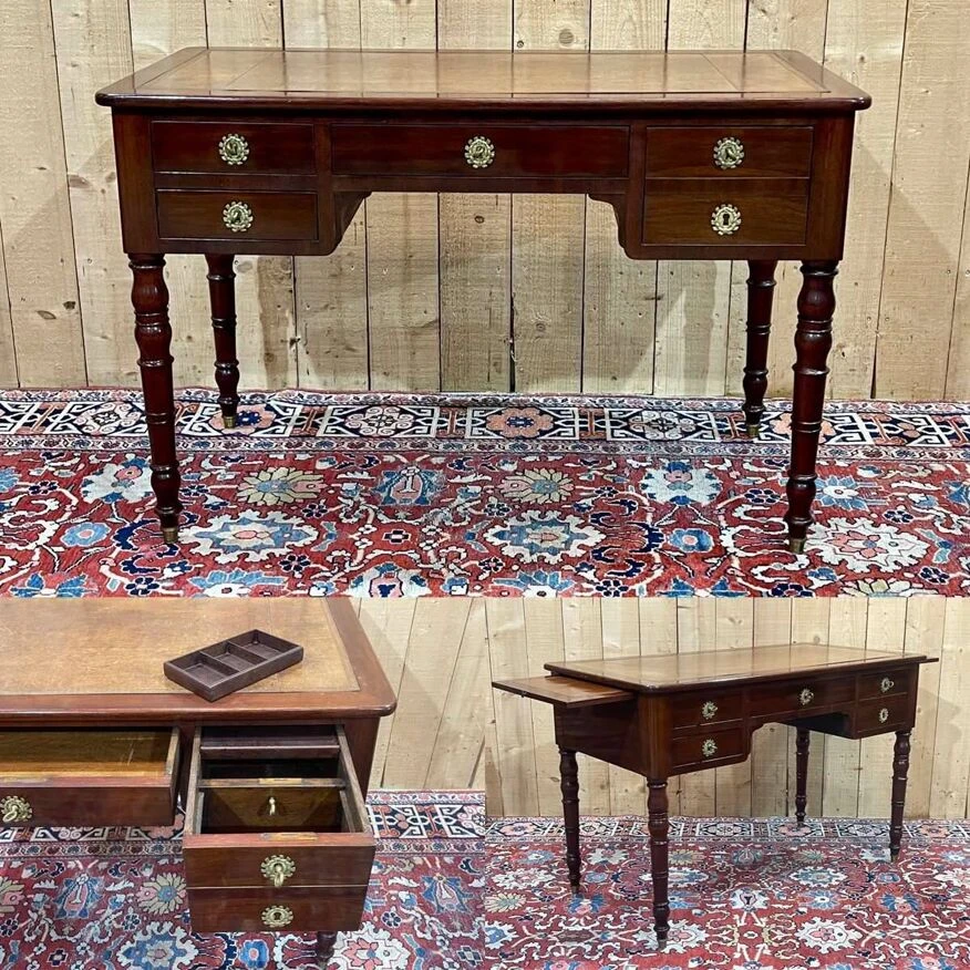 Restoration desk in mahogany and leather top from the 19th century – lmin=1m15, lmax=1m75, d=59cm, h=76cm.