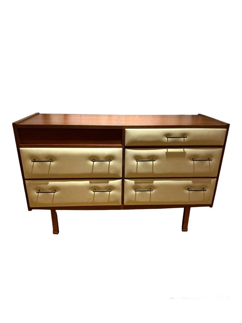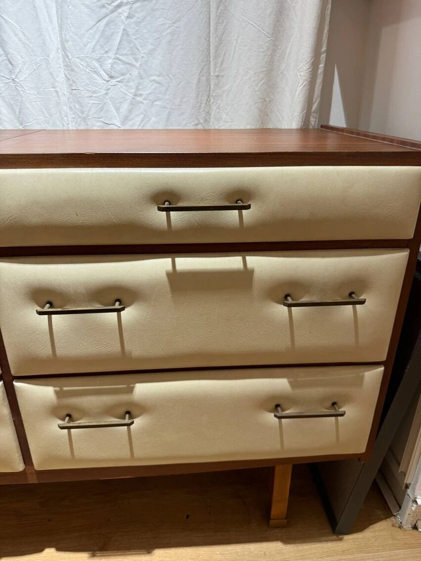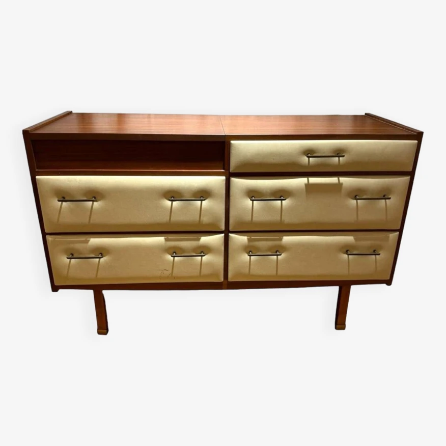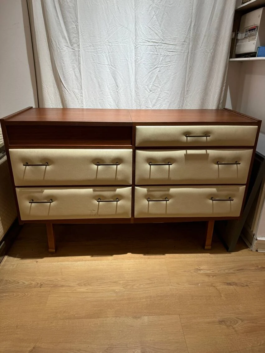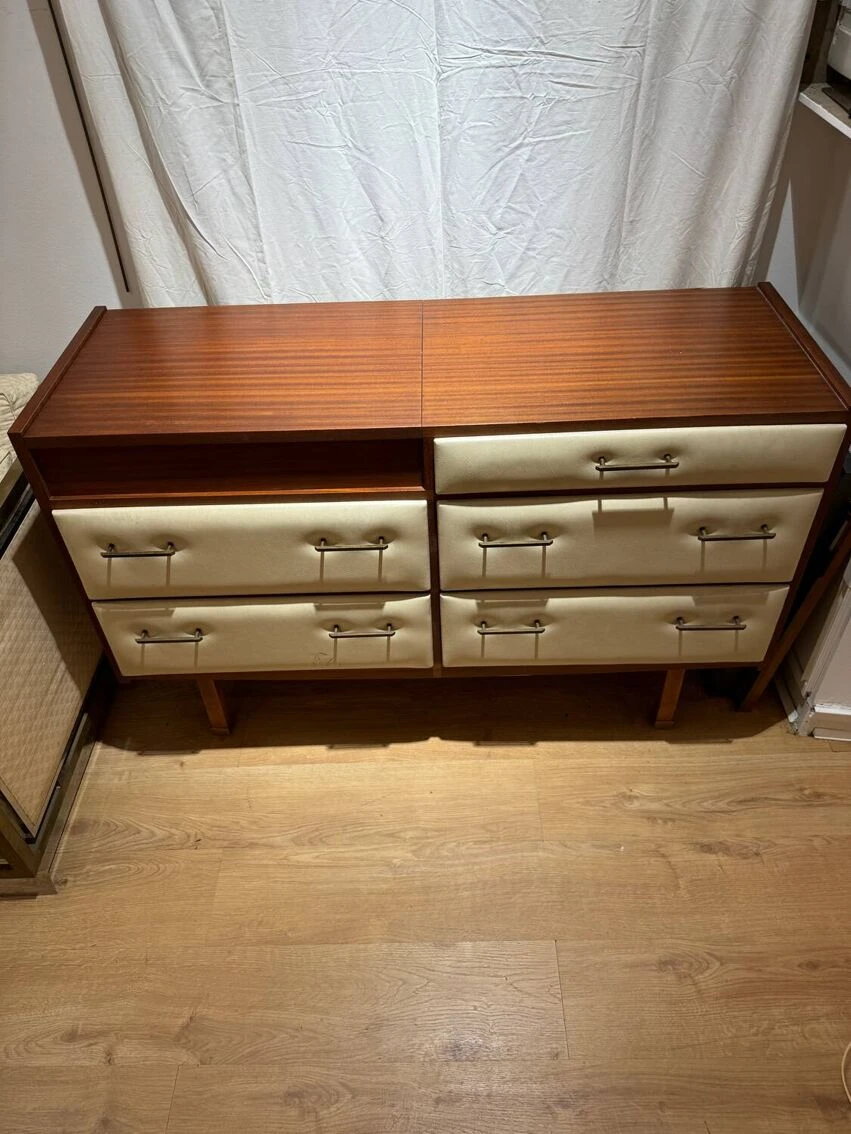 Superb vintage roger landault dressing table chest of drawers it is in good condition it is made of teak and dates from the 1960s it has 5 drawers and 1 dressing table flap it measures 130 cm long by 49 cm deep and 84 cm high.