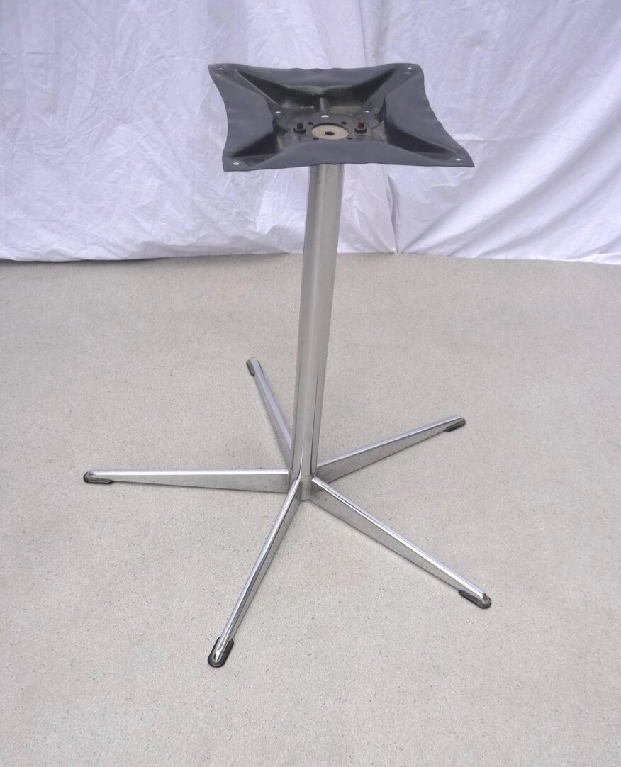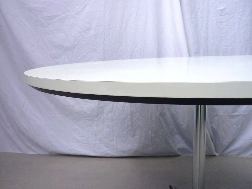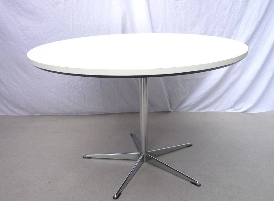 Round table diam. 110cm white lacquered composite wood, partly black lacquered beveled edges chromed steel leg with 5 branches fixing the top with 4 screws (therefore, removable for transport).