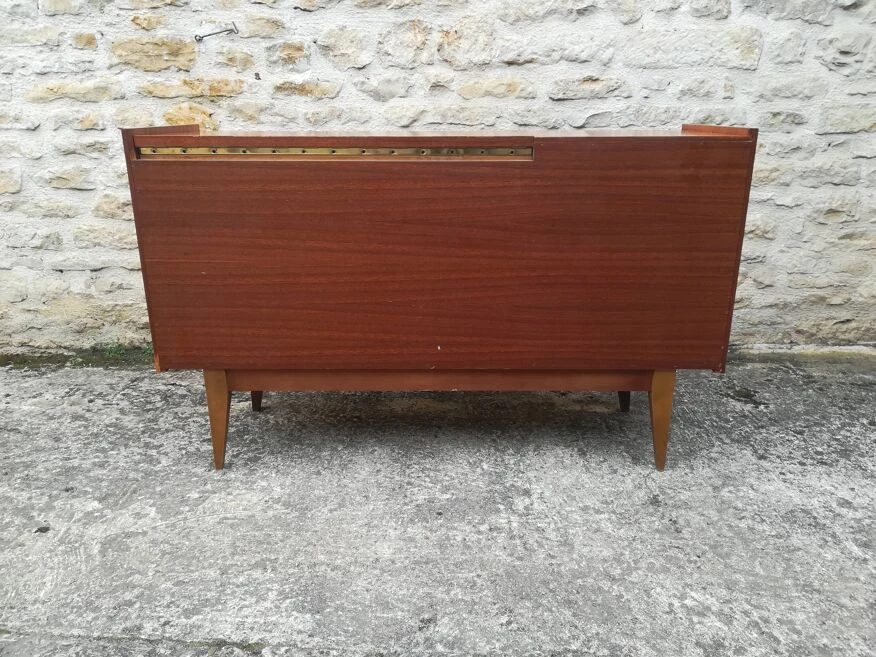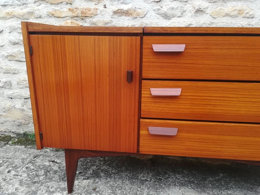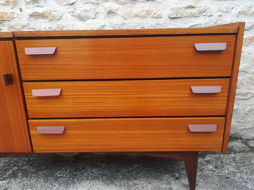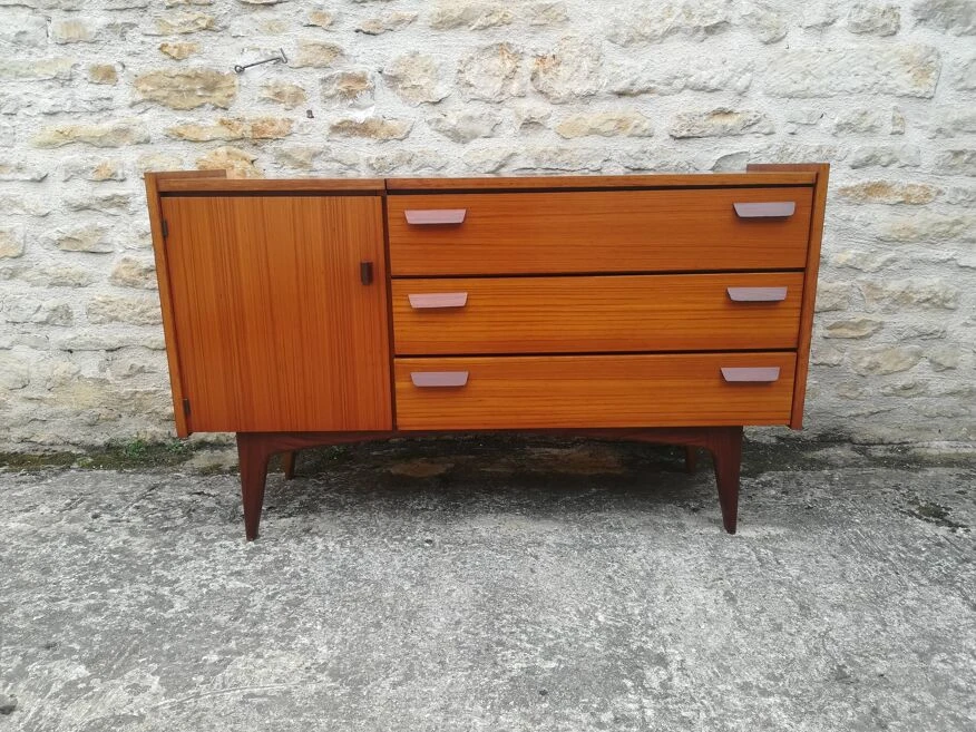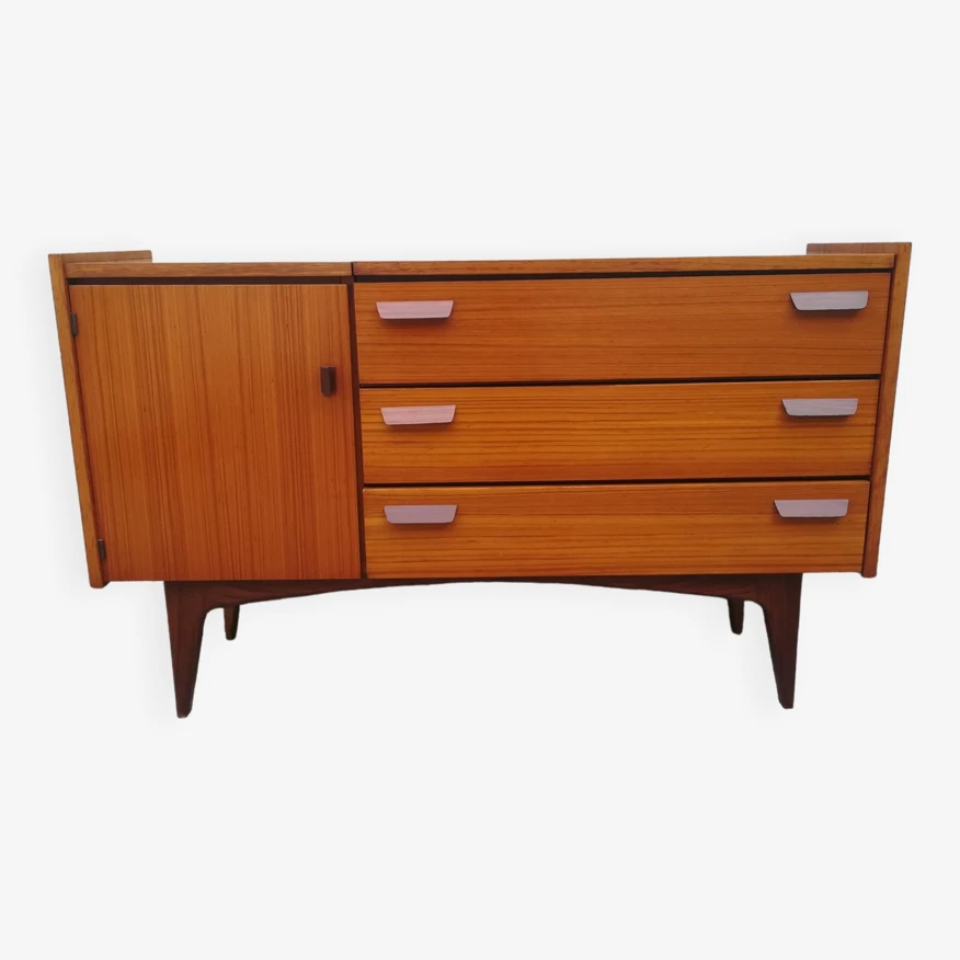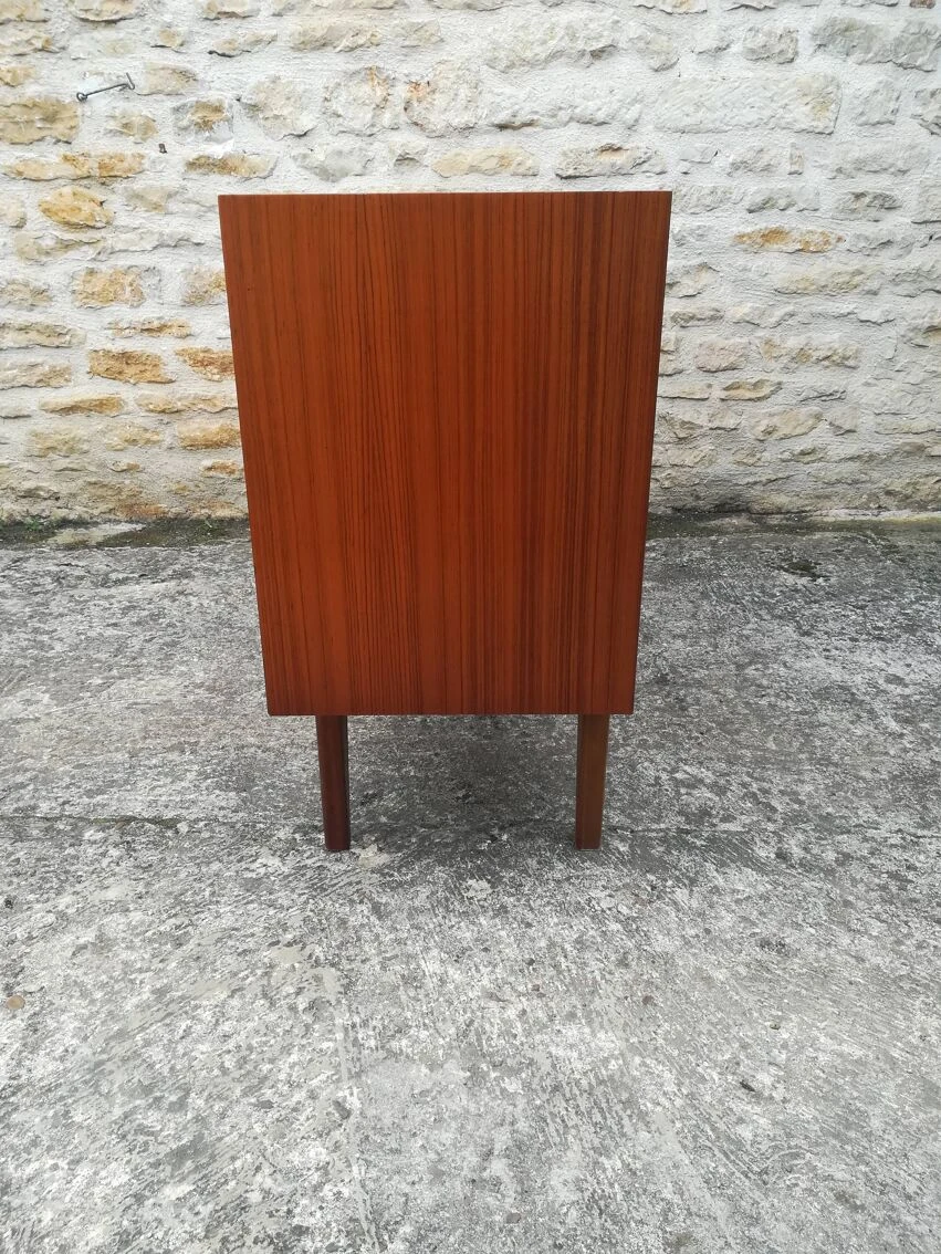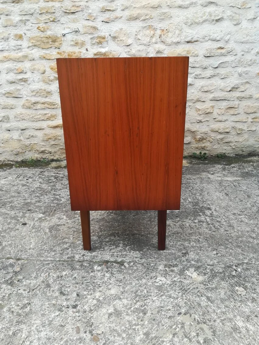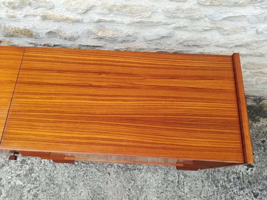 Scandinavian dressing table in varnished teak wood has one door, two drawers, a small flap and a large flap with a mirror, the furniture has been completely cleaned, everything is solid and stable, the drawers, the door, the lock and the flaps work well.