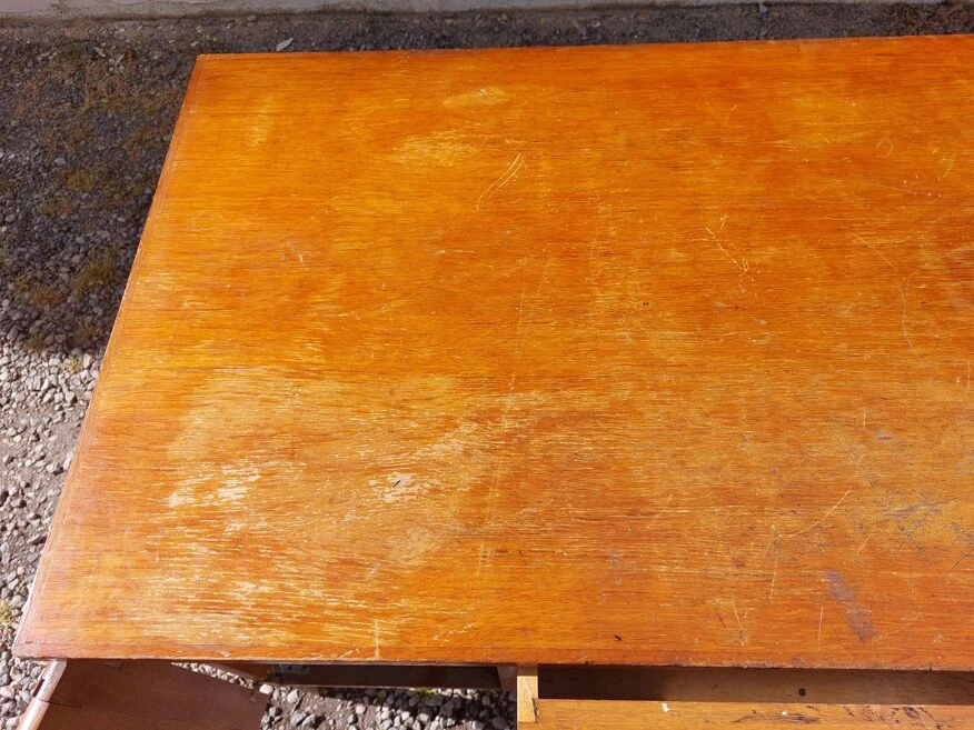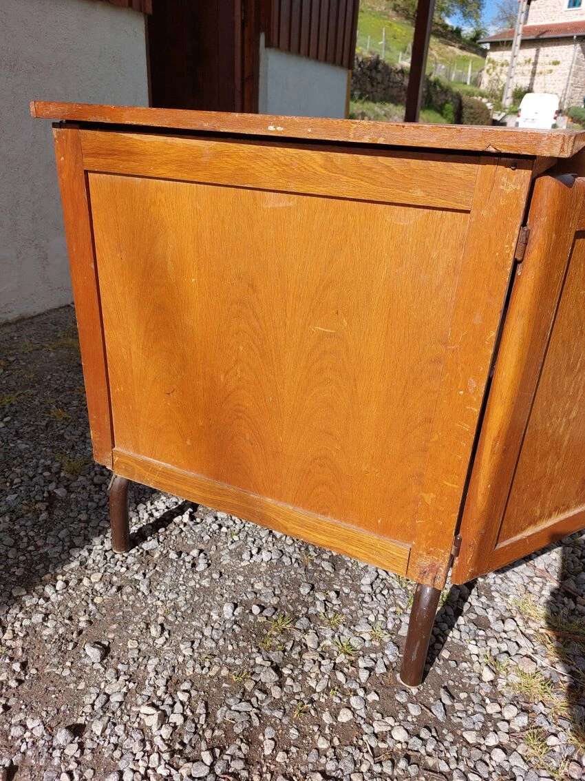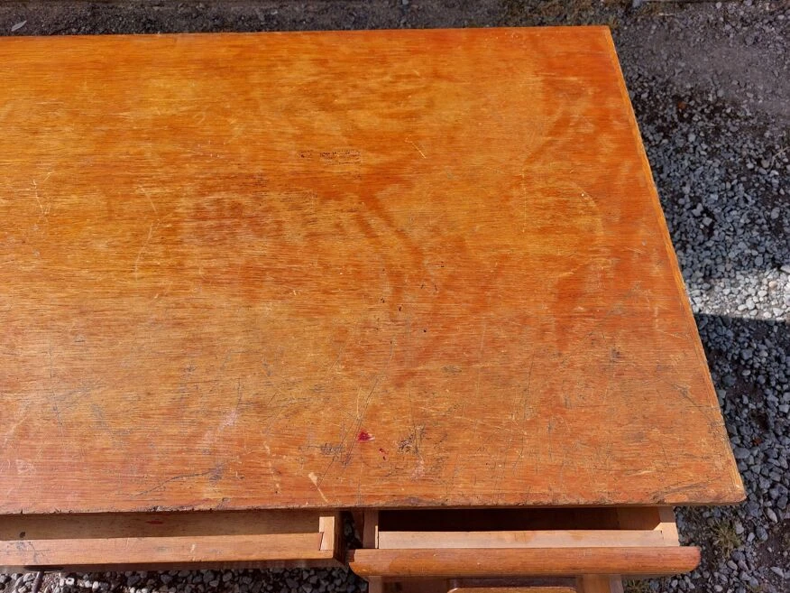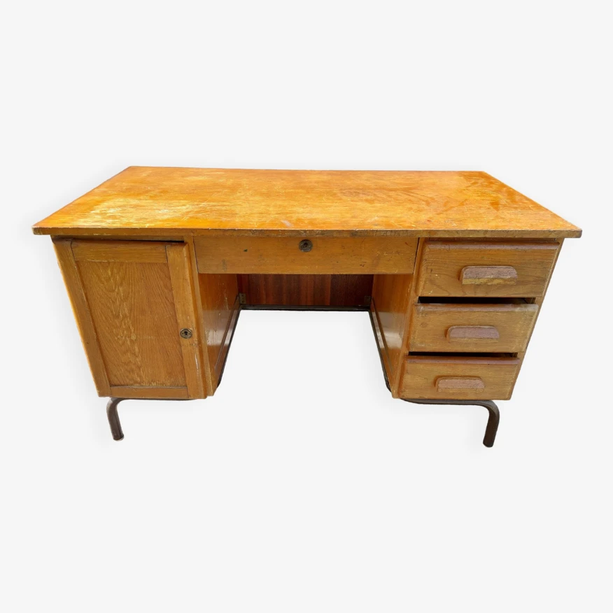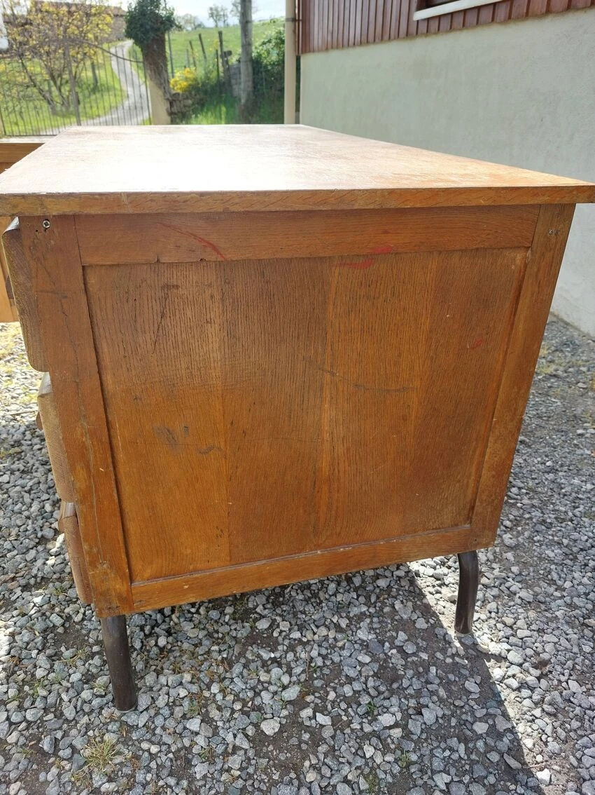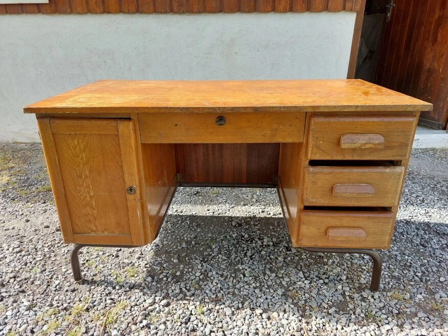 Former schoolmaster’s desk composed of a cupboard section on the left, a central drawer and 3 drawers on the right. Beautiful piece “in its own juice” which will bring a vintage touch to your room. For details and signs of use, see all the photos which form an integral part of the description. See in particular the empty spaces between the drawers which appear to be original. The tubular base is brown in color. The height under the central drawer (empty leg space) is 62cm. Possibility of choosing a chair or an armchair from my advertisements.