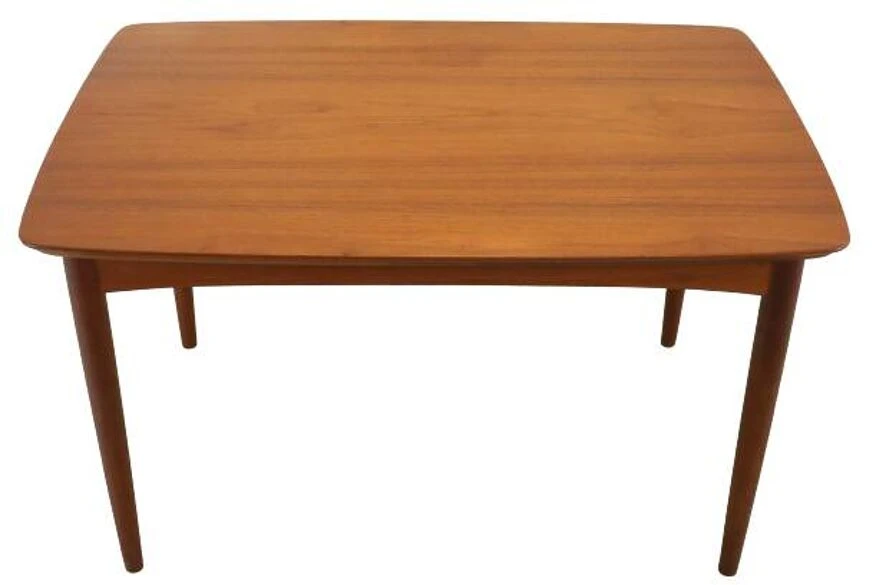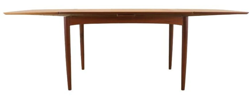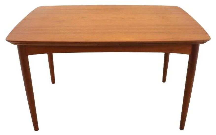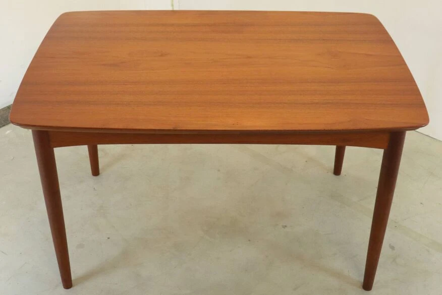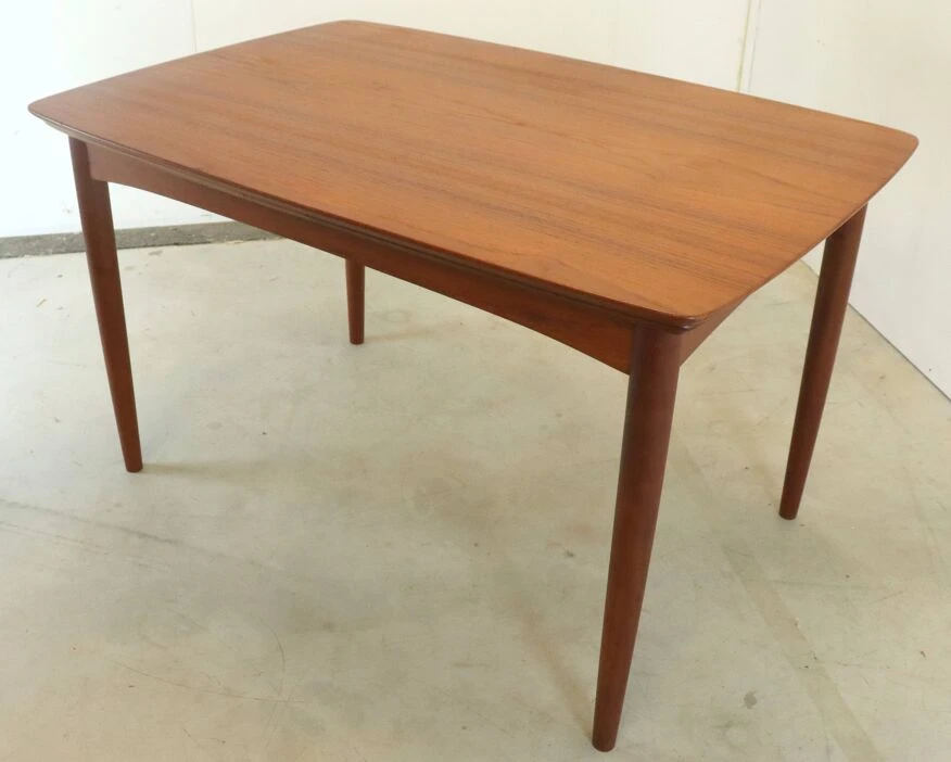 Zeer fraai en strak afgewerkte en uitgevoerde deense tafel, in geliefde kleur en houtsoort (massief teak in combi met edelfineer uit massief hout), en voorzien van fraaie details.