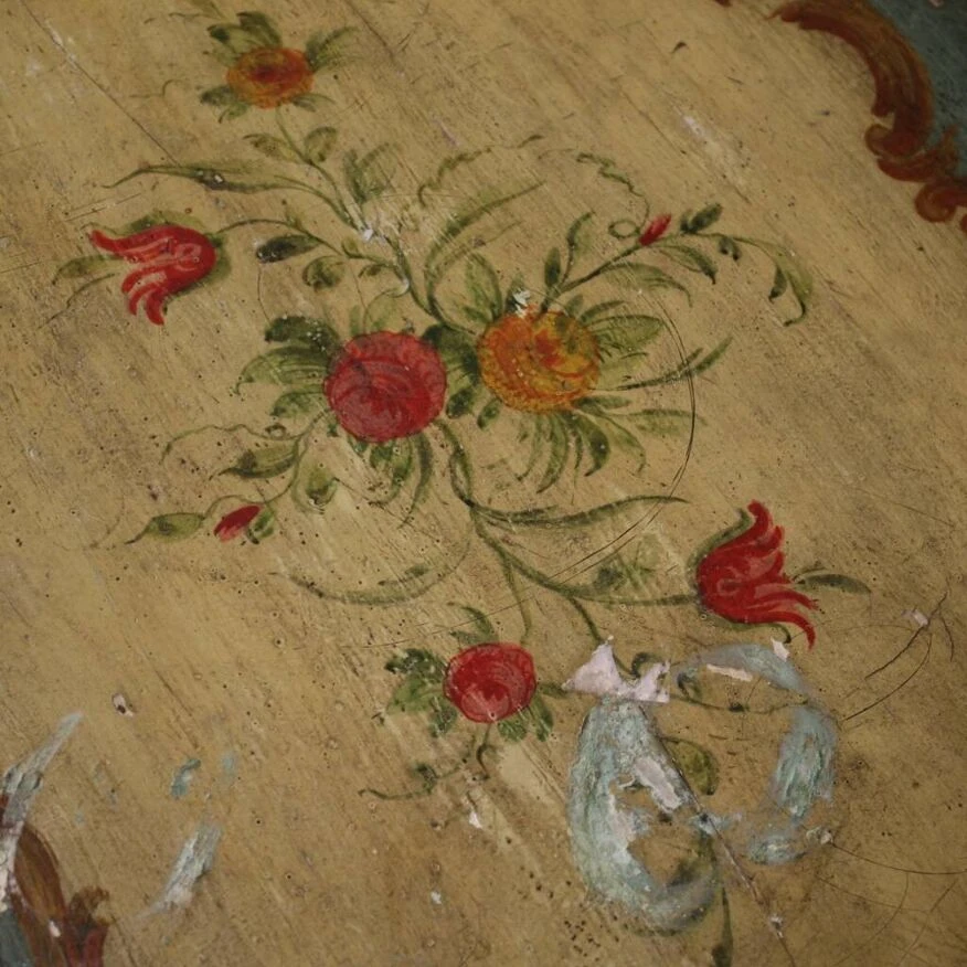 Furniture in carved, lacquered and hand painted wood with very pleasant floral decorations.