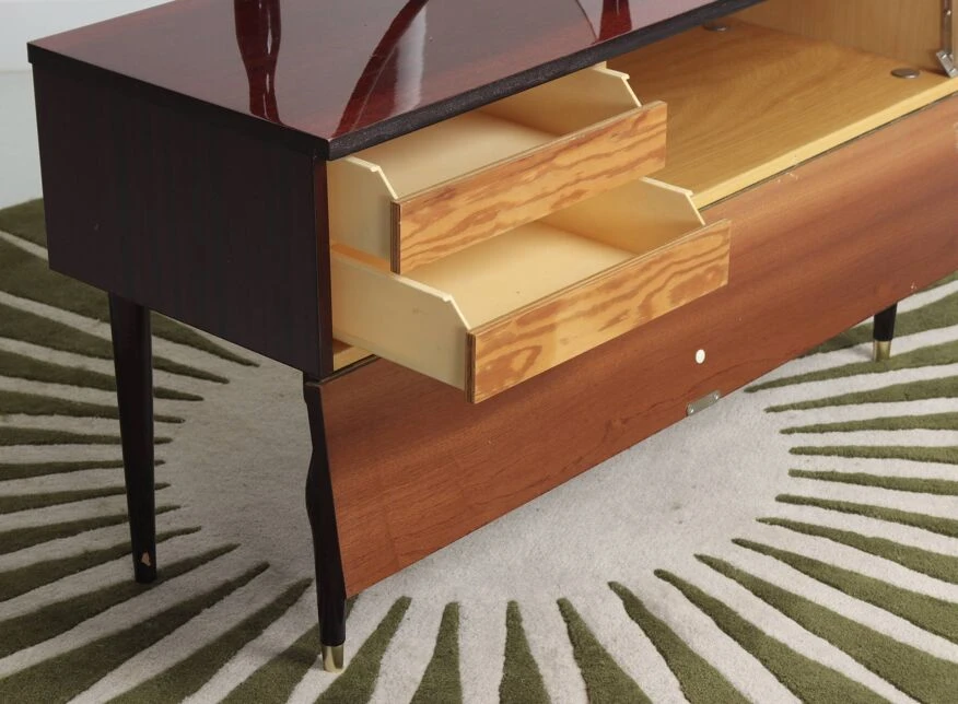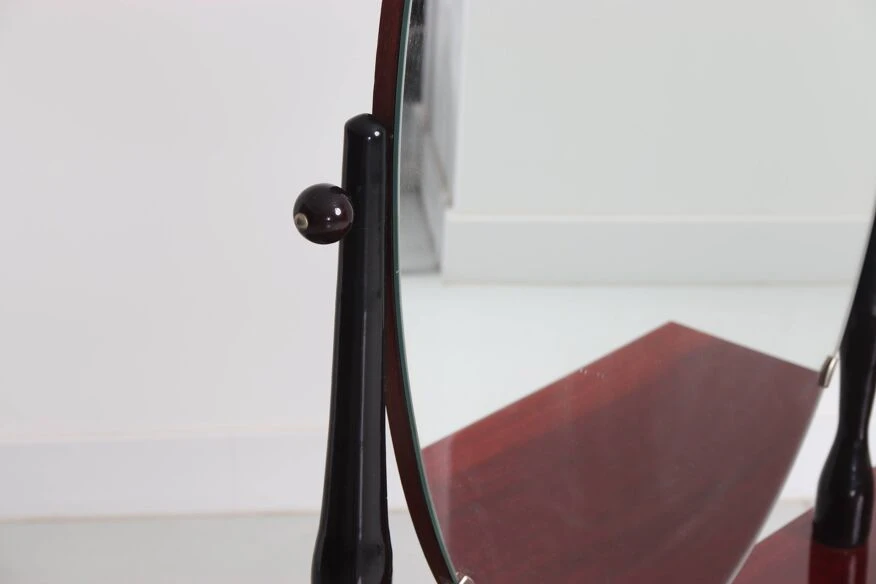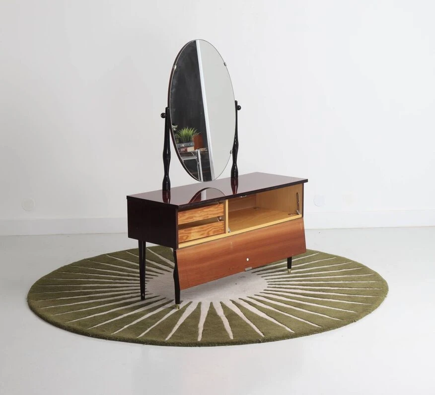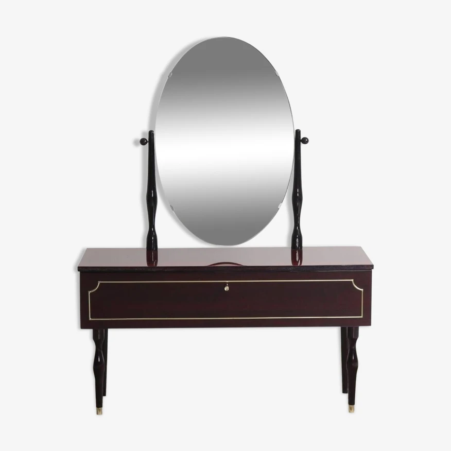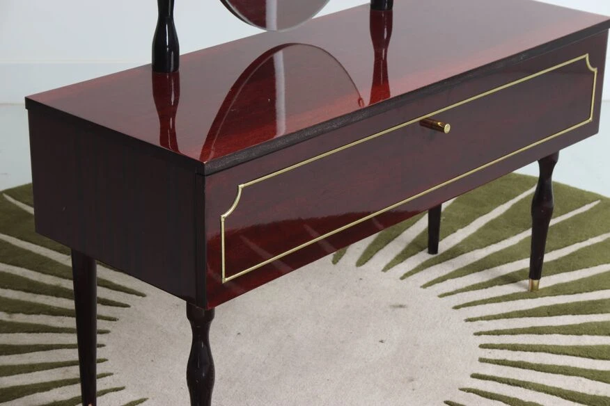 Vintage dressing table consisting of a mirror and storage: dimensions: – length: 106 cm – depth: 40 cm – height: 58 cm dimensions: mirror: – total height: 139 cm materials: – rosewood veneer with a glossy varnish finish.