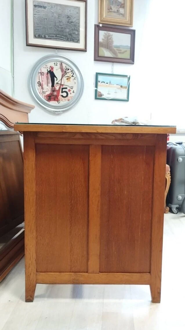 Solid wood desk resting on 4 legs with a central drawer and 4 drawers + a shelf on the right part dating from the mid-20th century.