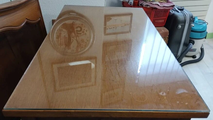 There is a glass plate on top of the desk.
