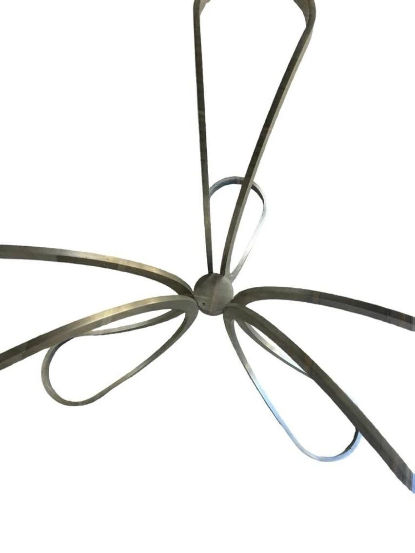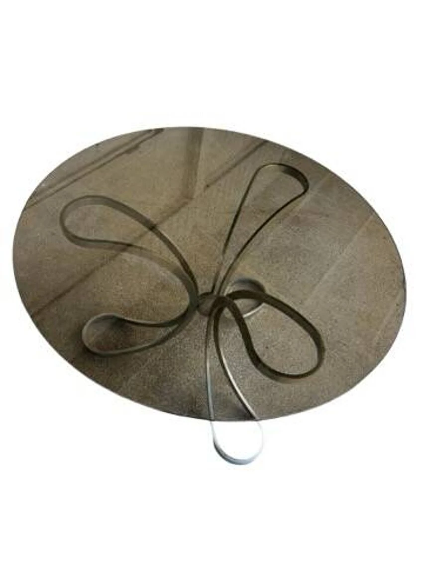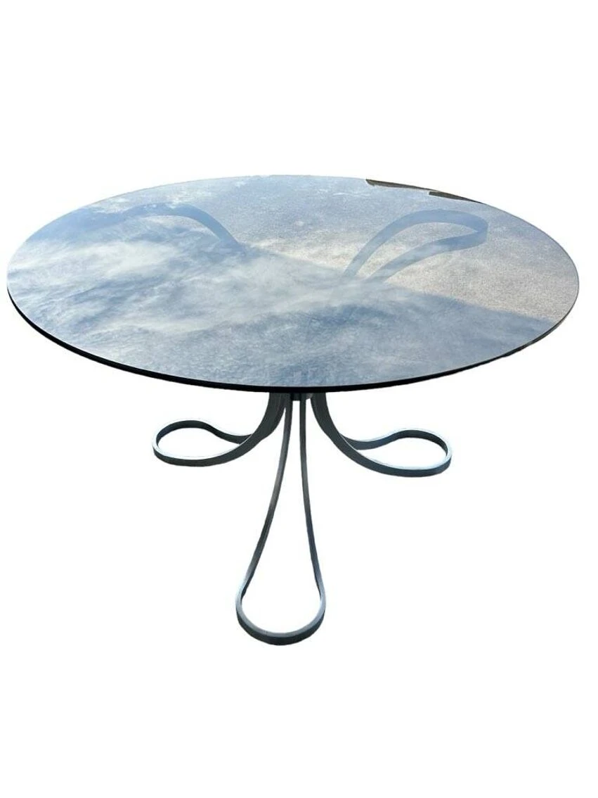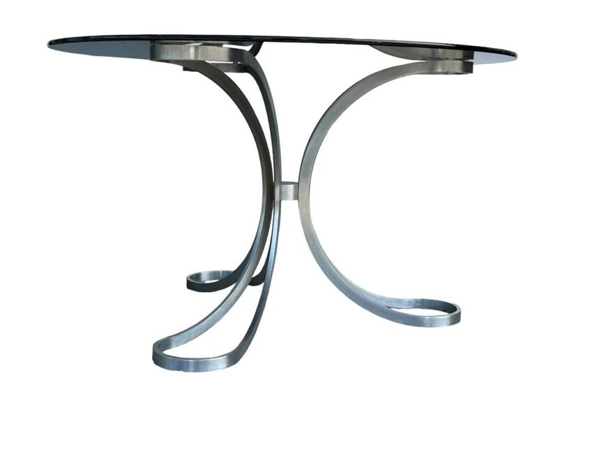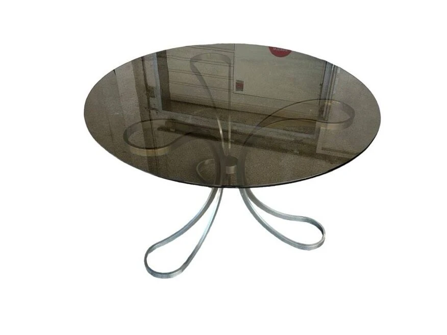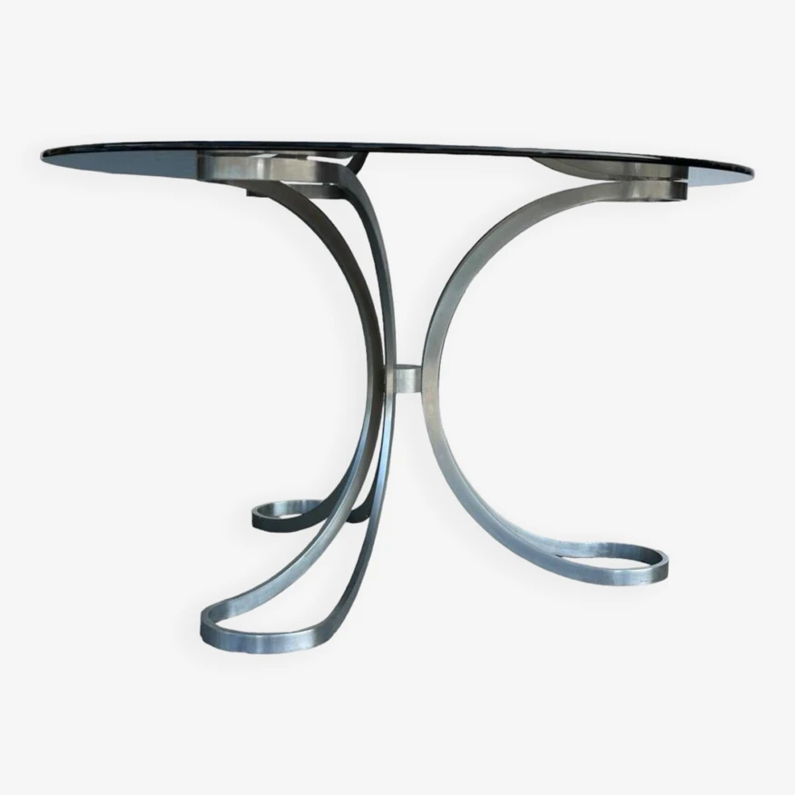 Very beautiful “space age” dining room table in polished steel and circular smoked glass slab.