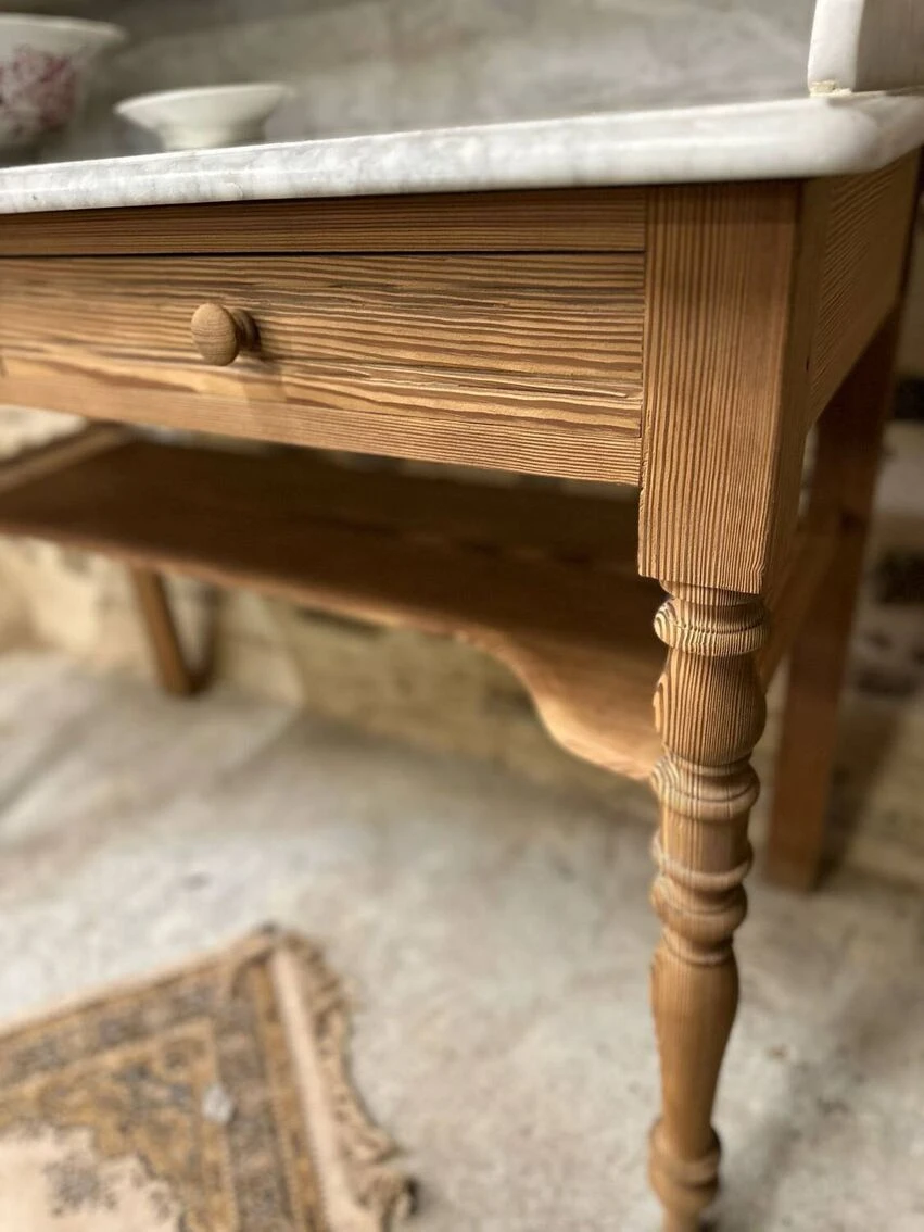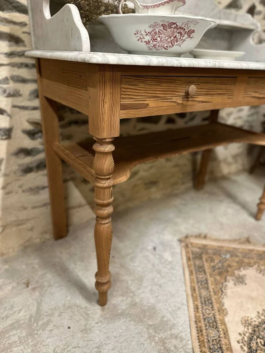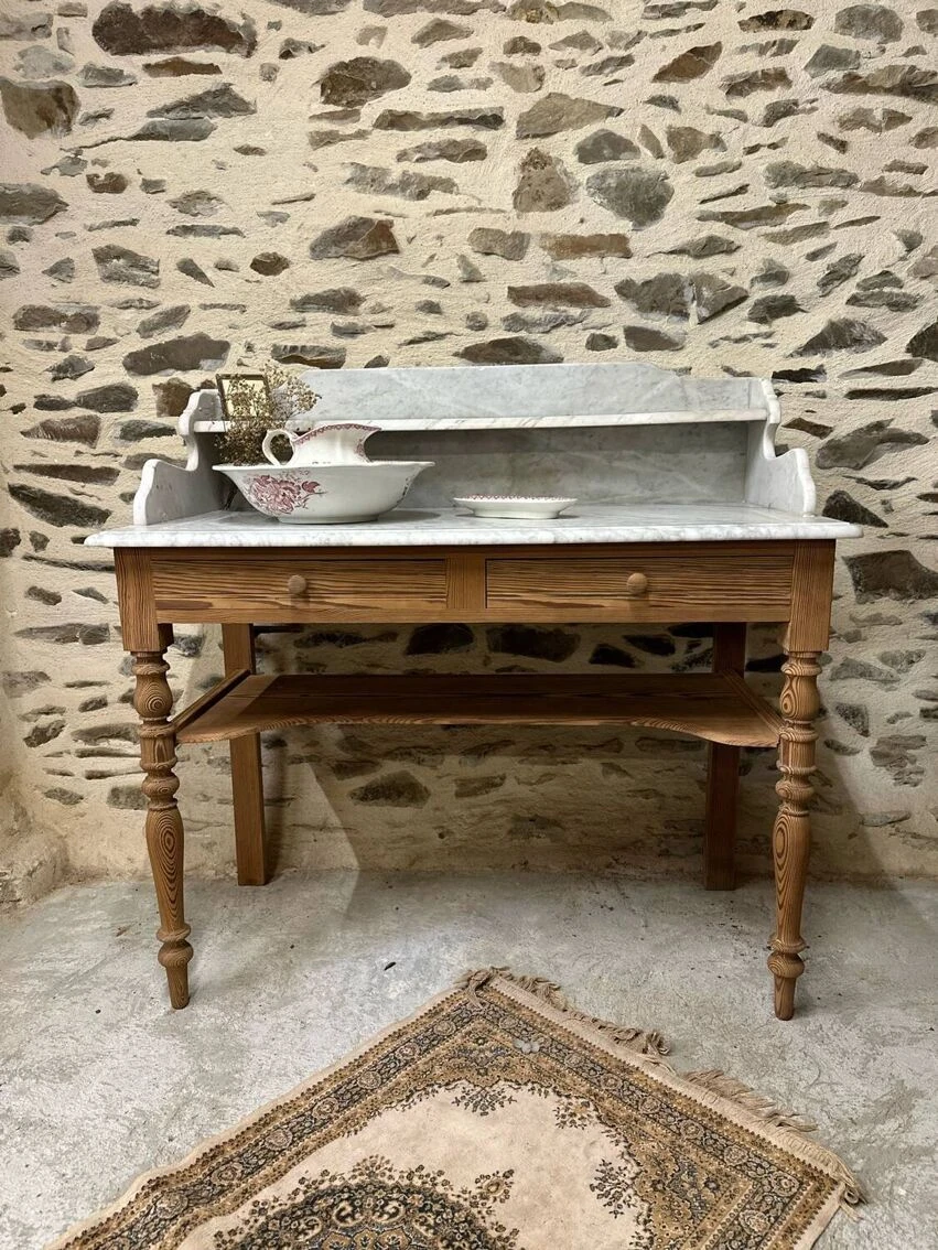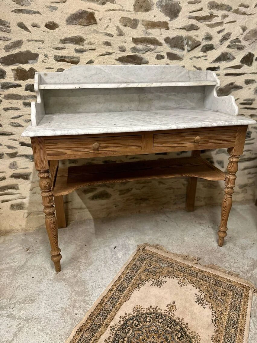 Beautiful vanity unit or dressing table stripped with marble. Super aerogummed piece of furniture, ideal dressing table or even as a washbasin unit! 2 drawers and a lower shelf! Some traces of time and its past but that’s what gives it its authentic charm! Ideal bedroom, dining room, living room, hallway, bedroom, playroom, laundry room, dressing table, bathroom, entrance… don’t hesitate, give free rein to your imagination. It will fit perfectly into any decor style!