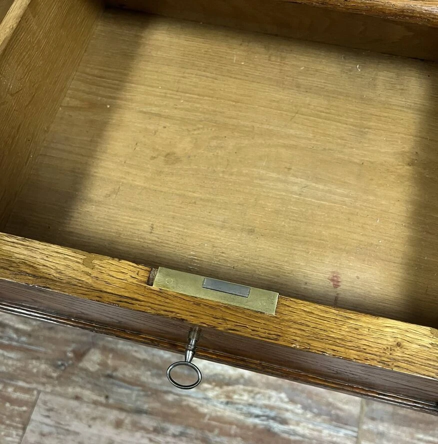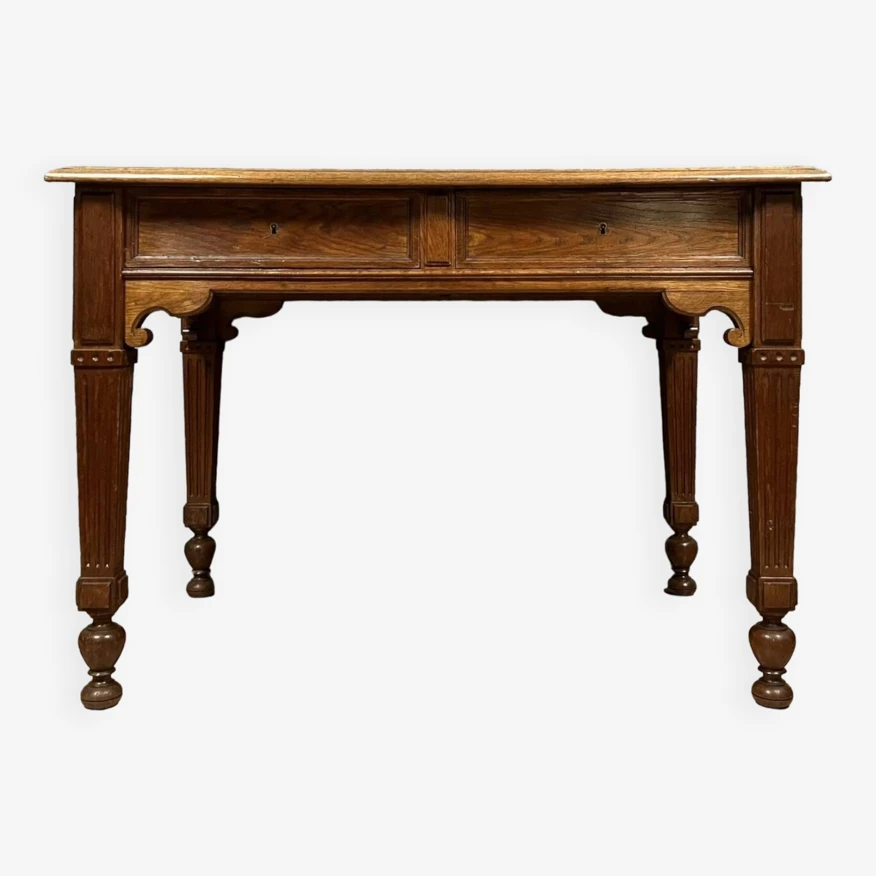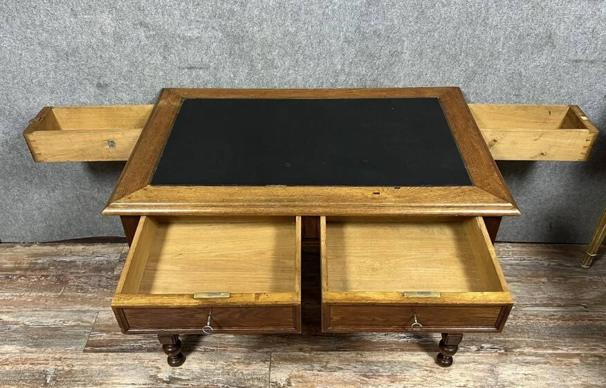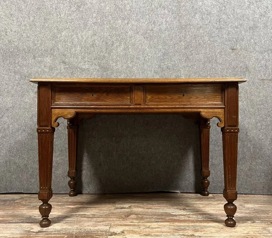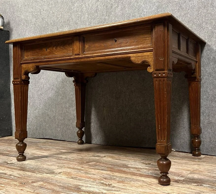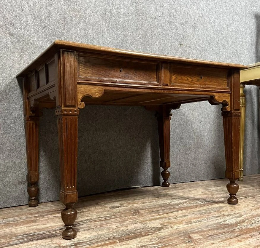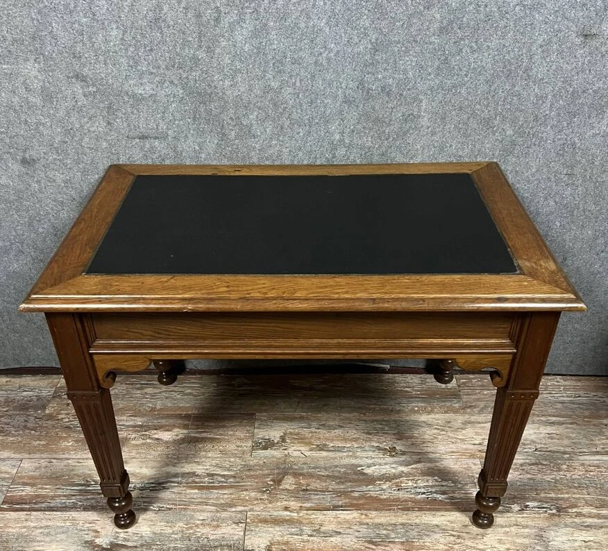 Superb louis XVI style solid oak center desk with secret drawers circa 1850 leather worktop opens with 4 drawers, two of which are hidden on the sides, fluted feet h78 X 112 X 72.