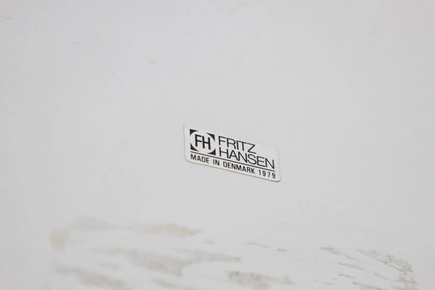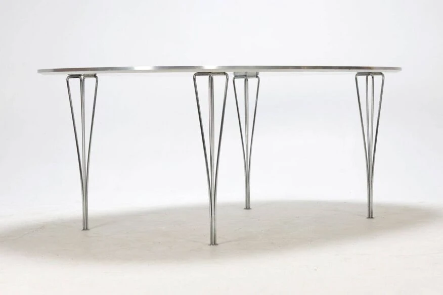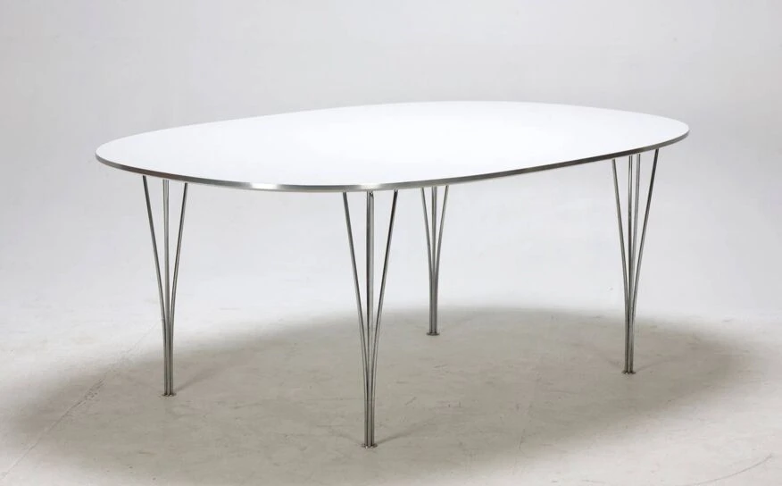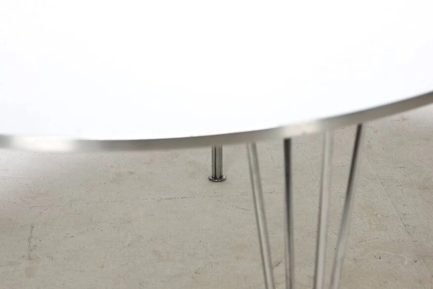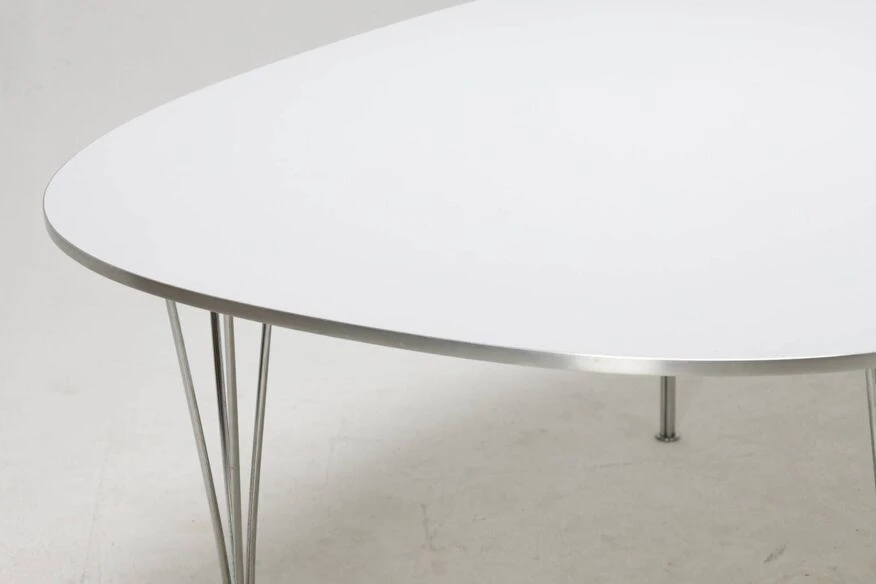 Superellipse table designed by piet hein, bruno mathsson and arne jacobsen published by fritz hansen in 1979 white melamine top with anodized aluminum edge clip-on chrome aluminum base very good condition despite very slight traces of life.