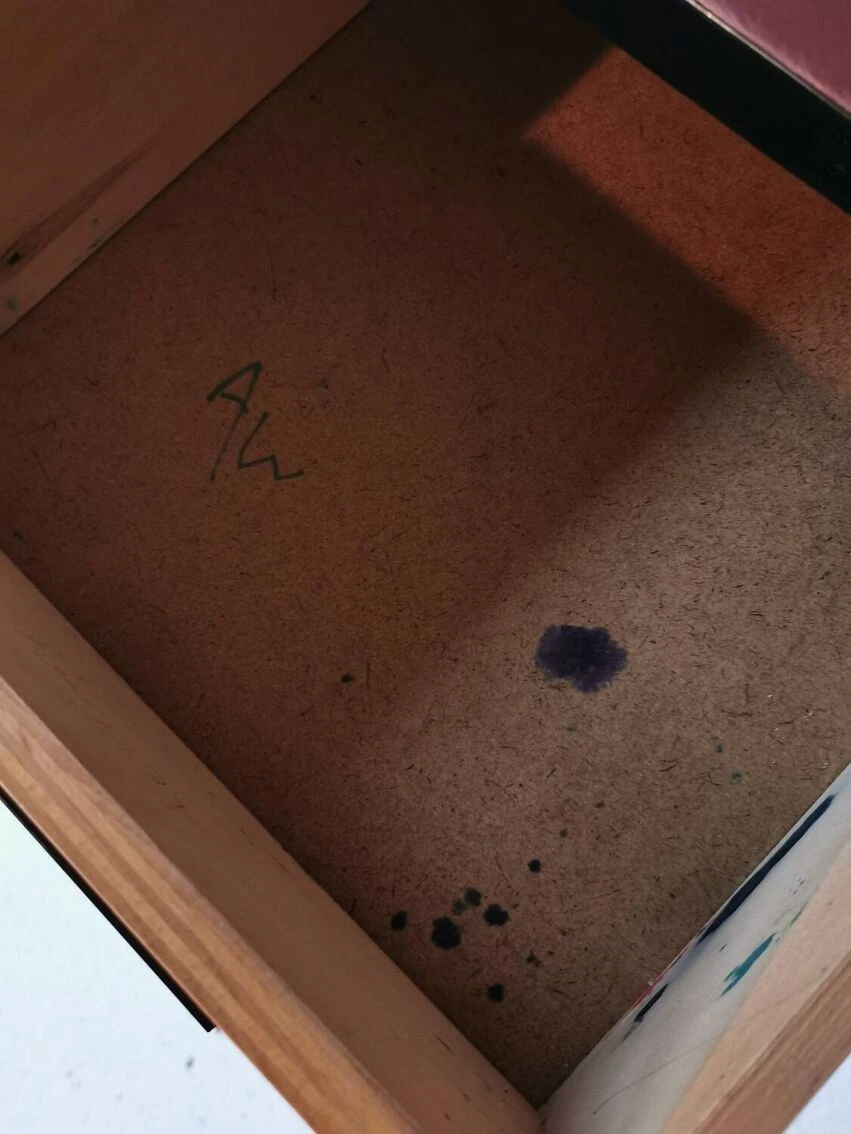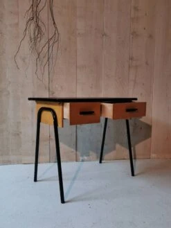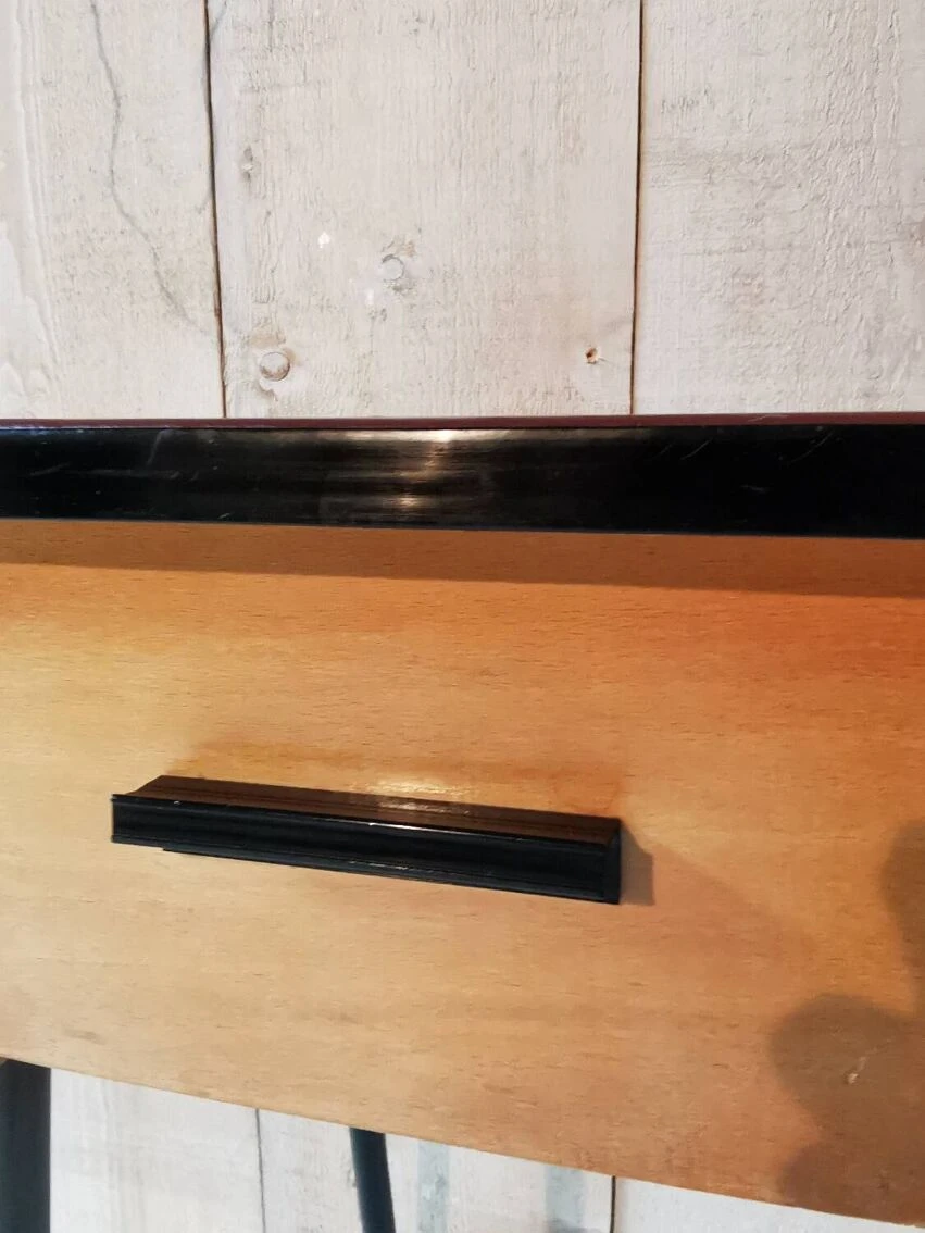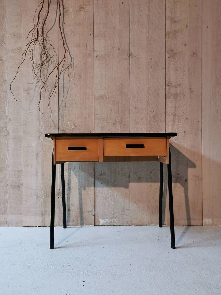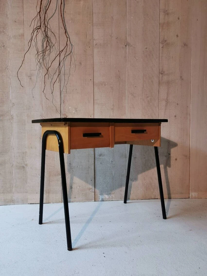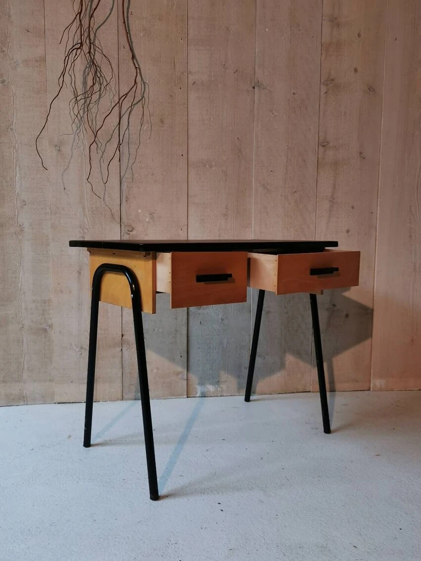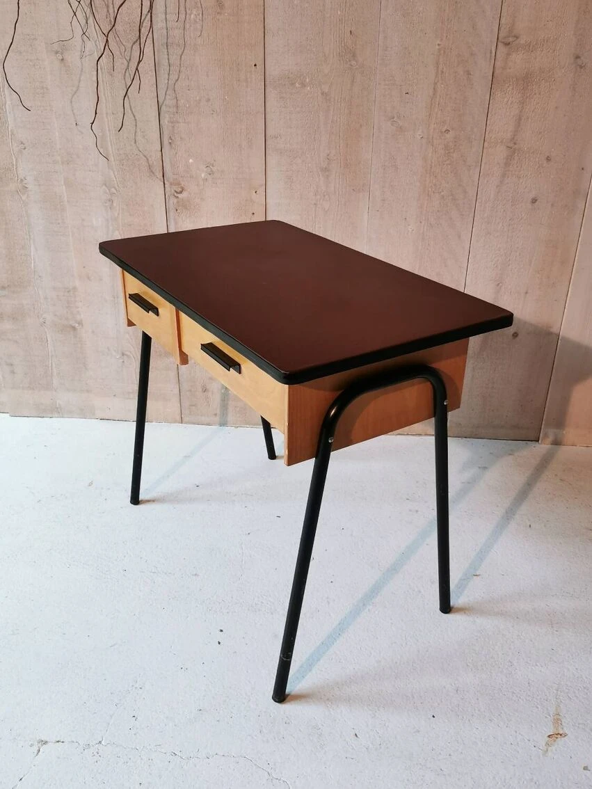 Vintage desk from the 60s, original with its metal legs and burgundy leatherette top.