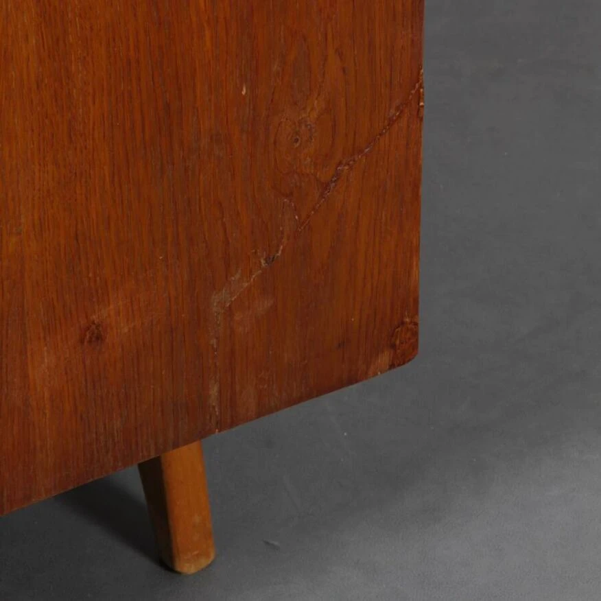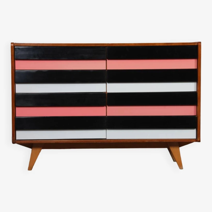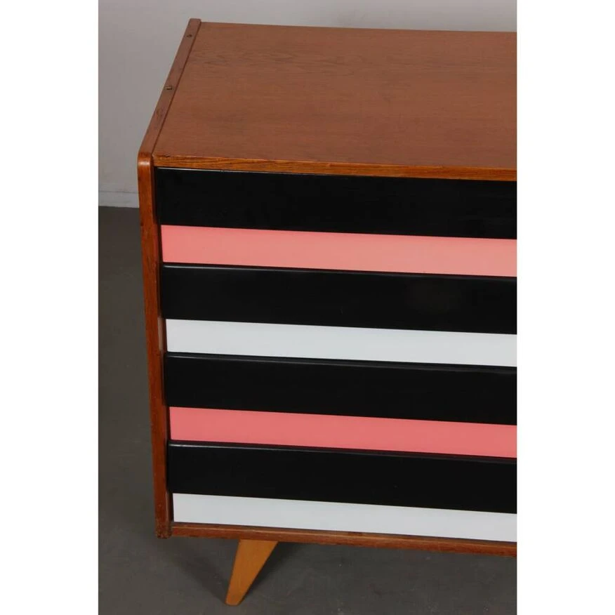 This vintage chest of drawers is designed by Jiri Jiroutek. This is the U-453 model produced around 1960 by Interier Praha in the Czech Republic. The oak box rests on compass feet. This piece of furniture includes a series of eight drawers. This piece of furniture is in good original condition. The board is restored. D1060