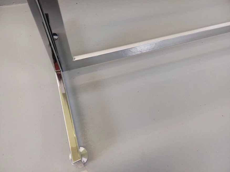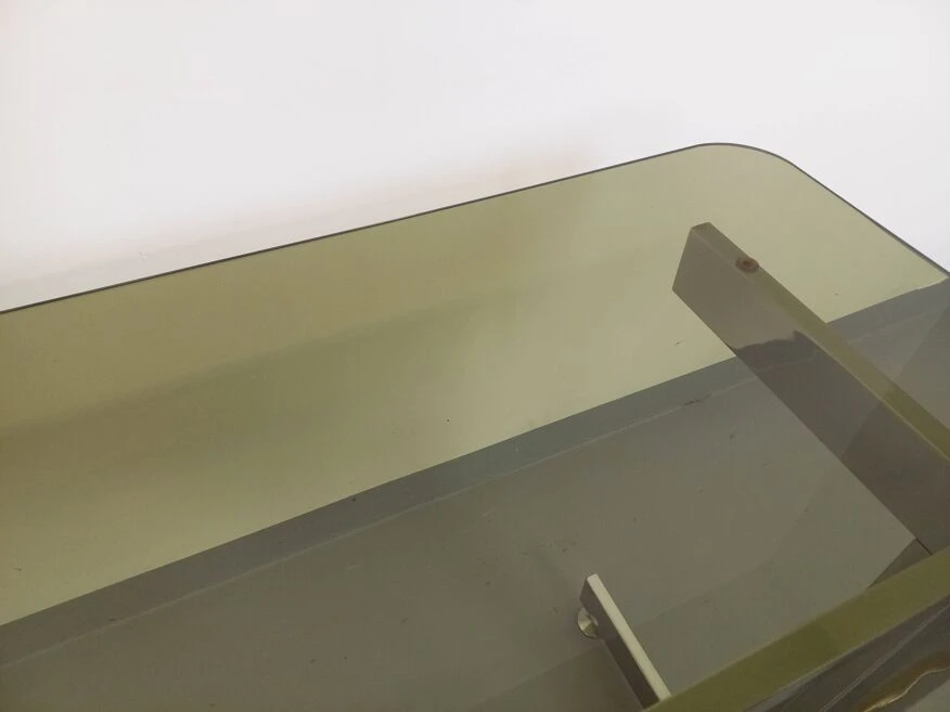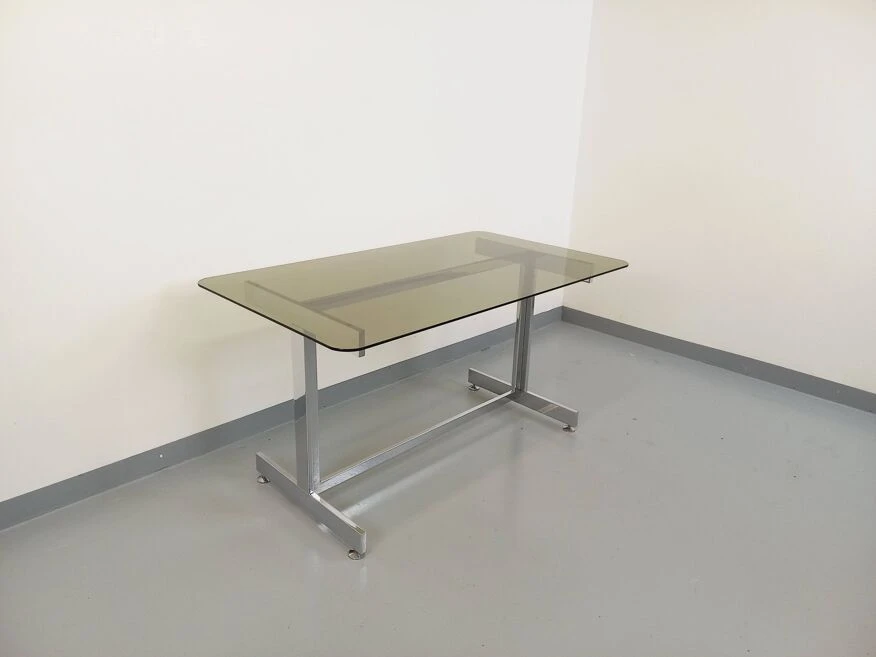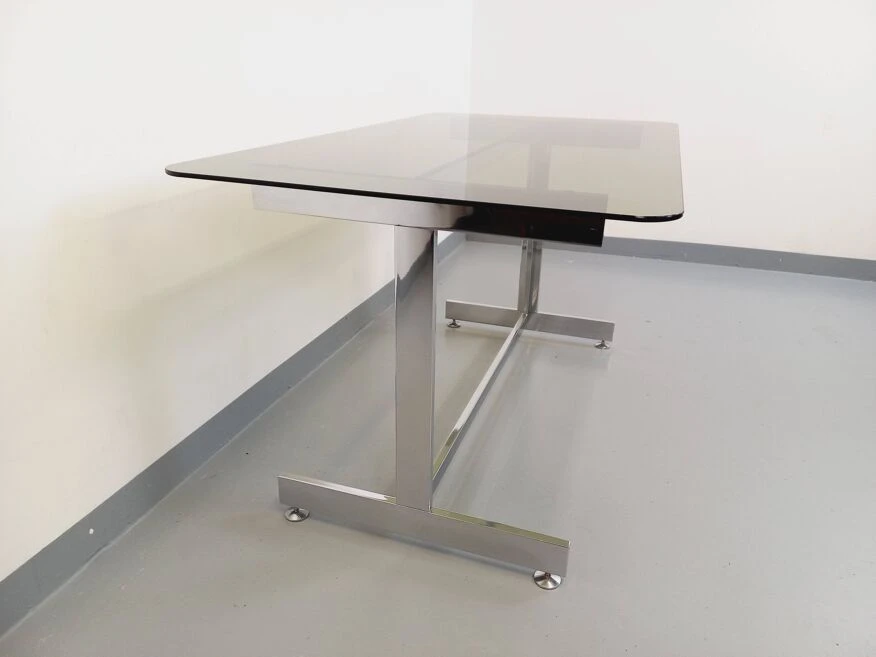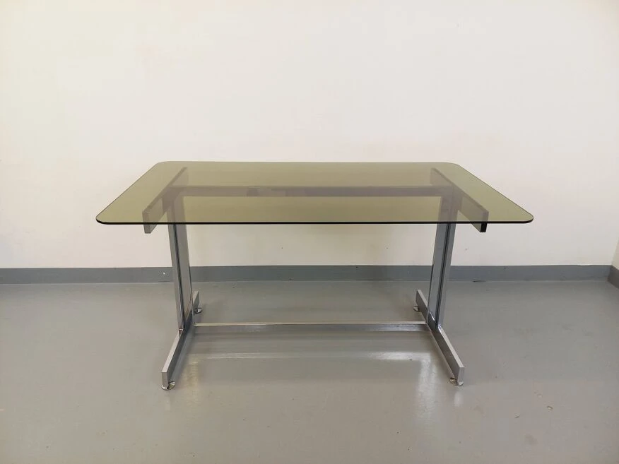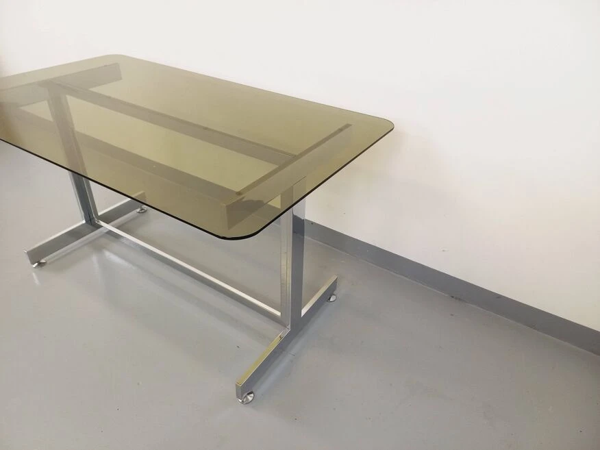 Vintage desk from the 70s, can also be used as a dining table, italian design in the formanova style, rectangular top with rounded corners in smoked glass, chrome-plated metal base, adjustable feet to adjust to the floor, very good general condition, hardly any micro-scratches from use on the tray, chrome in very good condition.