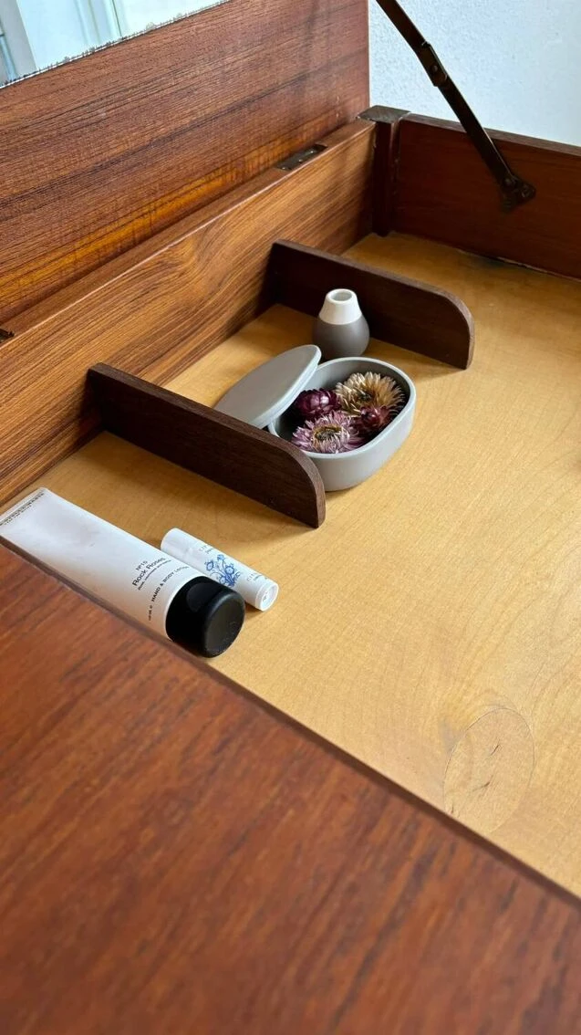 Half of the top has a flap, which when you lift it, reveals a mirror.