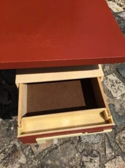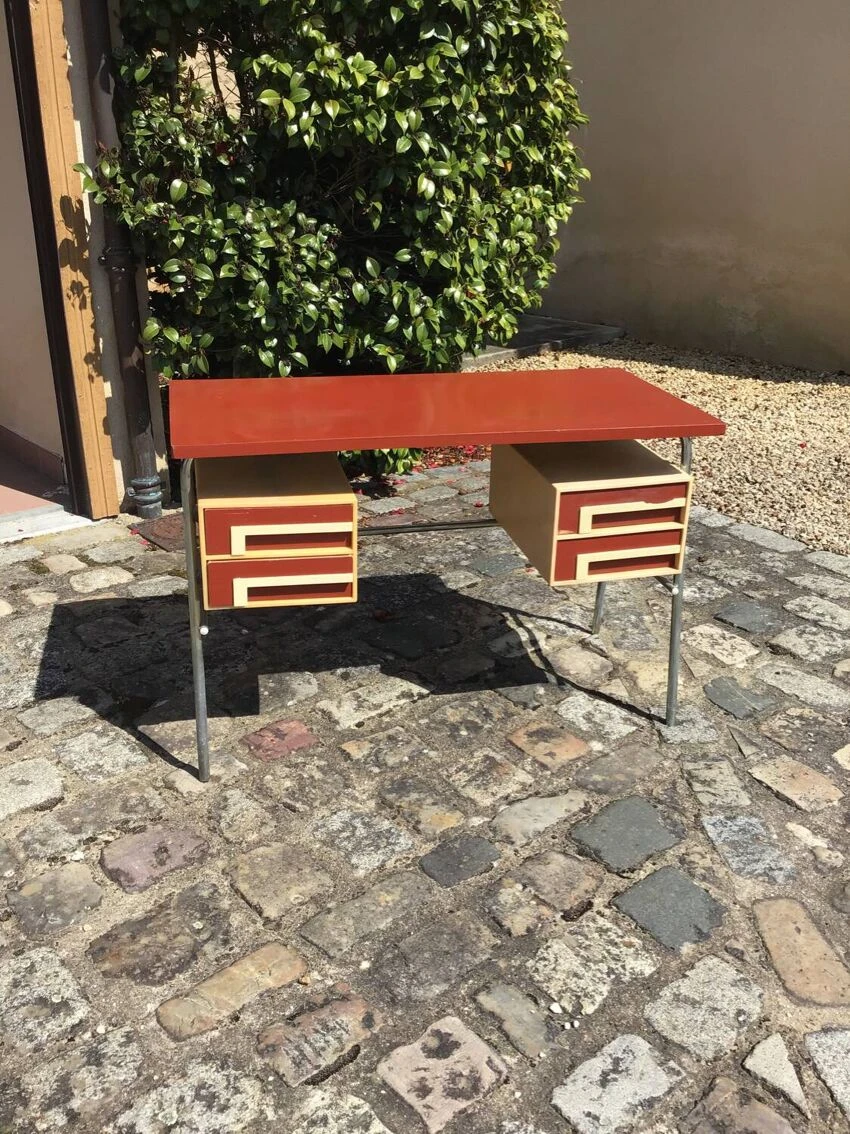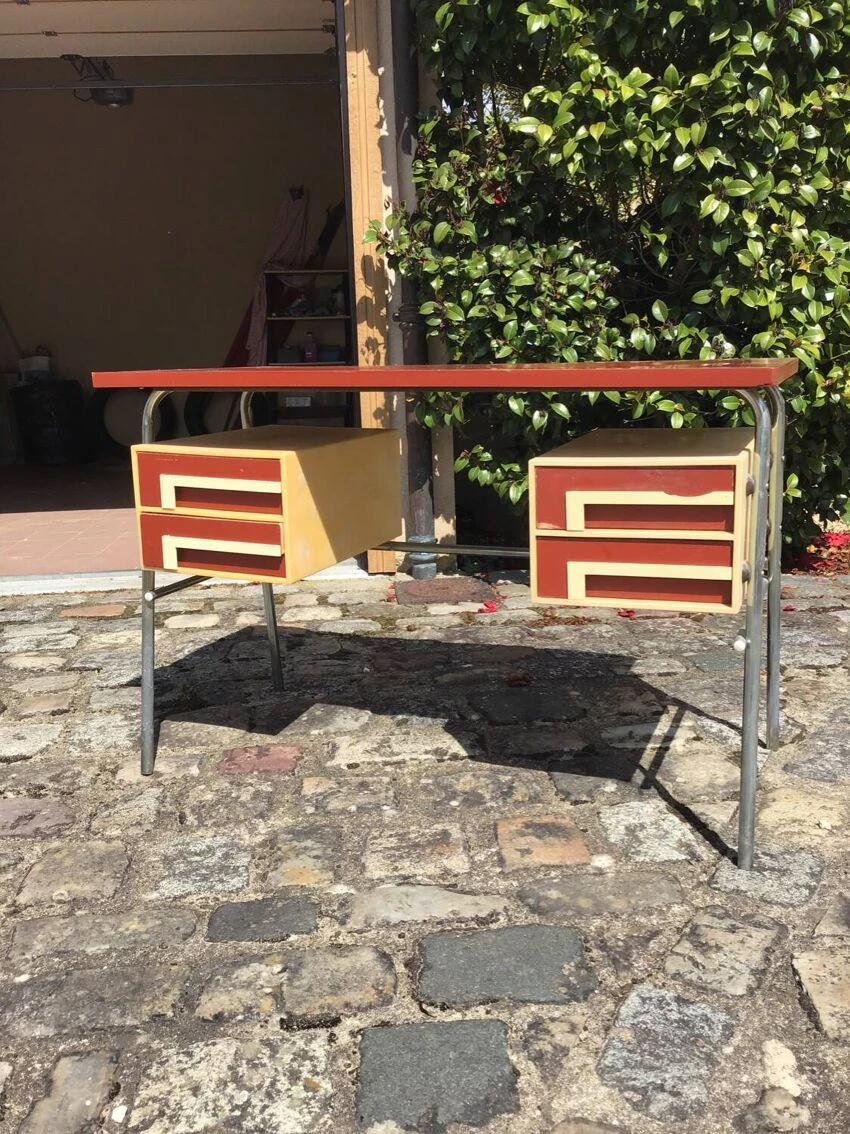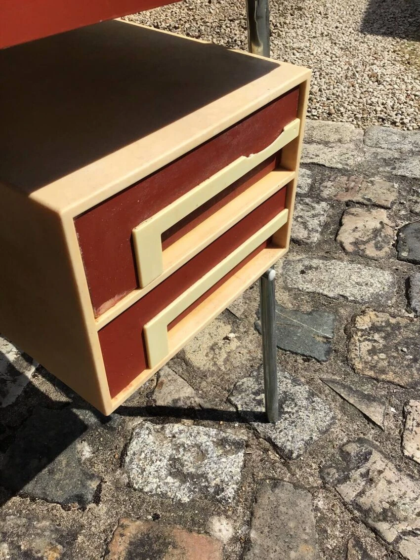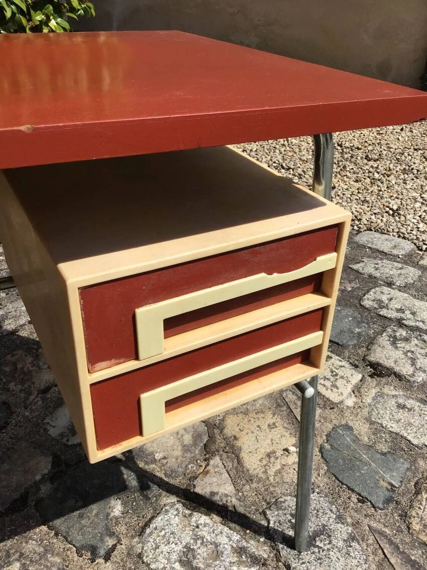 Vintage 60s desk in burgundy painted plywood and two beige fiberglass boxes opening with two drawers each, chrome metal base. Please specify: plastic accident on the drawer on the right, see photo – and normal wear.