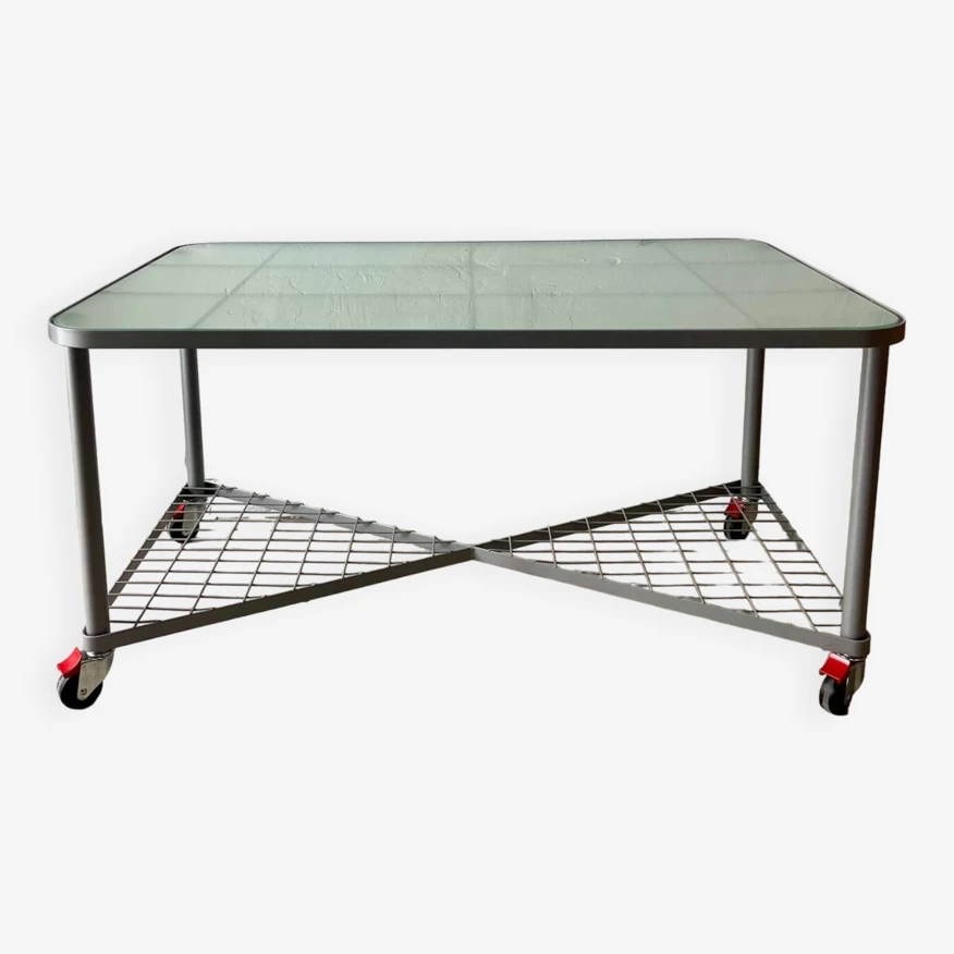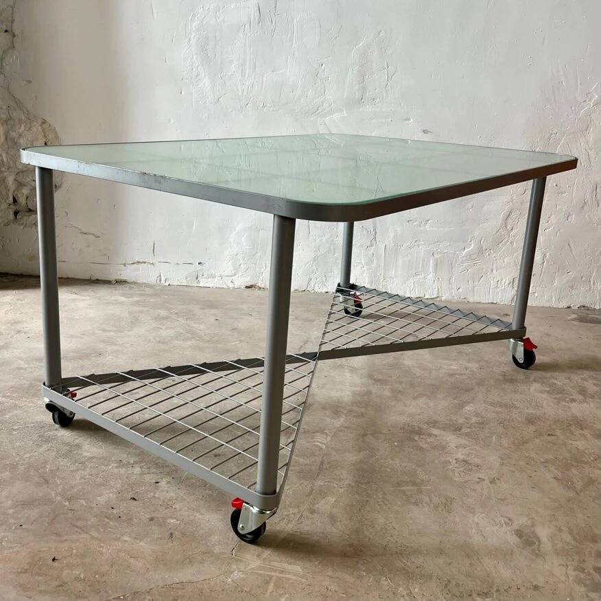 Design by Niels Gammelgaard for Ikea (2000) Sold with the original instructions. Very easy to assemble and disassemble. The 4 casters (with brakes) make it very easy to move. Wear consistent with age and use. Just a few marks on the frame (see photos) Dimensions: Width = 140cm Depth = 95cm Height = 72cm