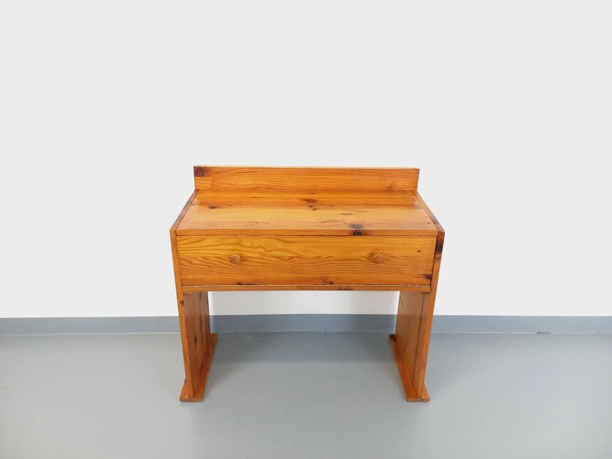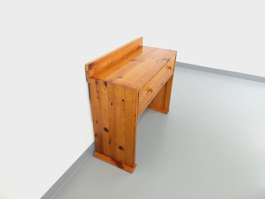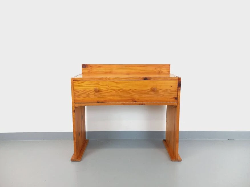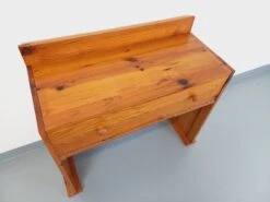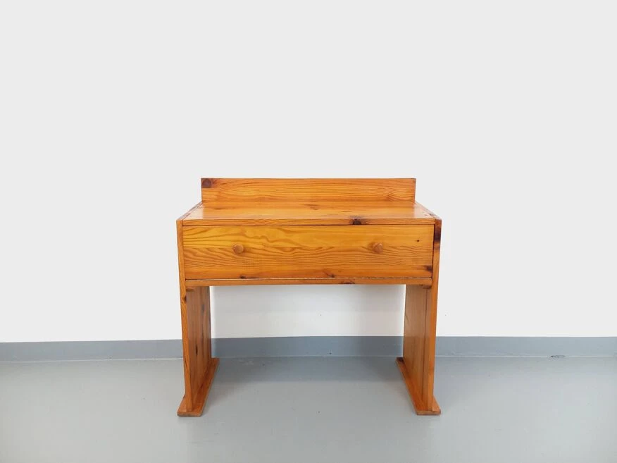 Vintage desk from the 70s and 80s, in pine, with sled legs, friendly mountain chalet style in the style of charlotte perriand, 1 drop-down door under the top with large storage locker.