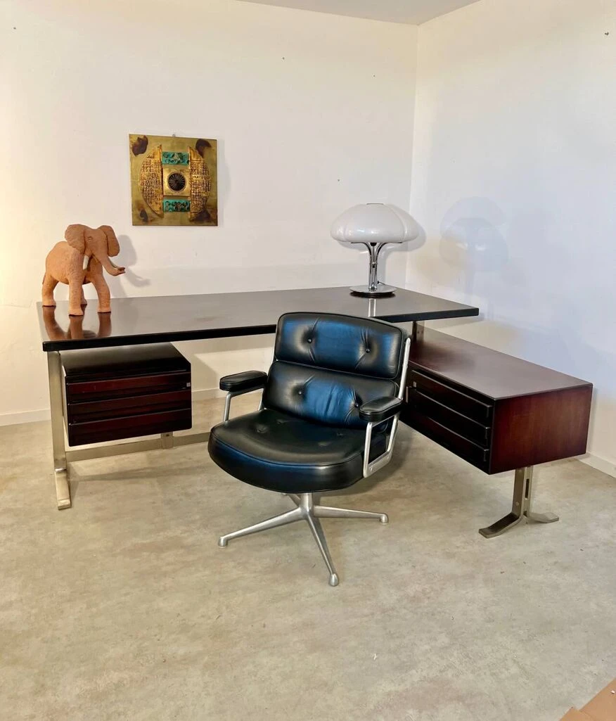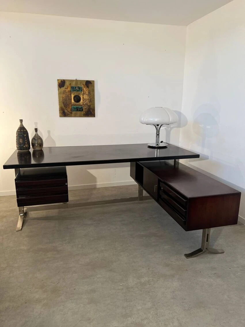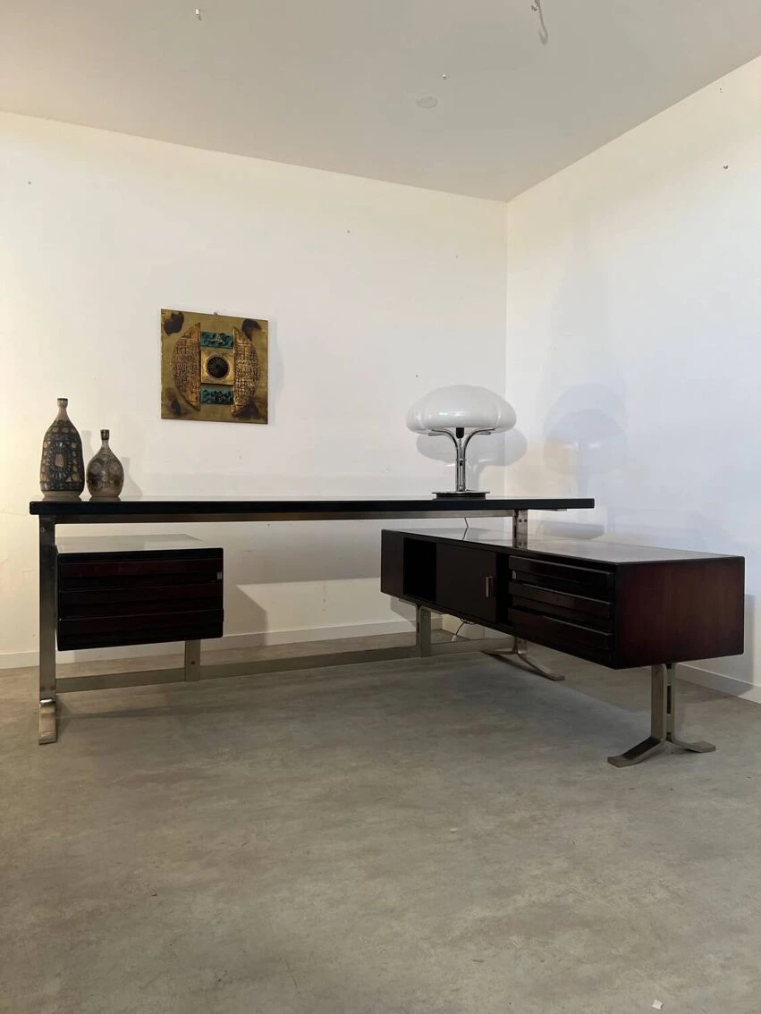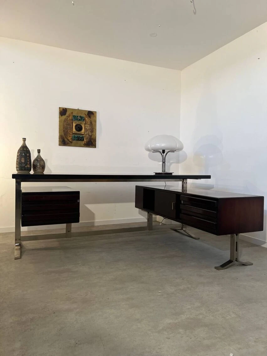 Magnificent and old corner chair desk in rosewood italian design by gianni moscatelli 1970s the desk is composed of a large top, 1 box on the right with drawers, on the left a return row with sorter drawer and sliding door storage at the back of the desk this desk with timeless lines will easily find its place in a vintage or modern space rare model in rosewood the desk is in beautiful condition, shows signs of wear visible in the last photos: metal pitted in places, traces of use on the wood and small impact on a specific area on the board but presents very well!