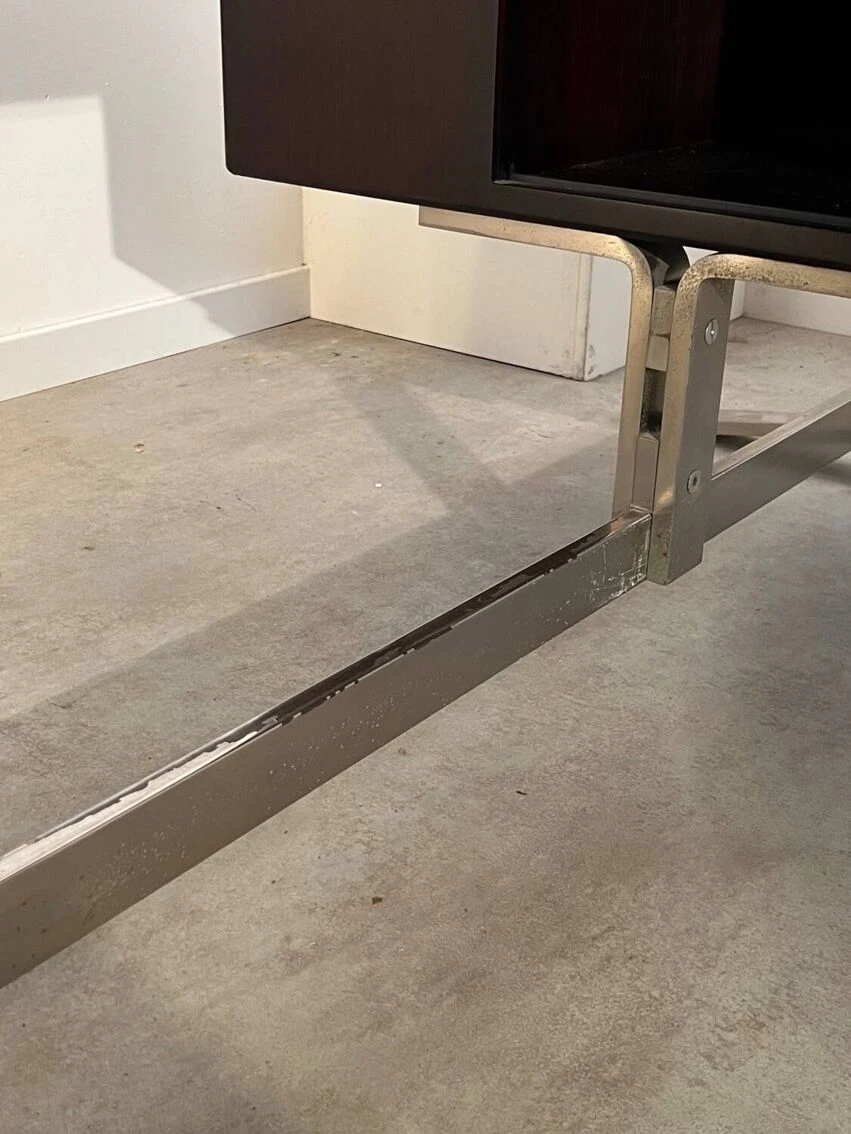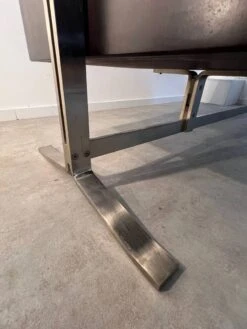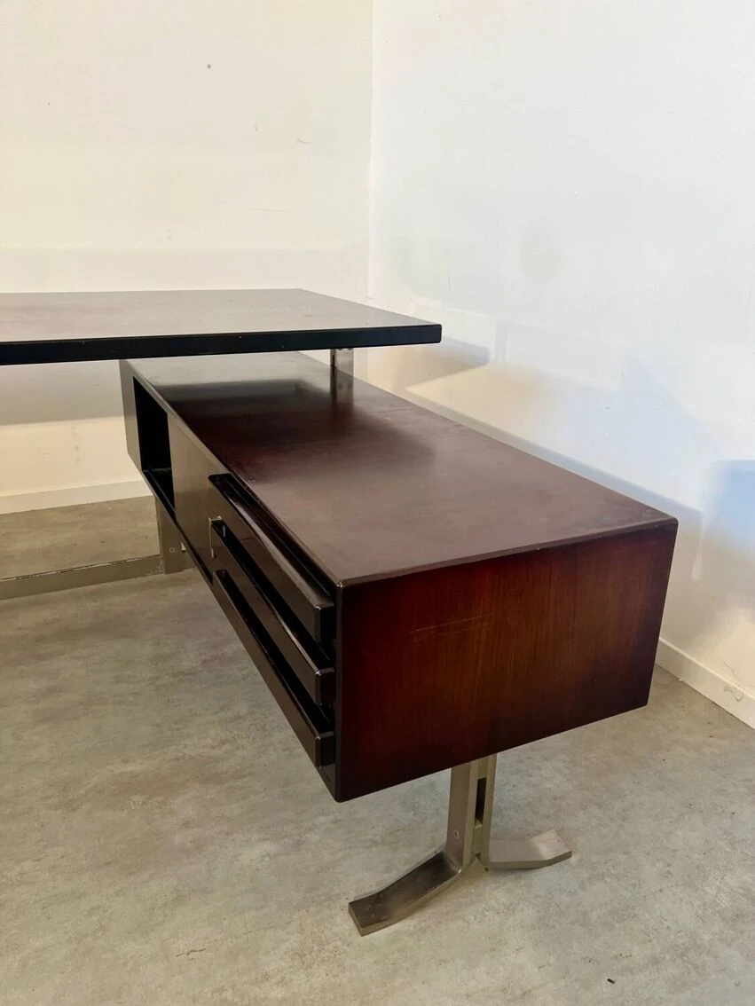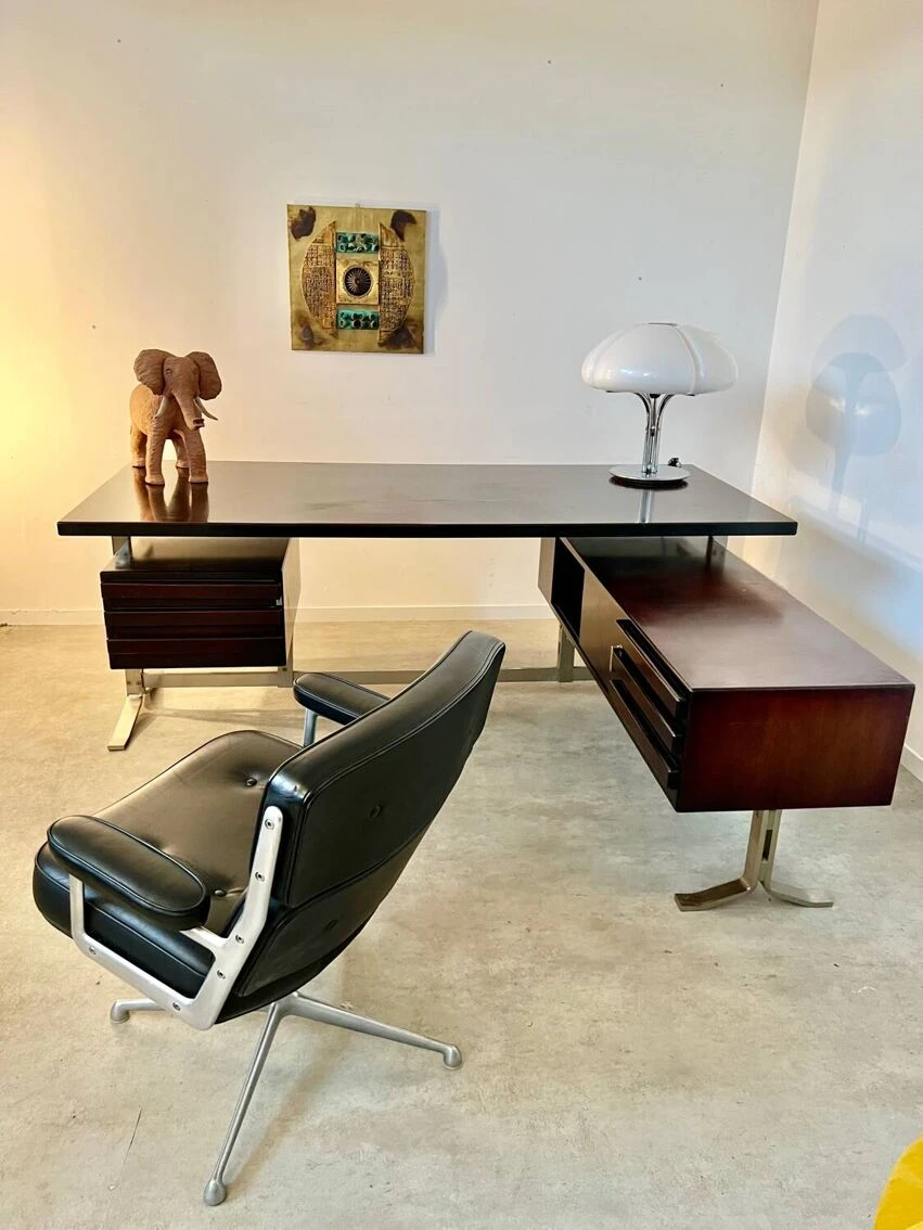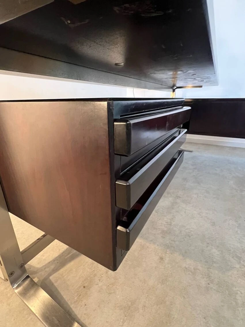 Magnificent and old corner chair desk in rosewood italian design by gianni moscatelli 1970s the desk is composed of a large top, 1 box on the right with drawers, on the left a return row with sorter drawer and sliding door storage at the back of the desk this desk with timeless lines will easily find its place in a vintage or modern space rare model in rosewood the desk is in beautiful condition, shows signs of wear visible in the last photos: metal pitted in places, traces of use on the wood and small impact on a specific area on the board but presents very well!