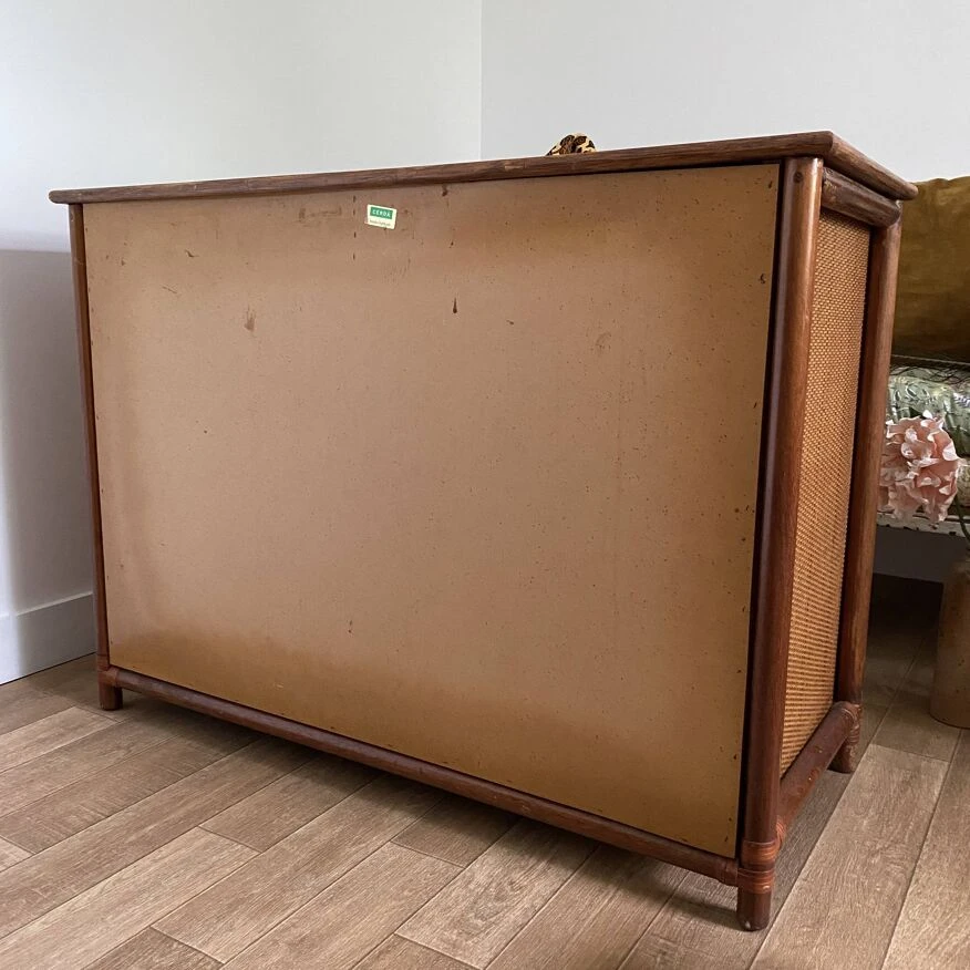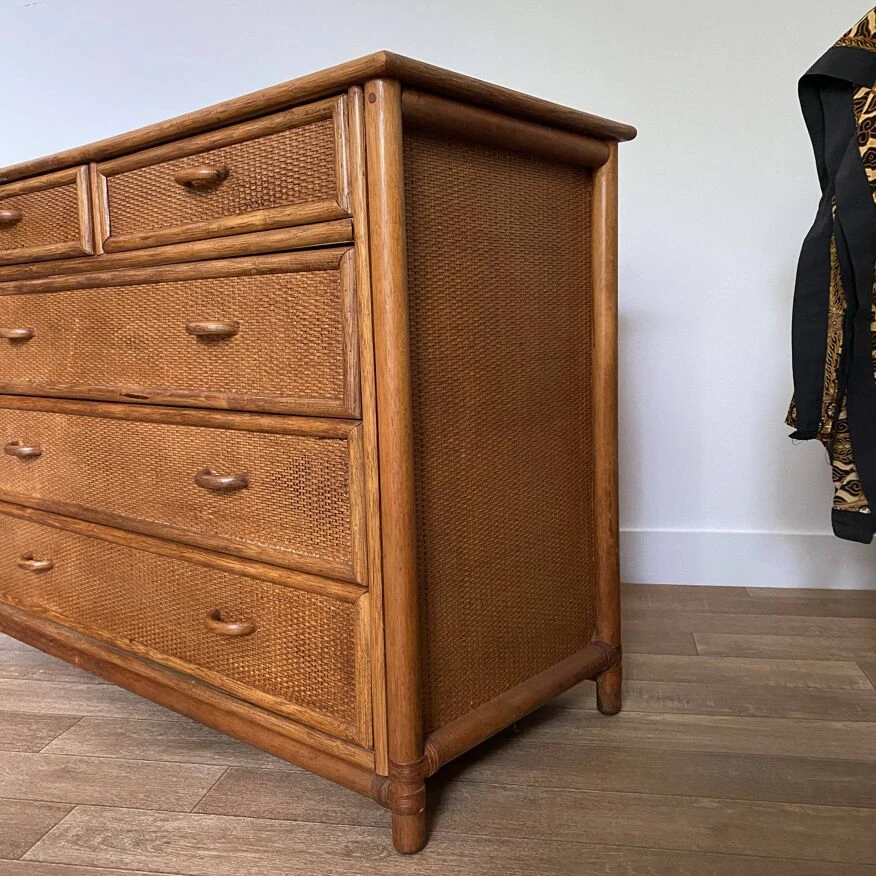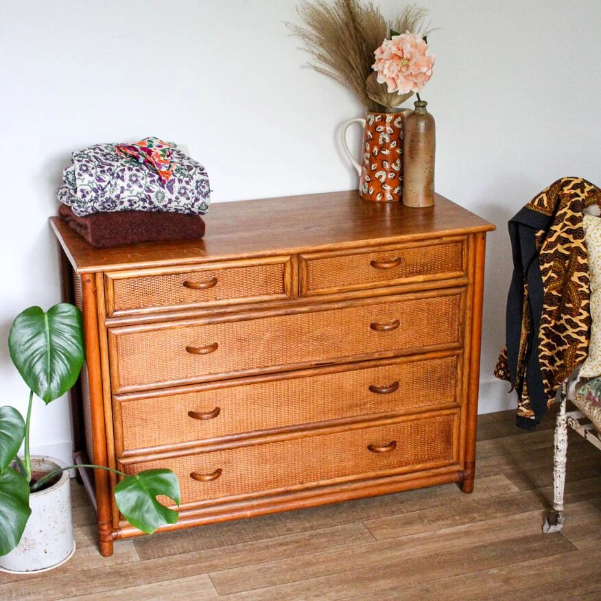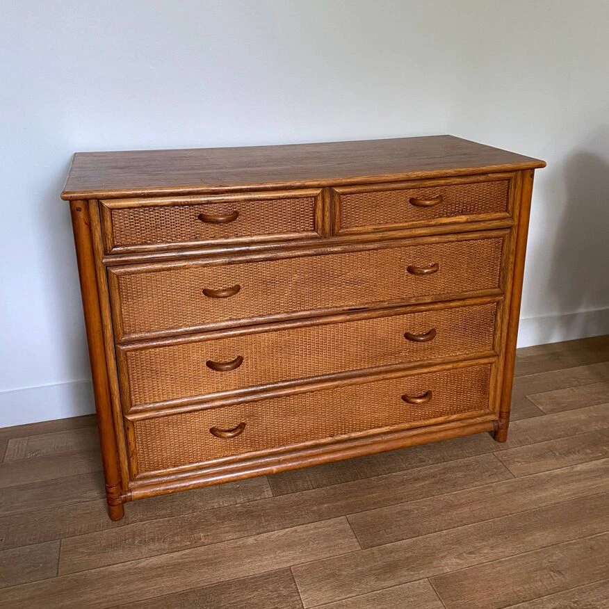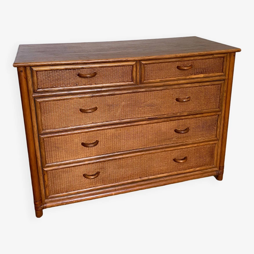 Superb vintage chest of drawers with five drawers in woven rattan on a rattan and particle board structure and base finely decorated with a wood veneer.