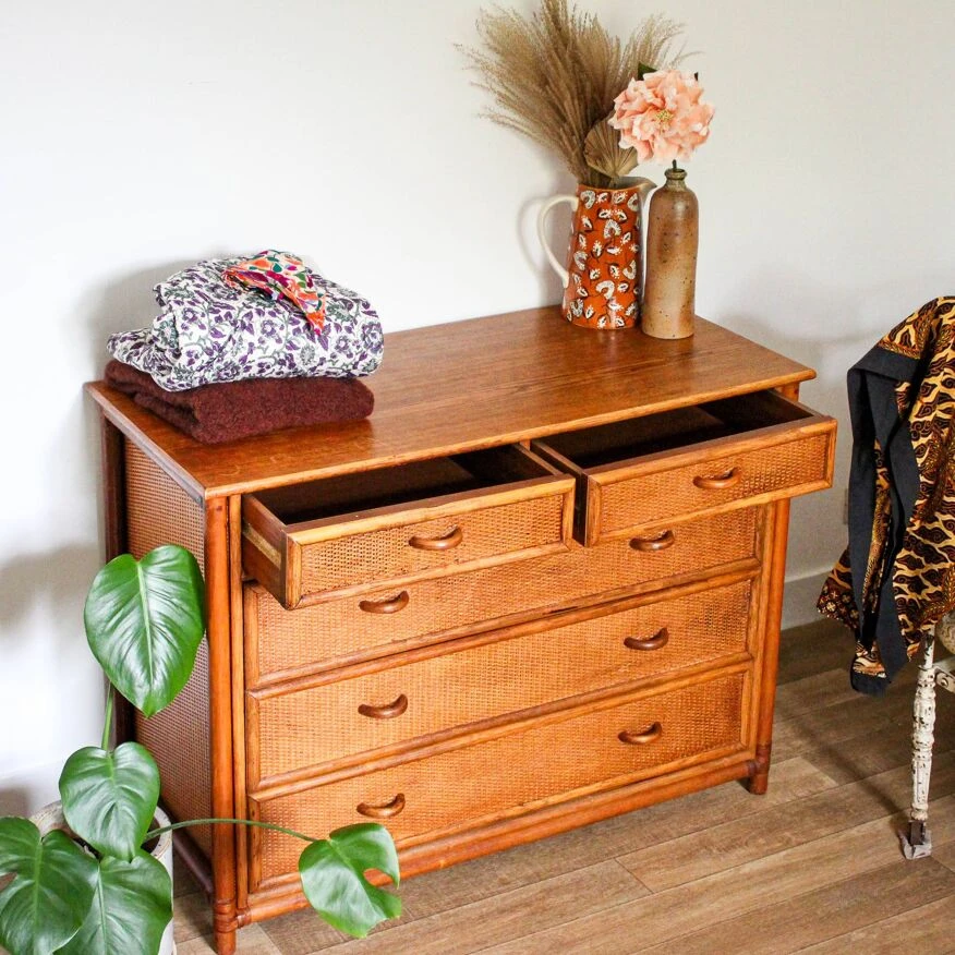 The chest of drawers was completely cleaned before the rattan and veneer were richly nourished.