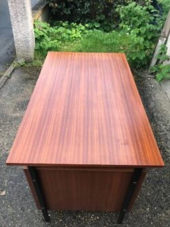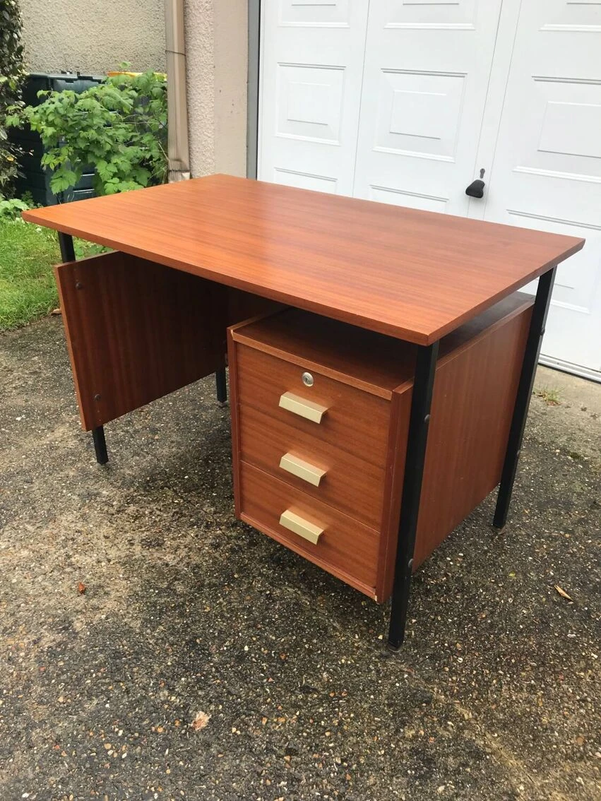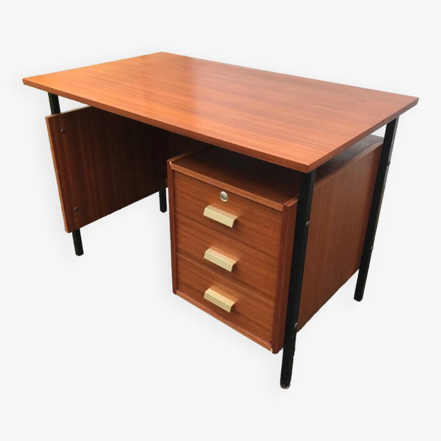 Compact vintage teak desk in metal and wood, brass handles, small traces of use.