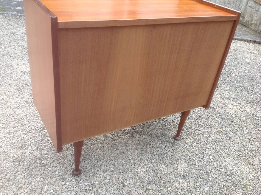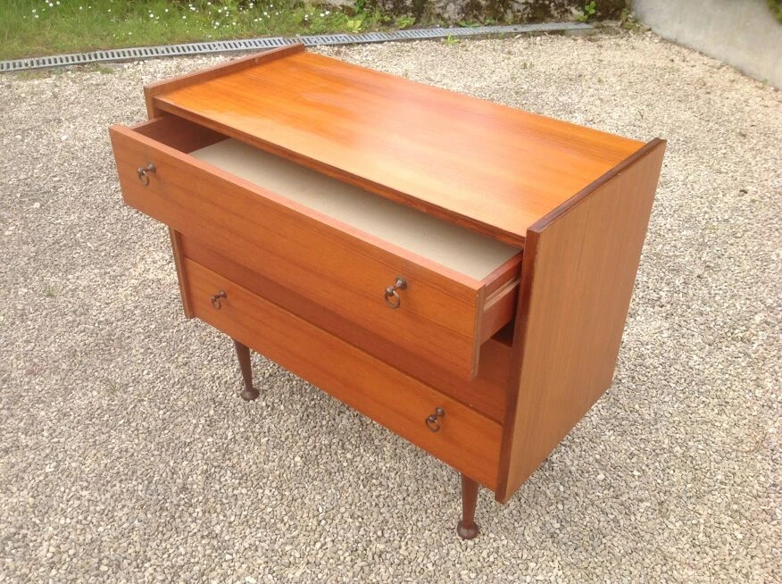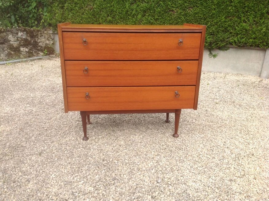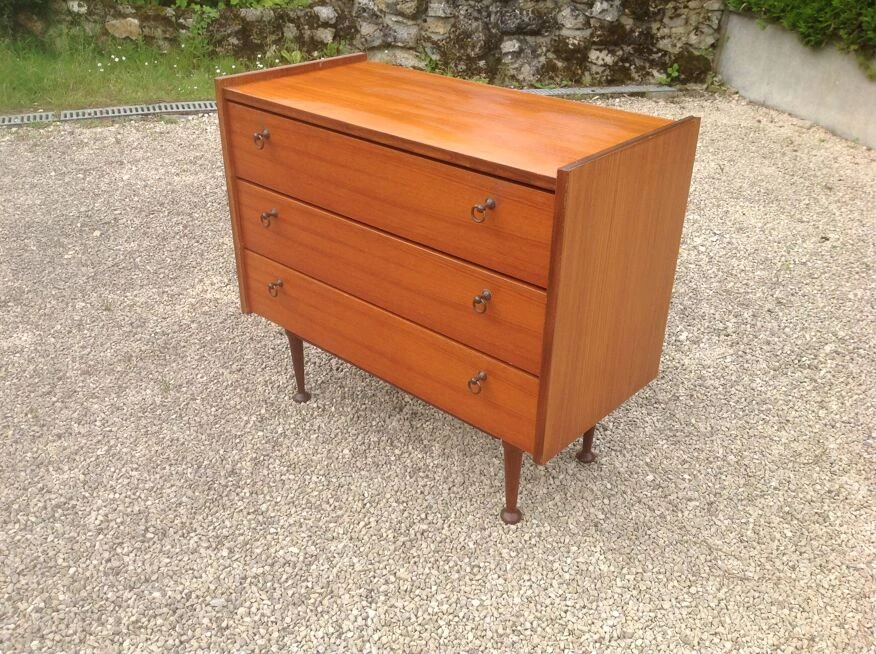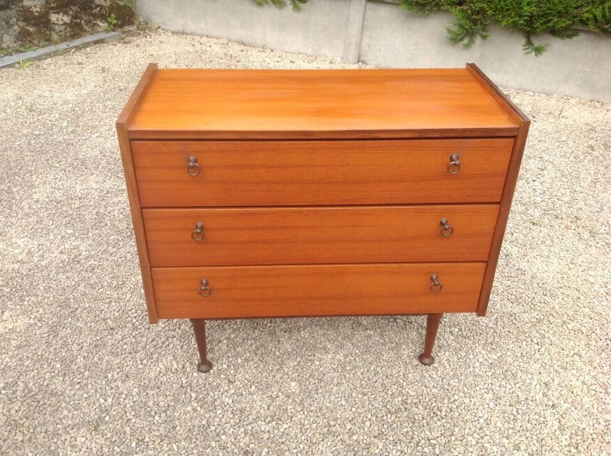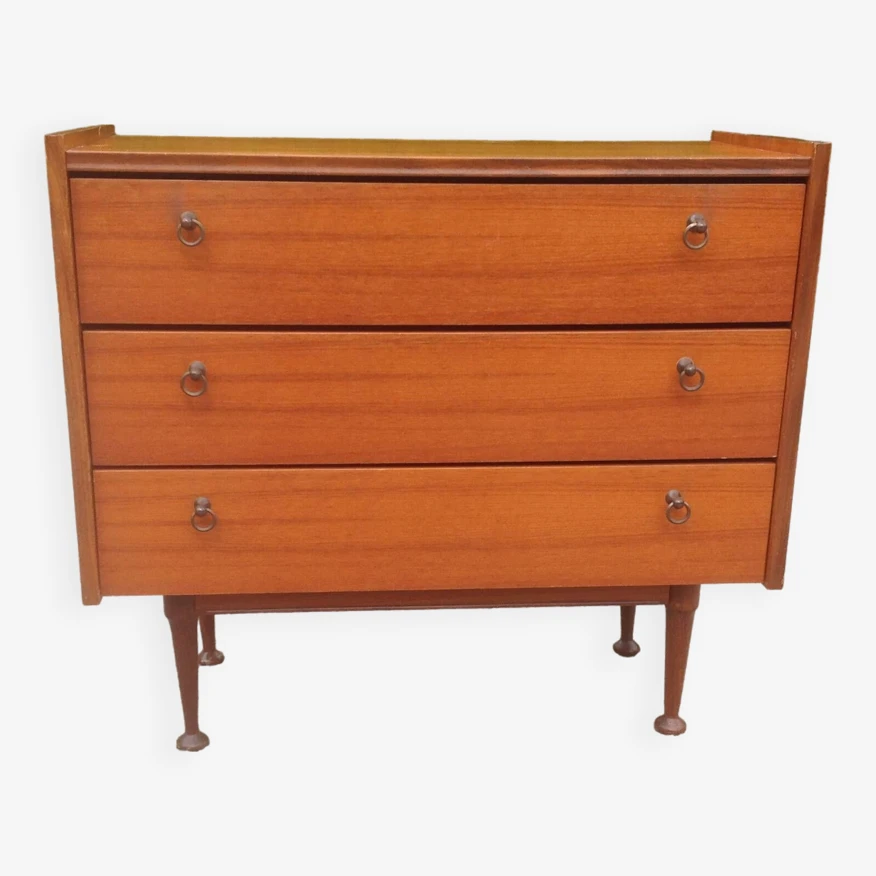 Teak veneer chest of drawers composed of three drawers with small gold metal handles.