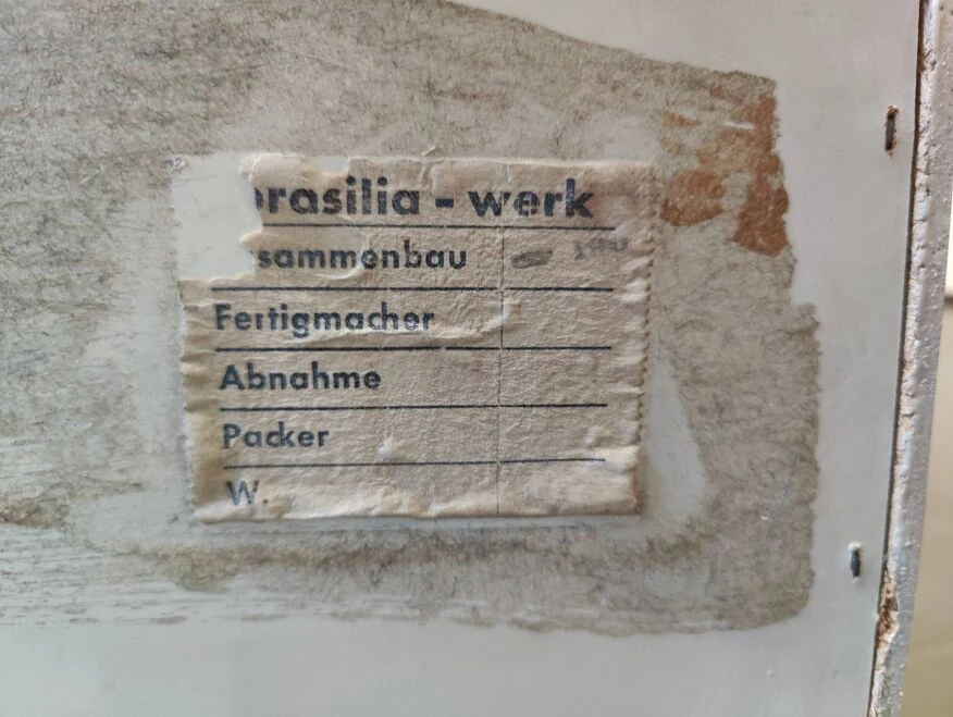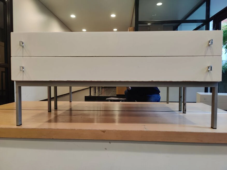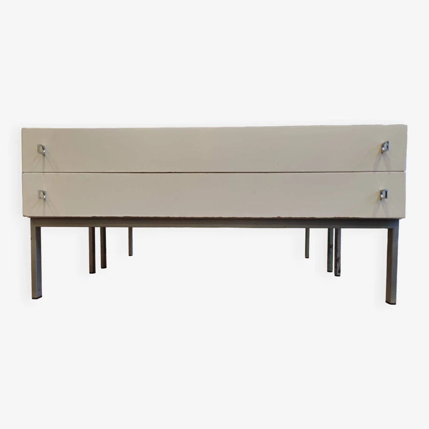 Low chest of drawers with two vintage drawers from the 60s and 70s, scandinavian inspiration, in white melamine wood mounted on a metal base, from the german brand brasilia-werk.