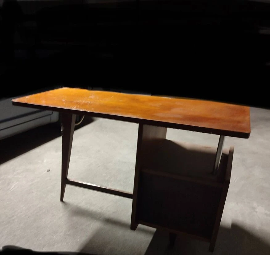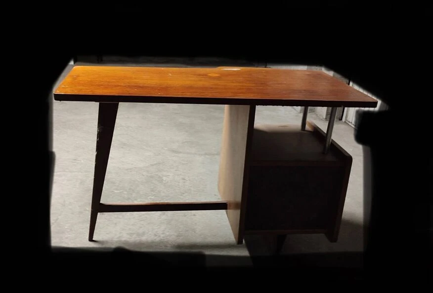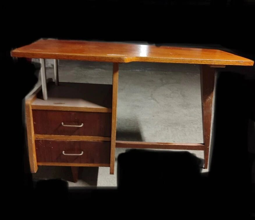 Pretty wooden desk. Two drawers. Tray cut in an original way. Storage space present under tray. Vintage traces of time present. 1960s. Dimensions. 115 long. 77 high. 60/49 width.
