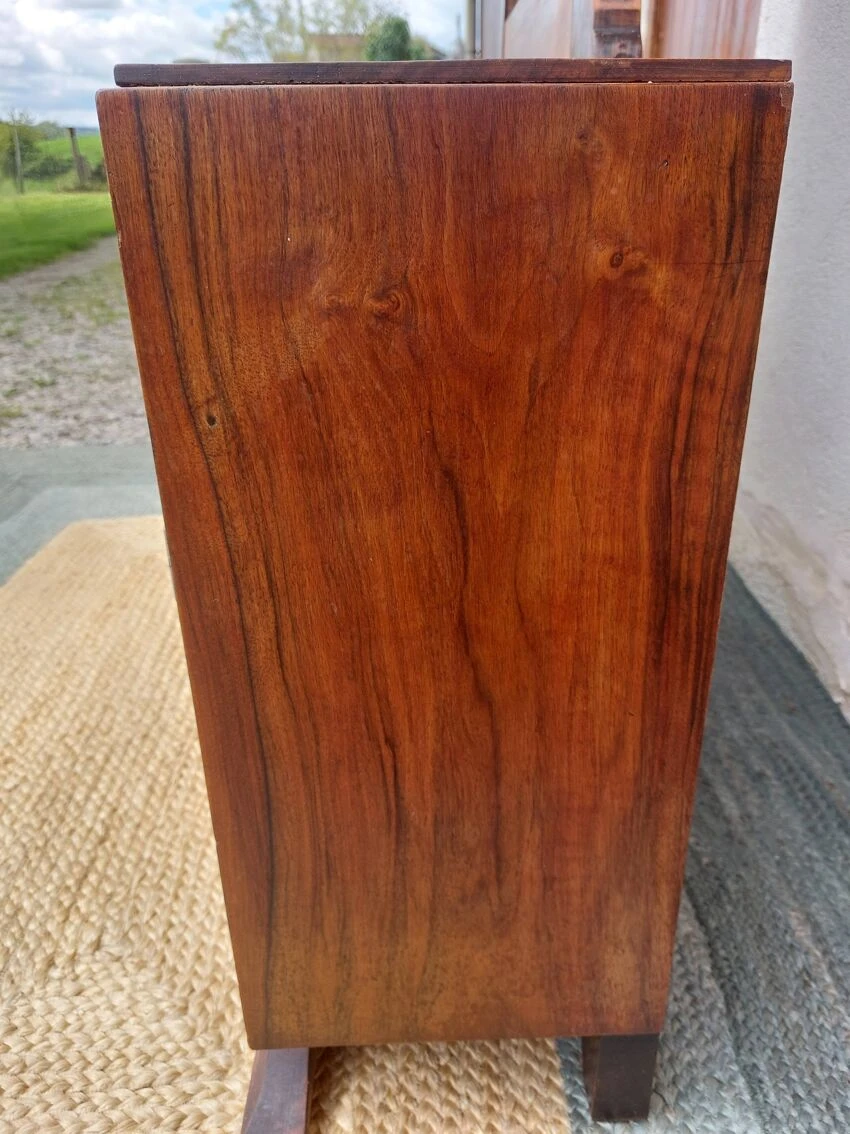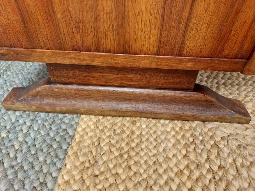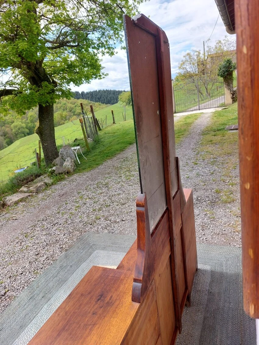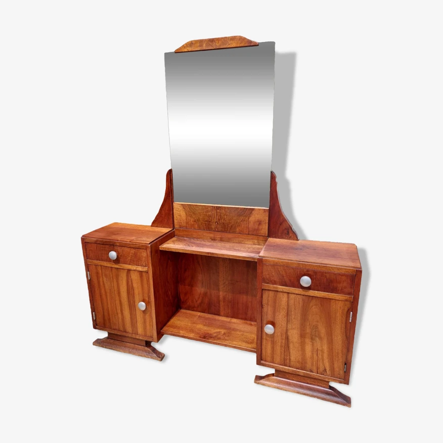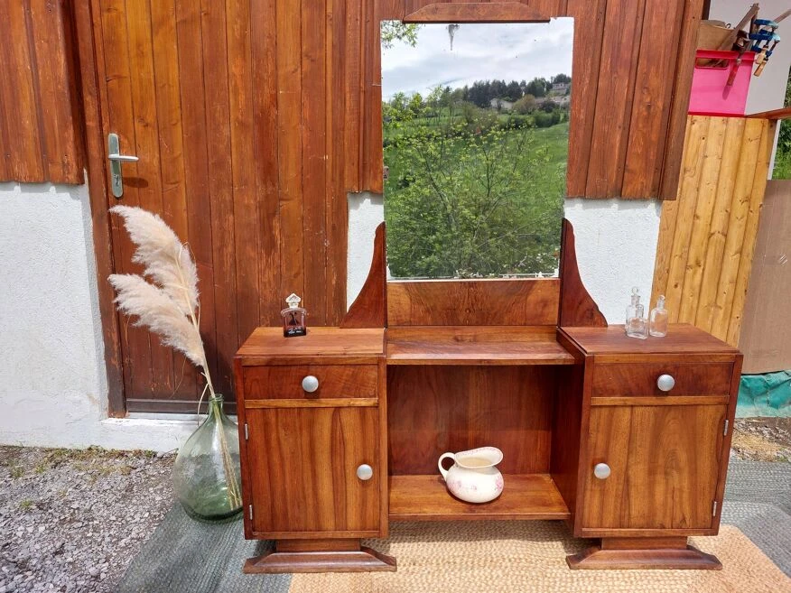 This art deco dressing table will find its place in a bedroom, a bathroom, any relaxation room where you can take time for yourself… pretty wooden furniture that will bring charm to your room. Original handles. For details, see the numerous photos which are an integral part of the description. The mirror has signs of use (see photos), it is removable. The entire piece of furniture was cleaned then nourished with linseed oil. Height of the furniture without the mirror: 68cm.