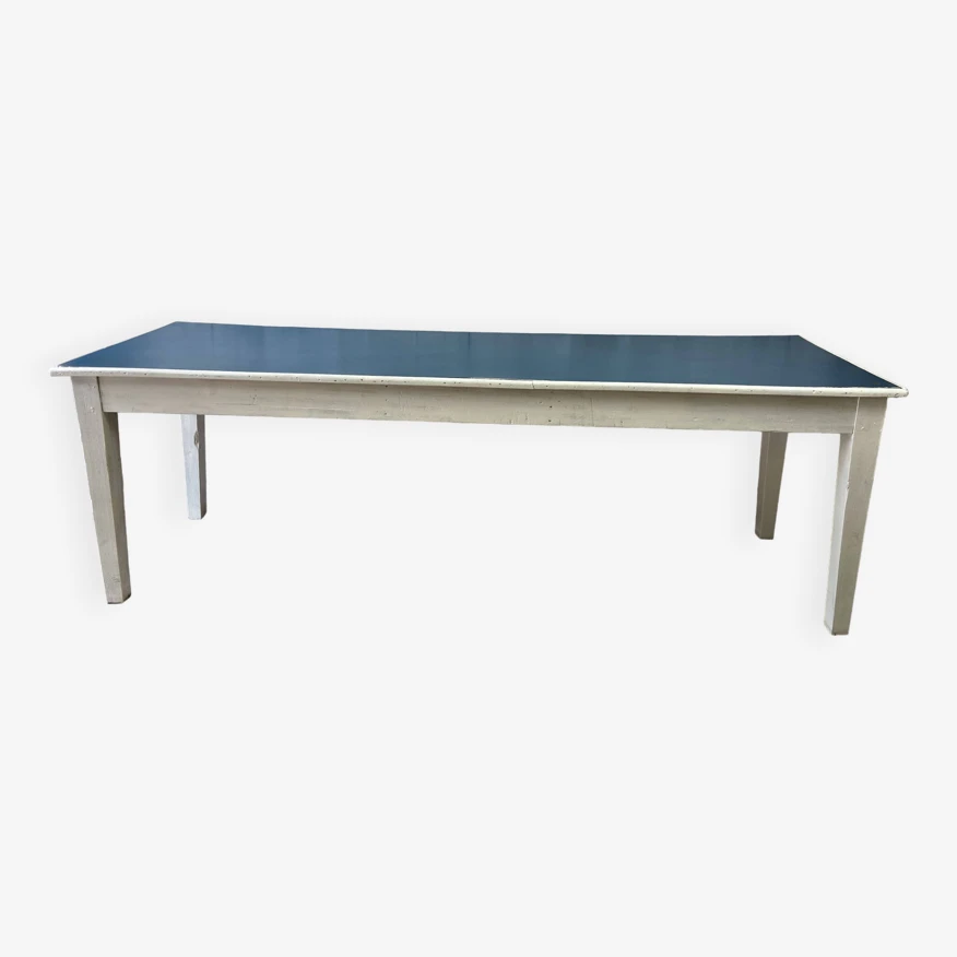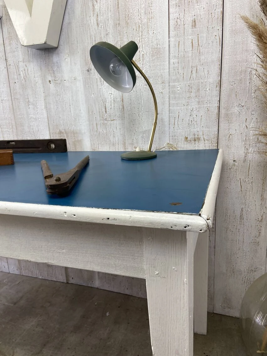The base is in oak and the top in chipboard covered with blue formica (presence of a few small scratches).